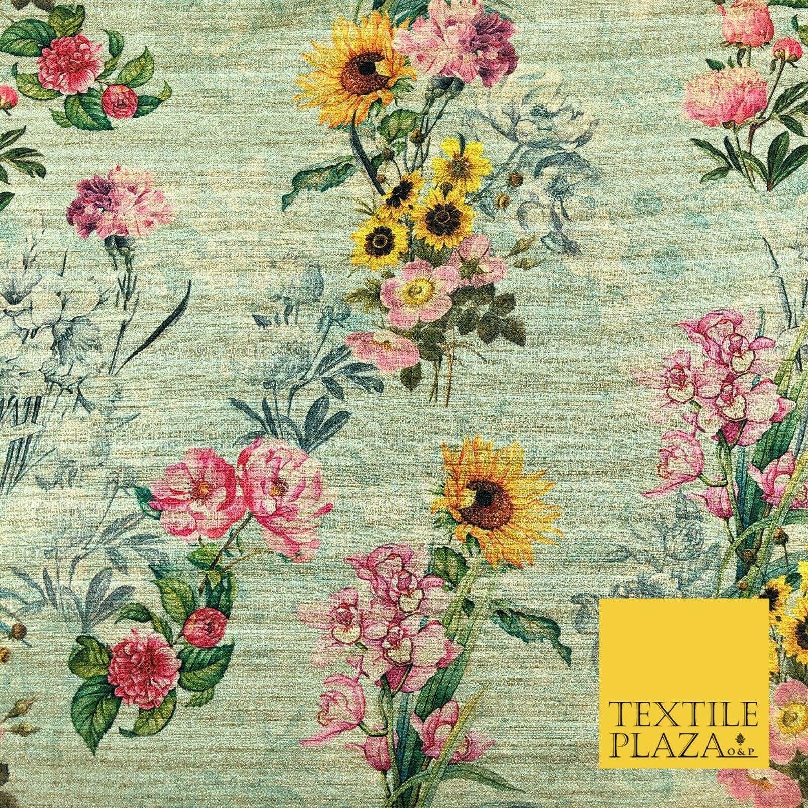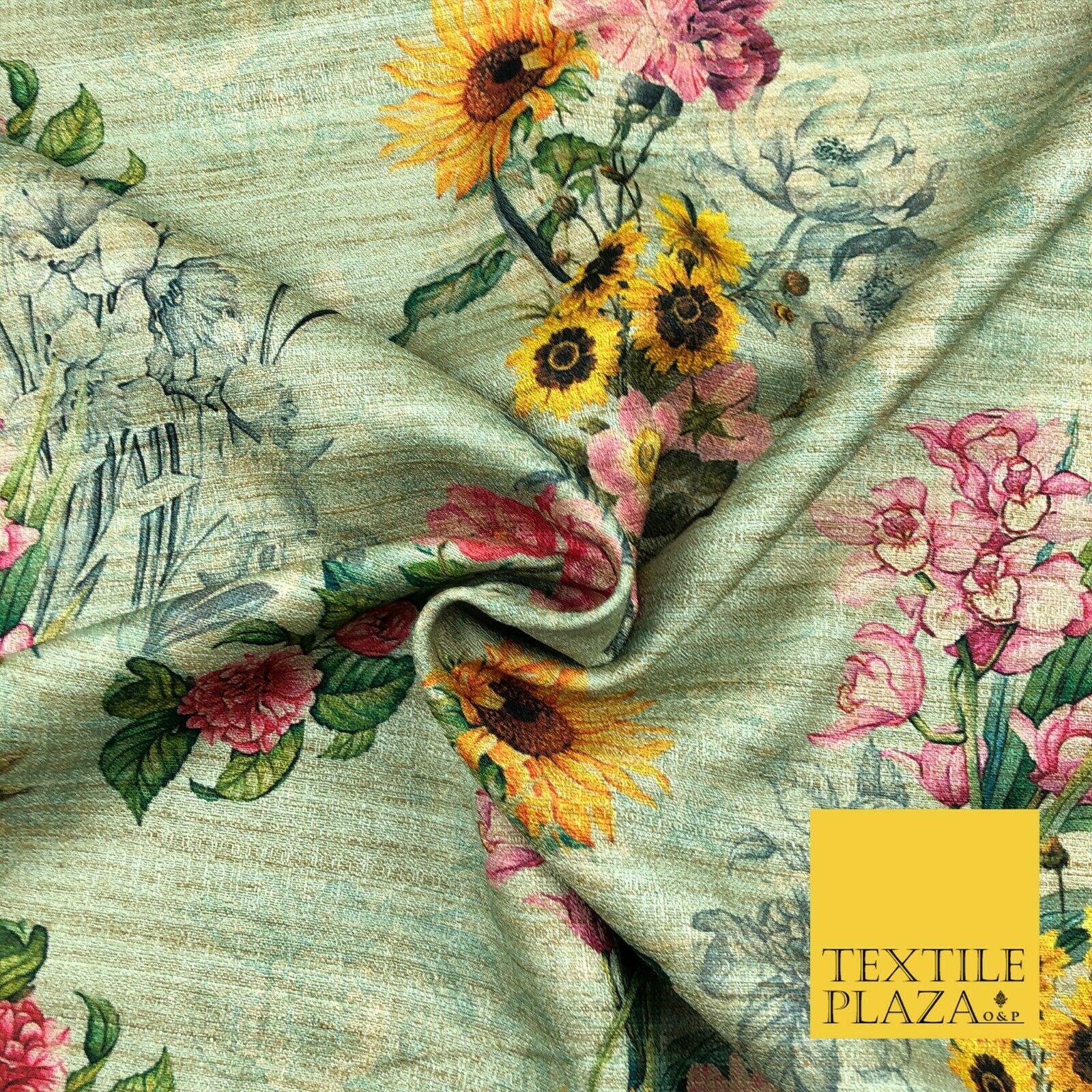 MINT GREEN Sunflower Mix Digital Print Faux Raw Silk Fabric Dress Craft 1467