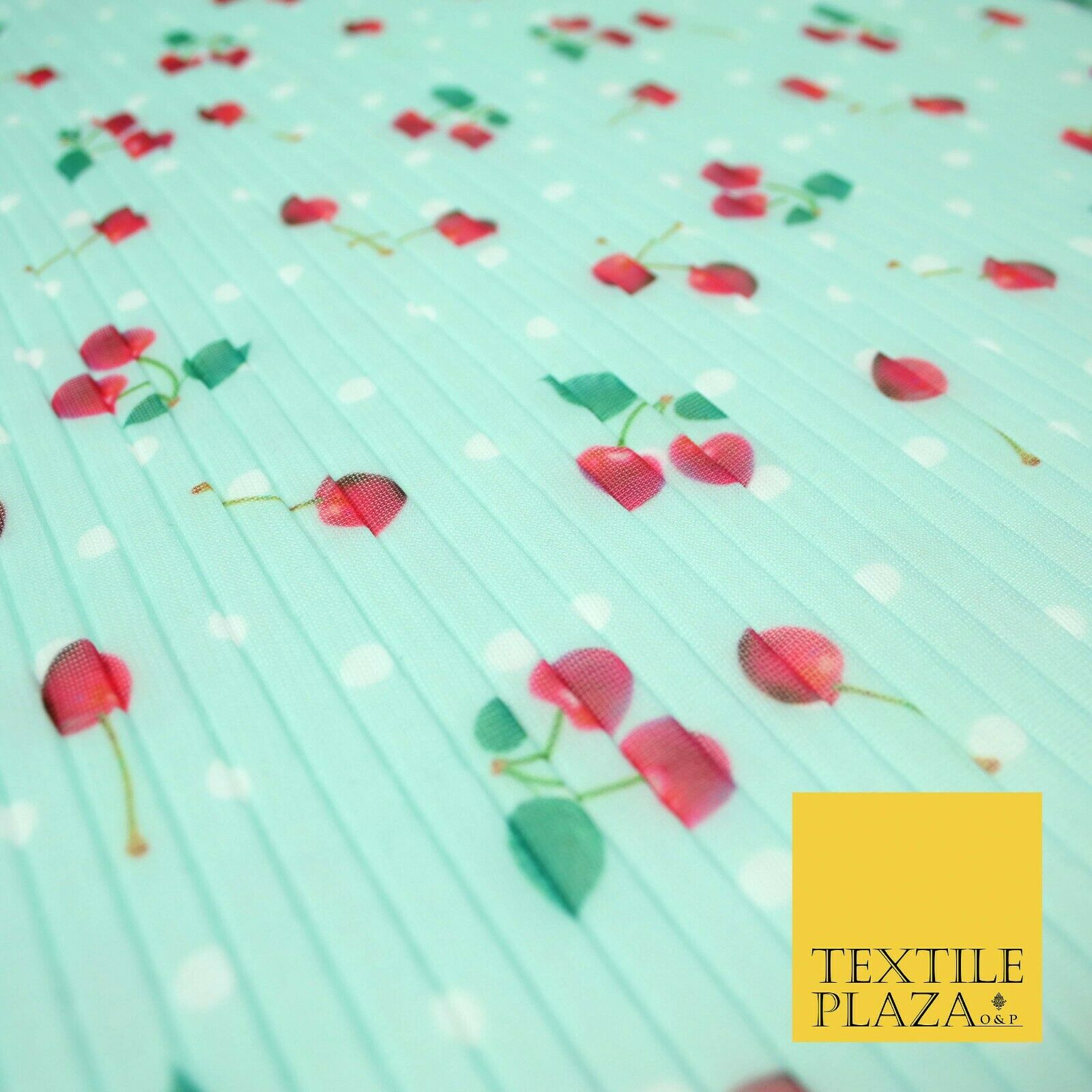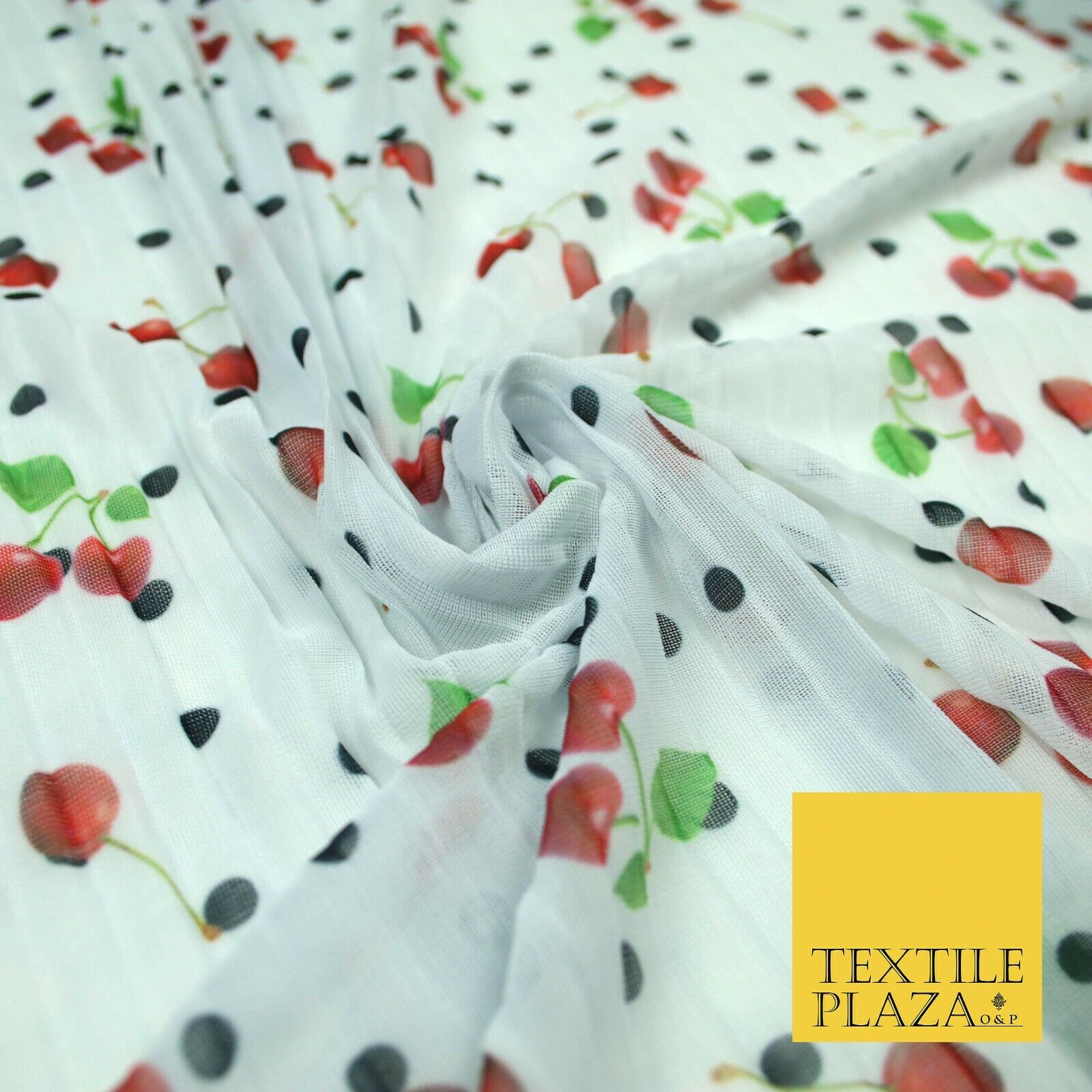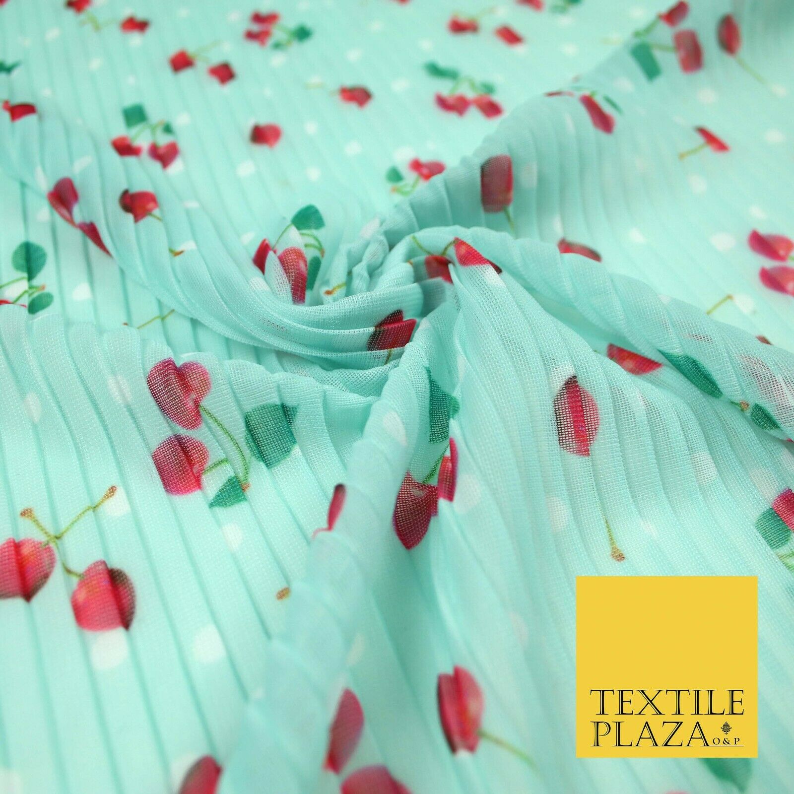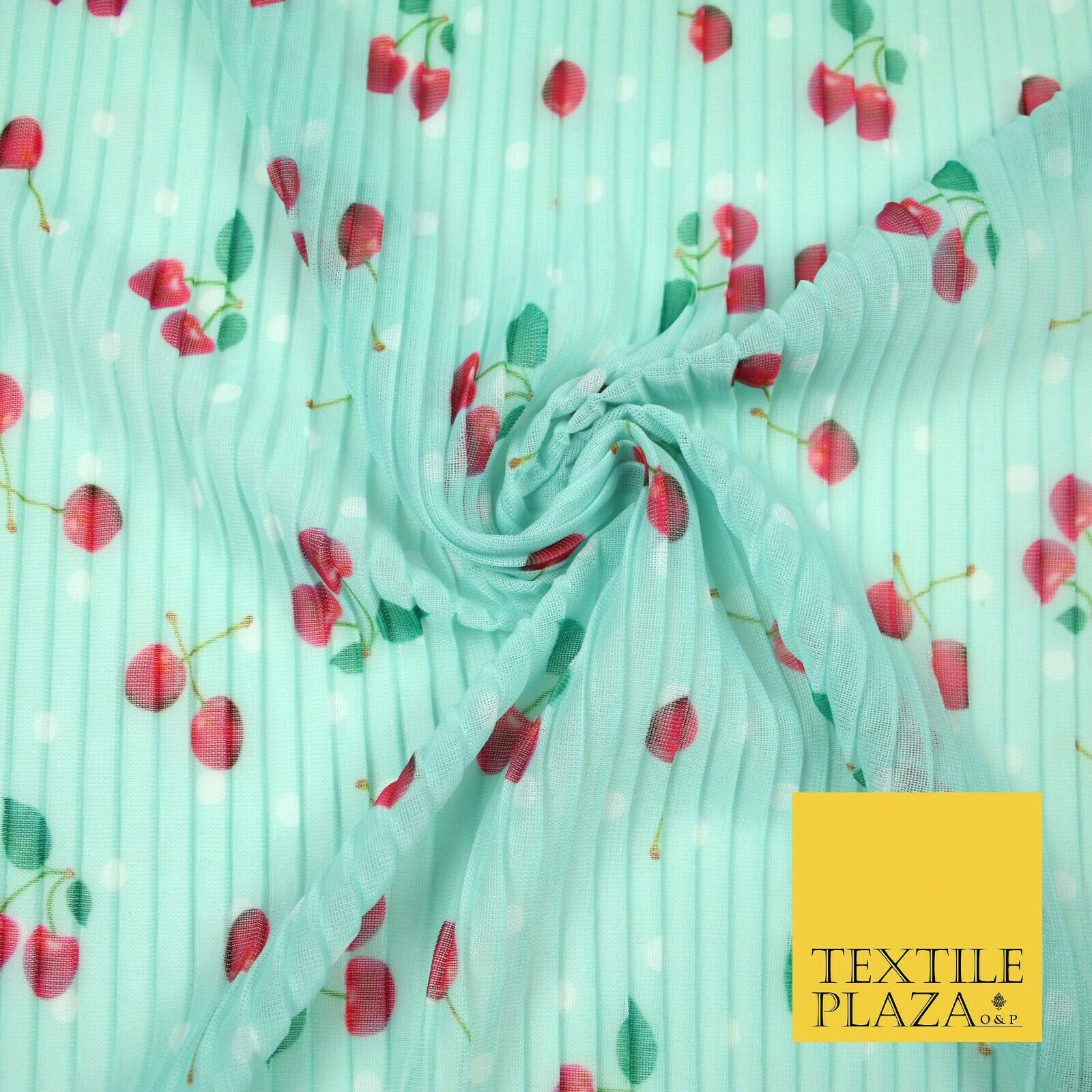 Mint White Falling Fruity Red Cherries Spotted Pleated Plisse Georgette Fabric