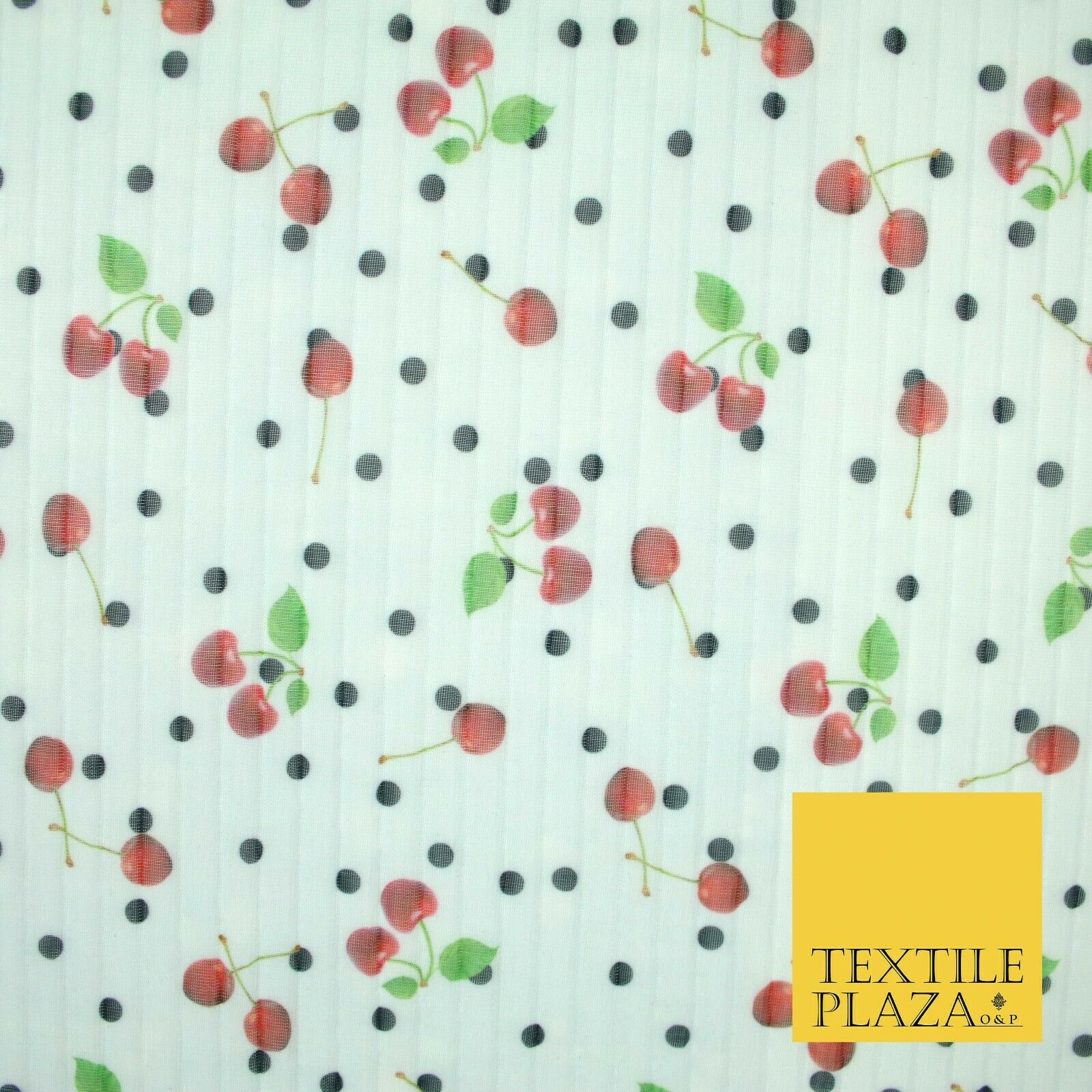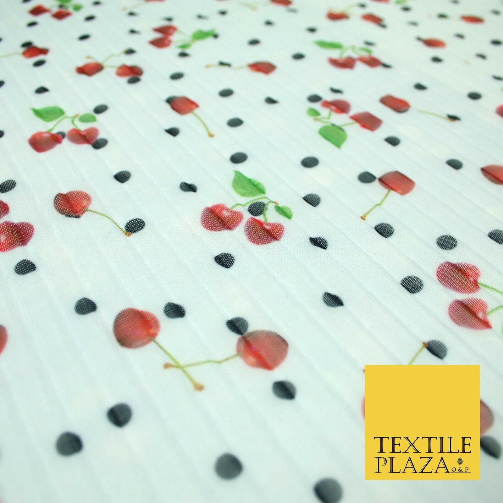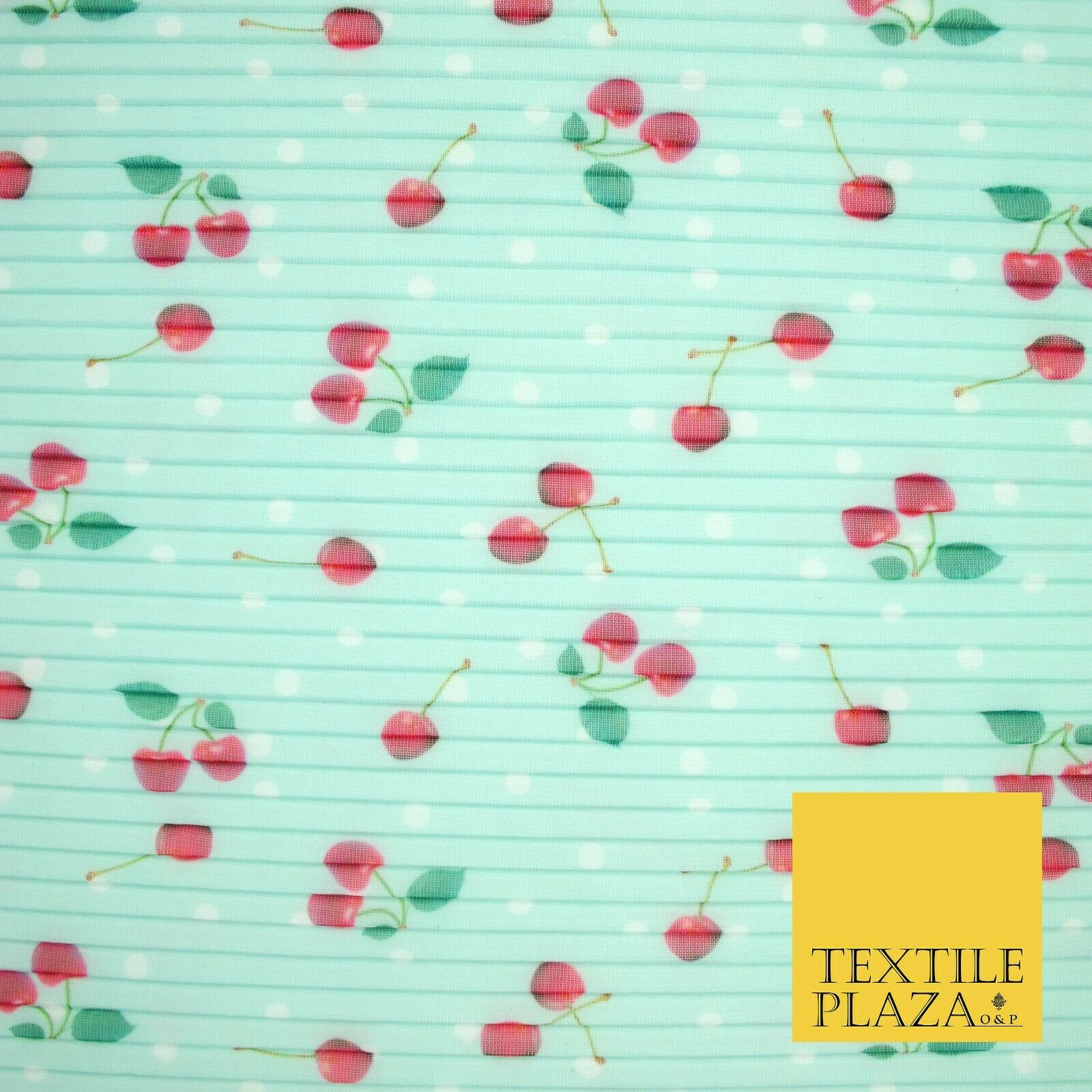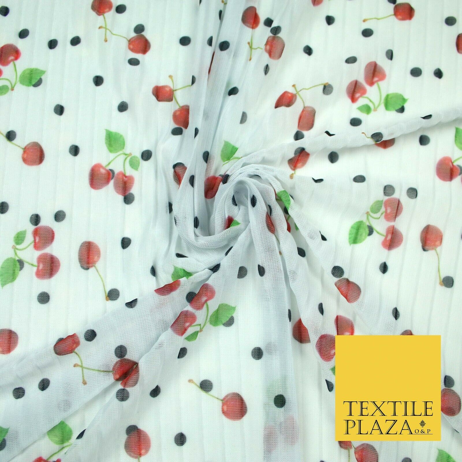 Mint White Falling Fruity Red Cherries Spotted Pleated Plisse Georgette Fabric