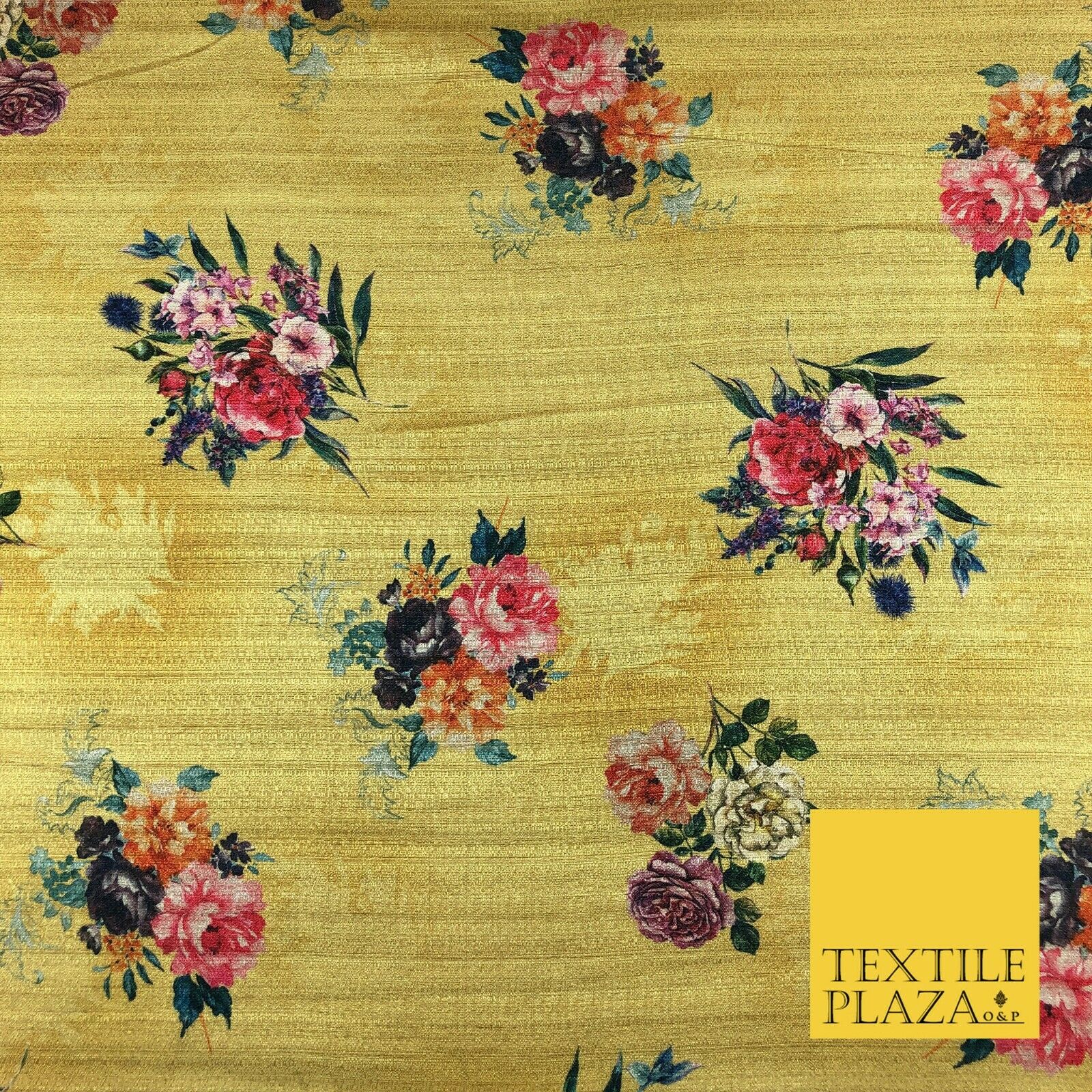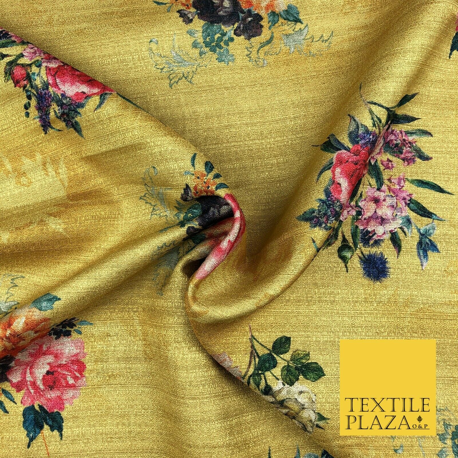 MUSTARD GOLD Floral Cluster Digital Print Faux Raw Silk Fabric Dress Craft 1465