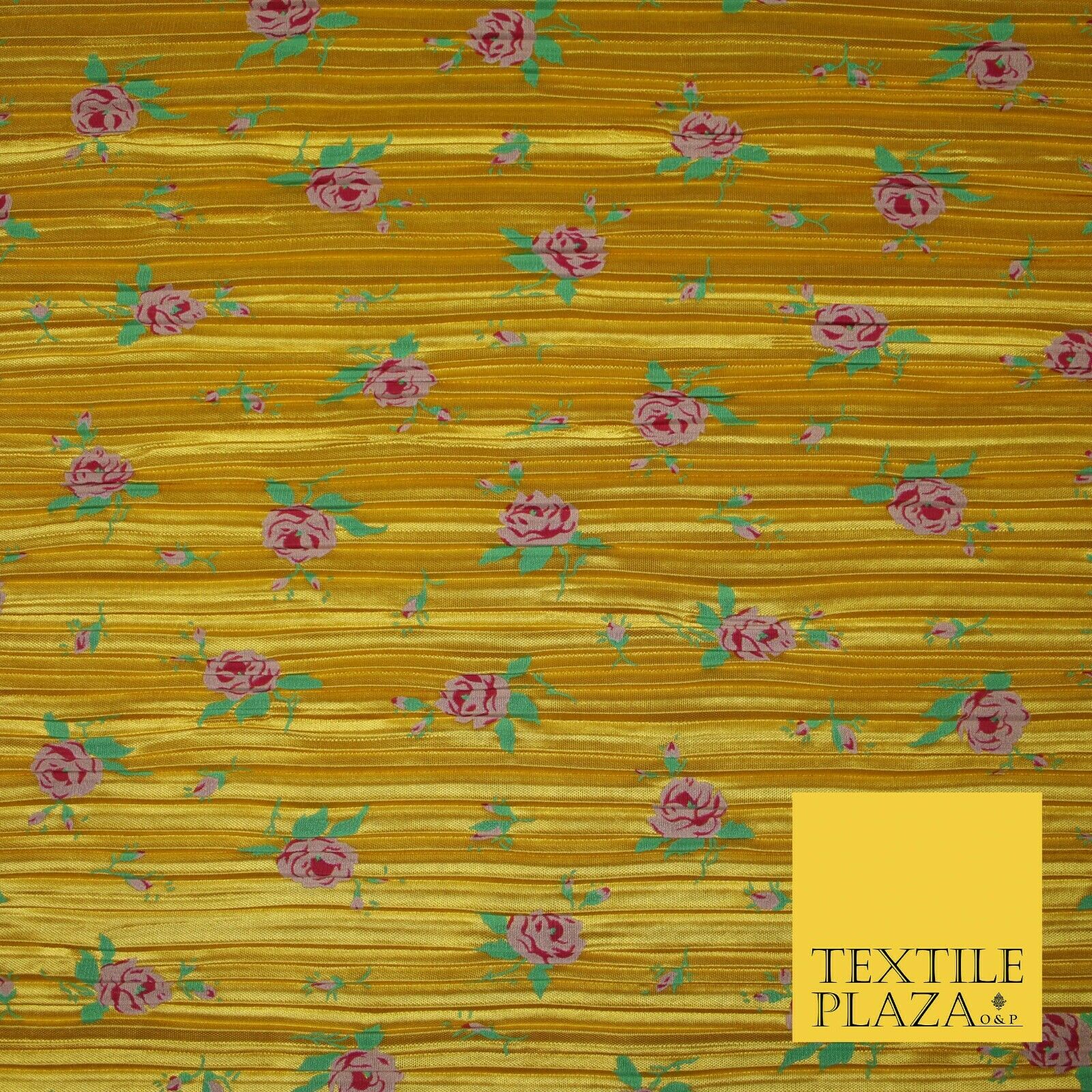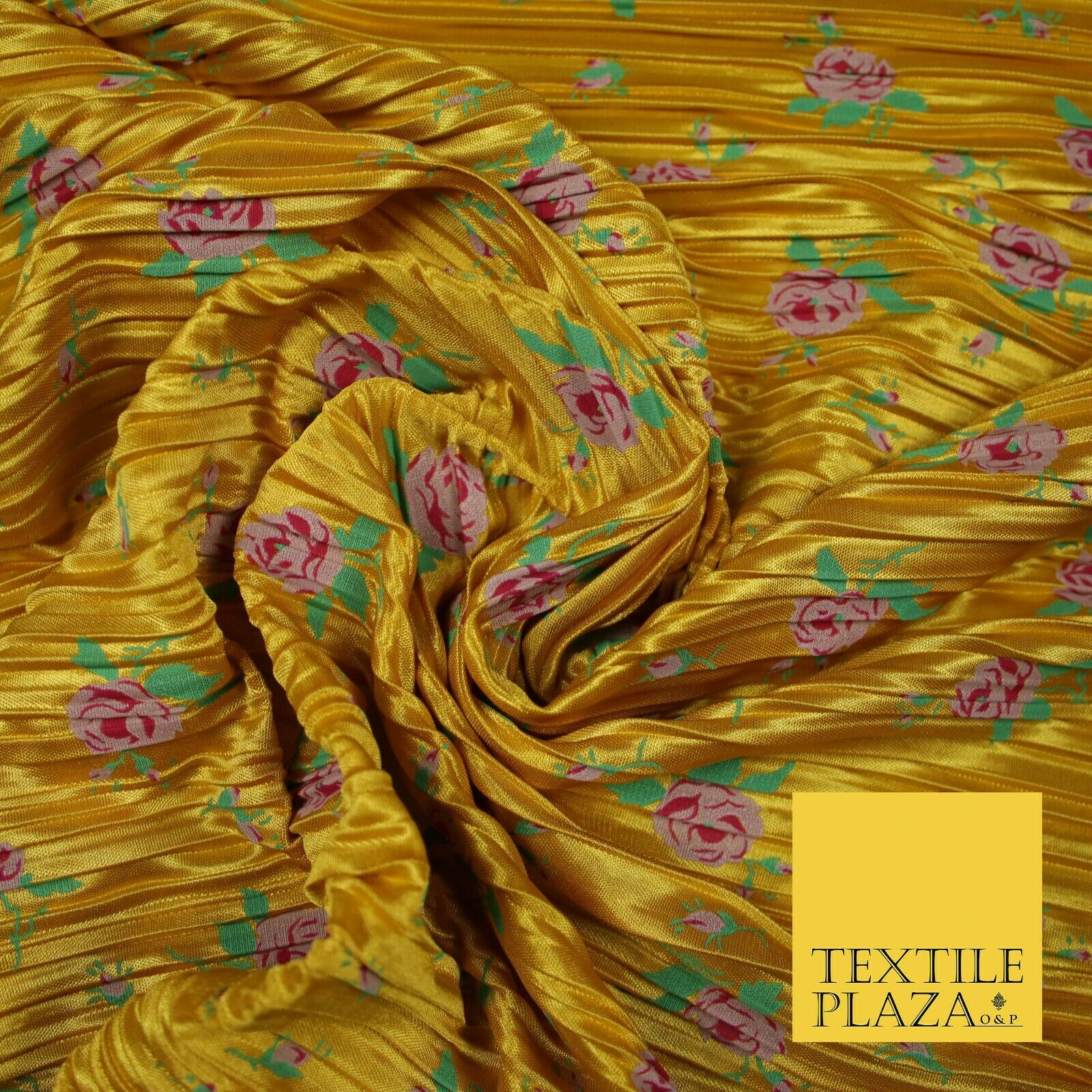 Mustard Gold Pink Floral Leaf Printed Pleated Plisse Satin Dress Fabric 5401