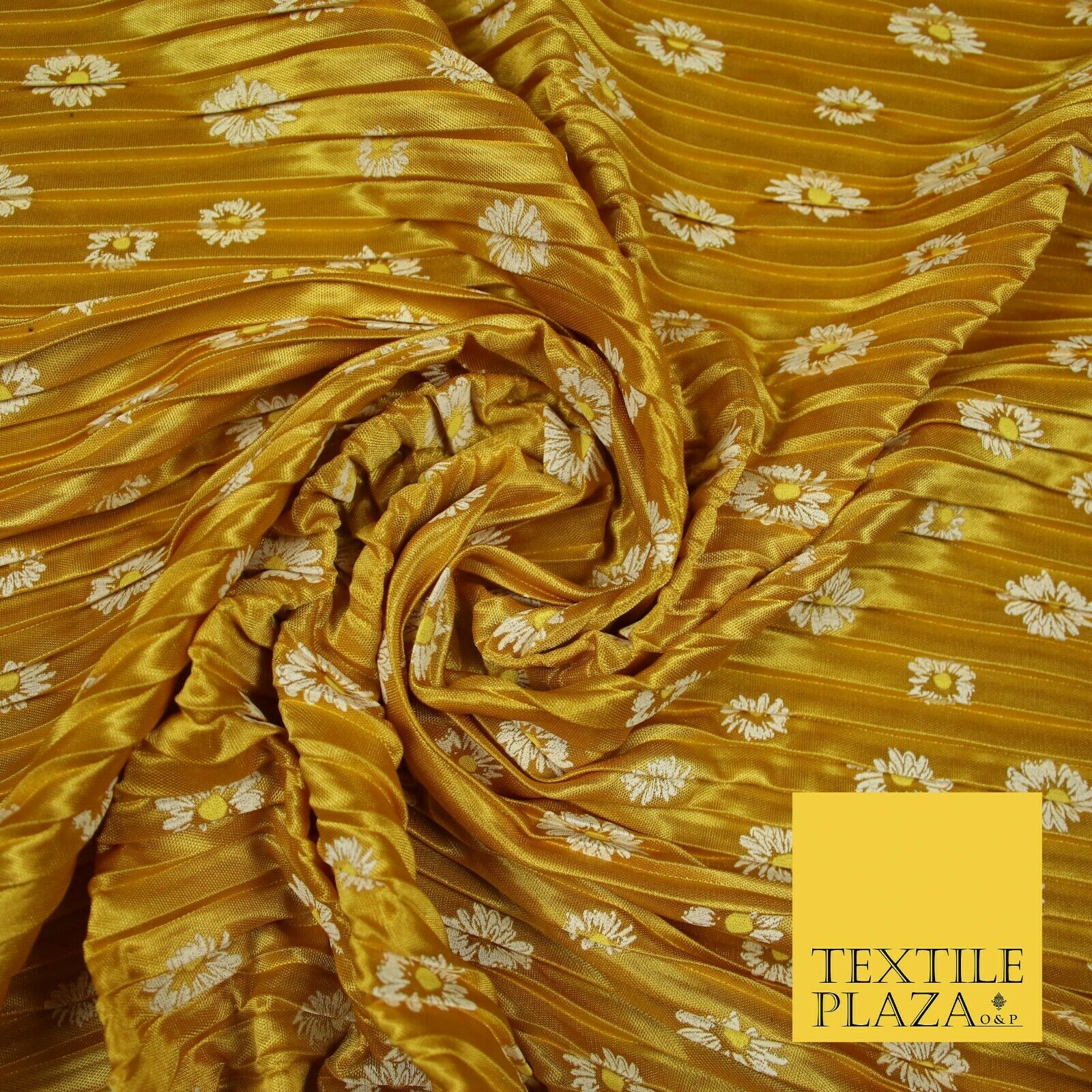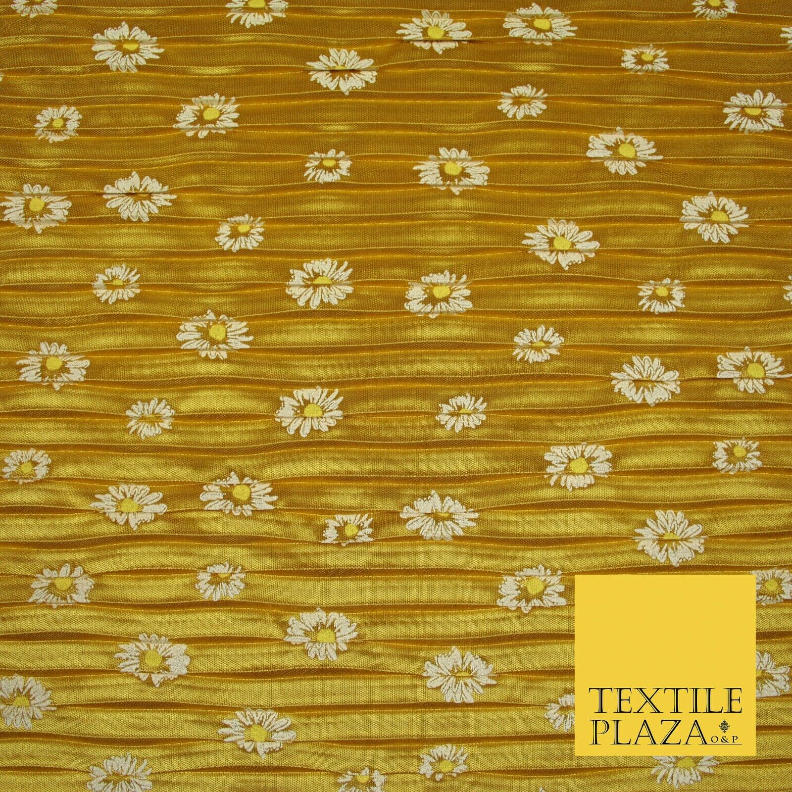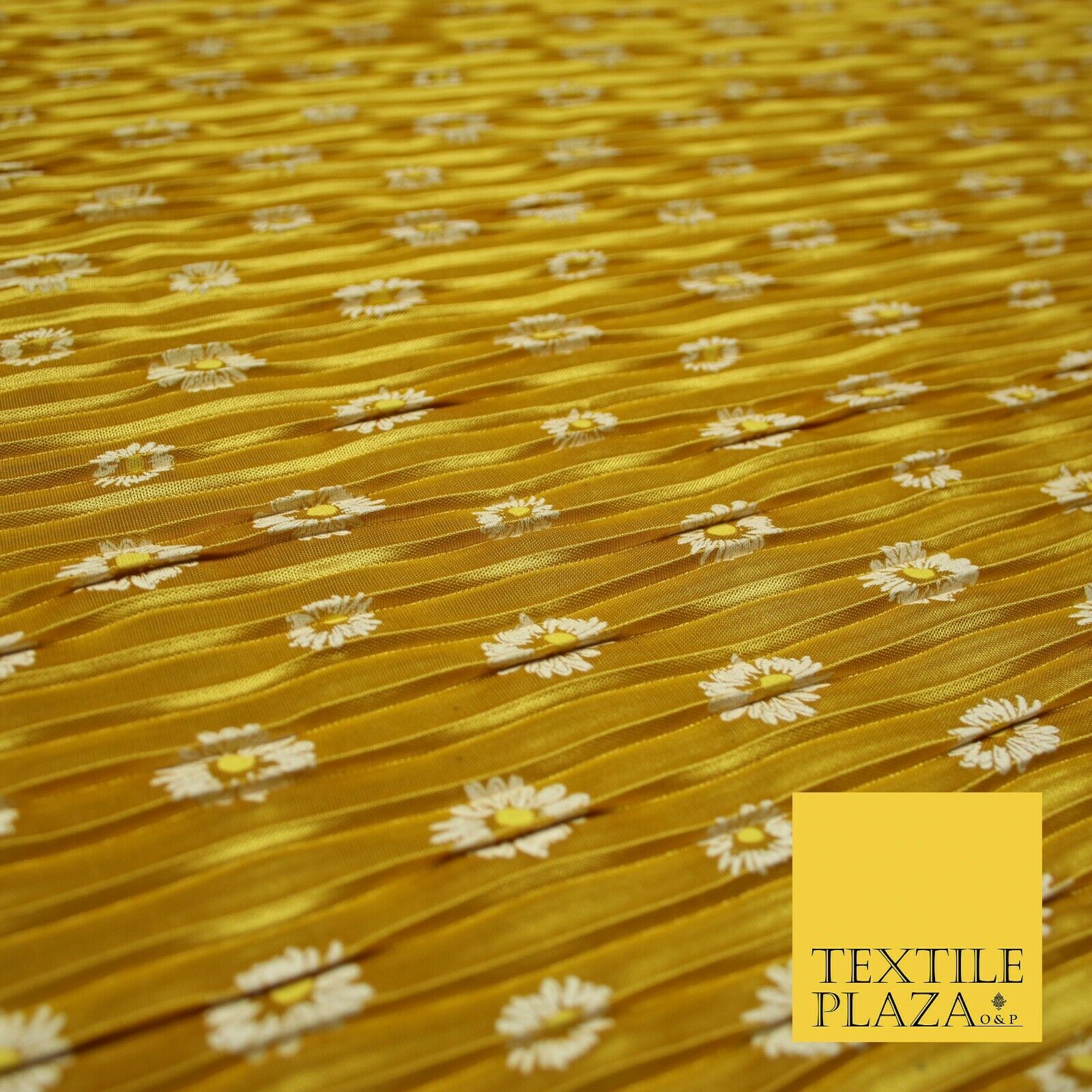 Mustard Gold White Daisy Floral Printed Pleated Plisse Satin Dress Fabric 5402