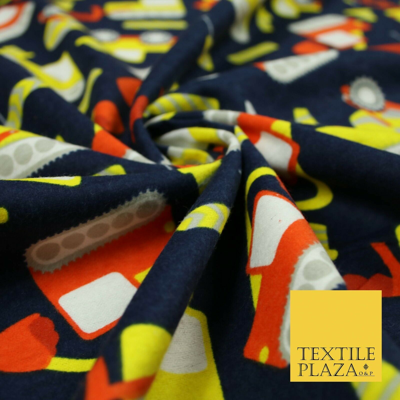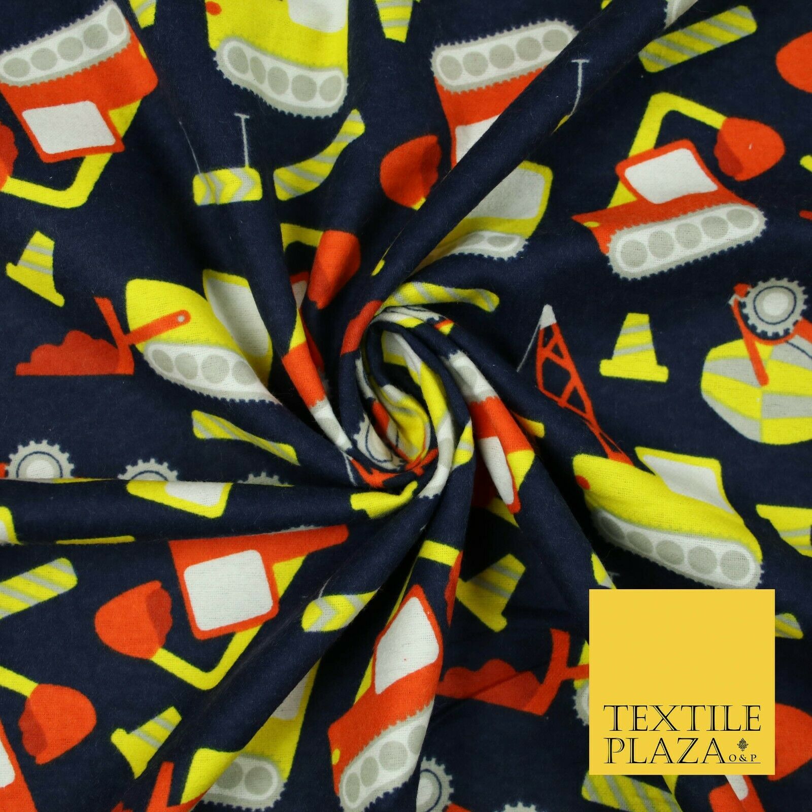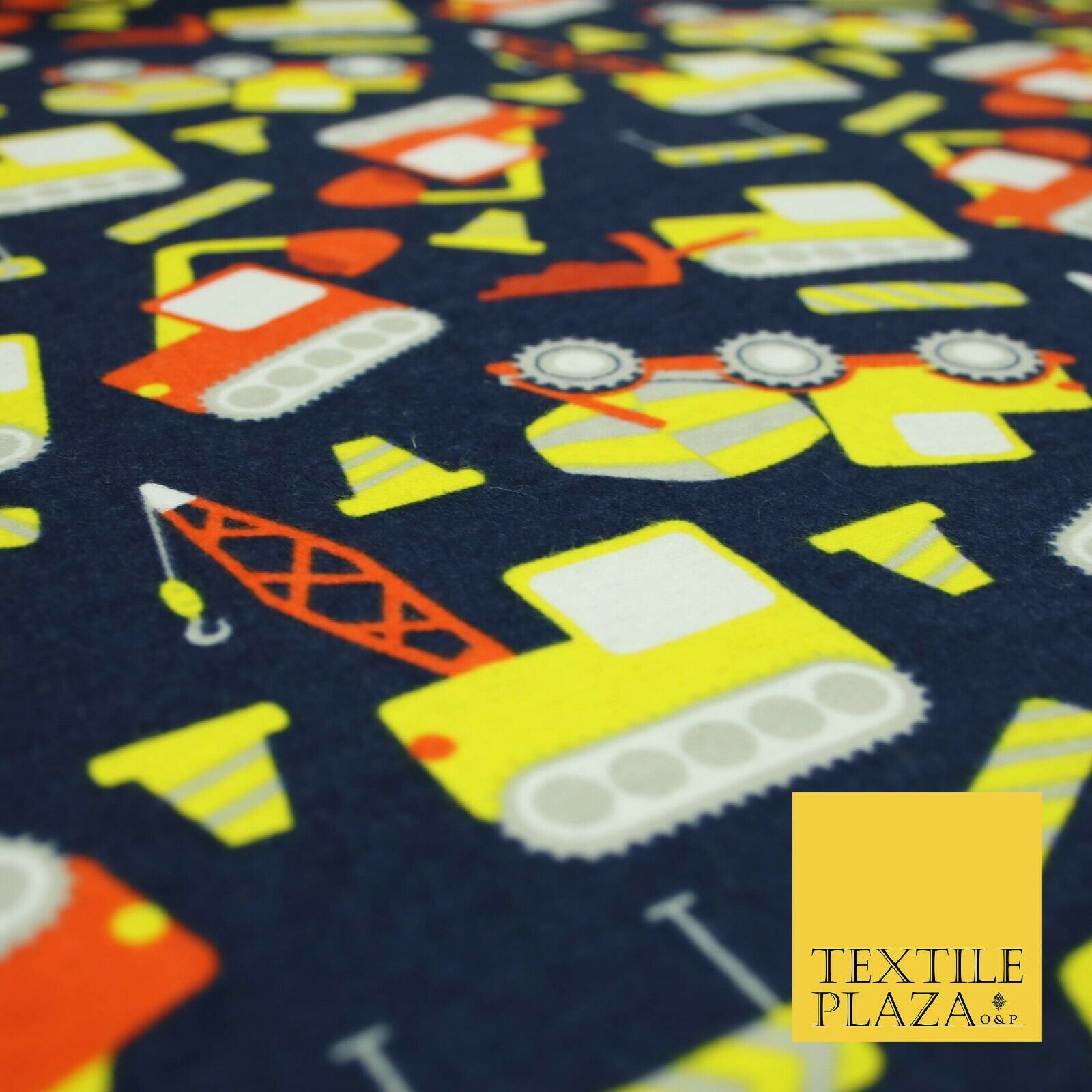 Navy Blue Construction Lorry Kids Brushed Cotton Winceyette Fabric Flannel 5517