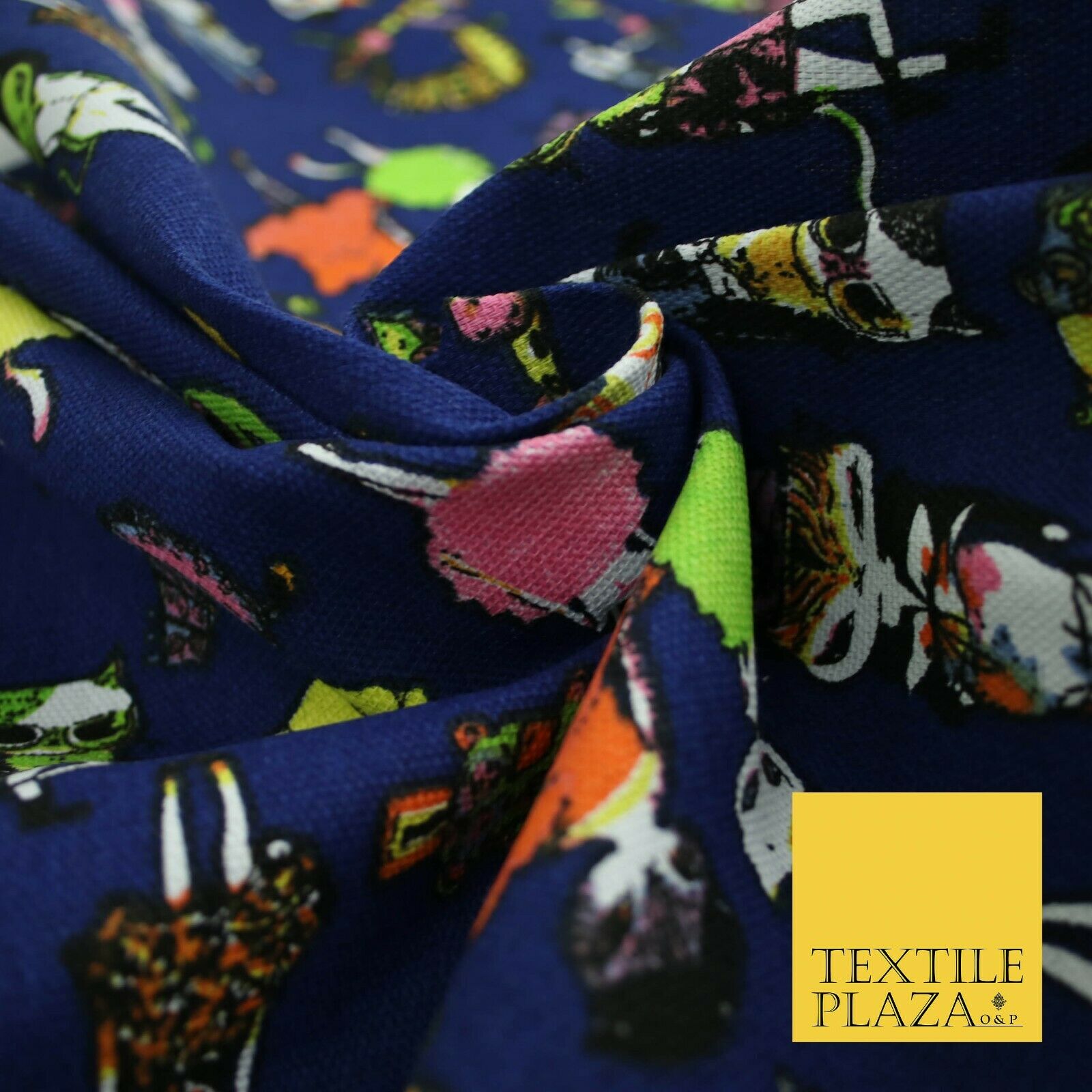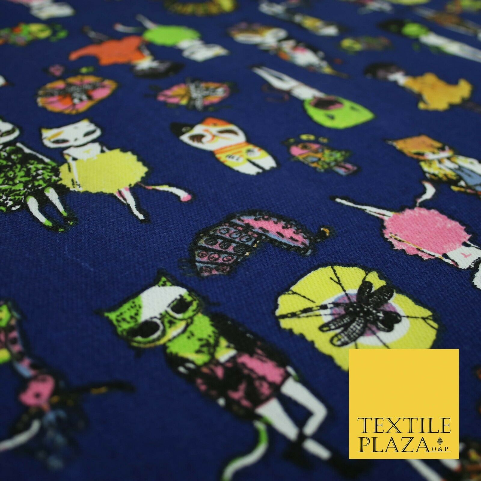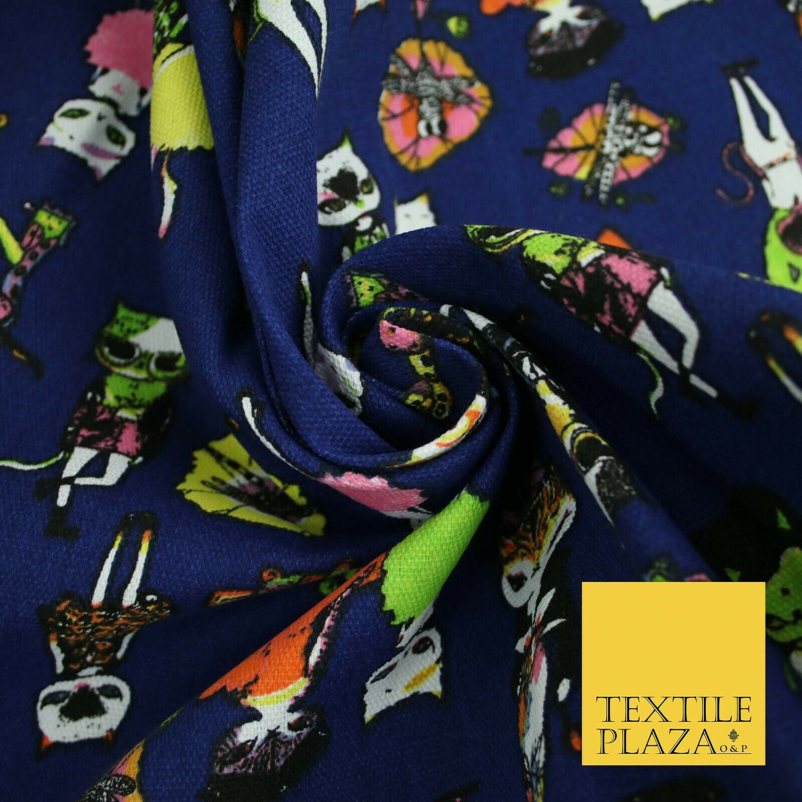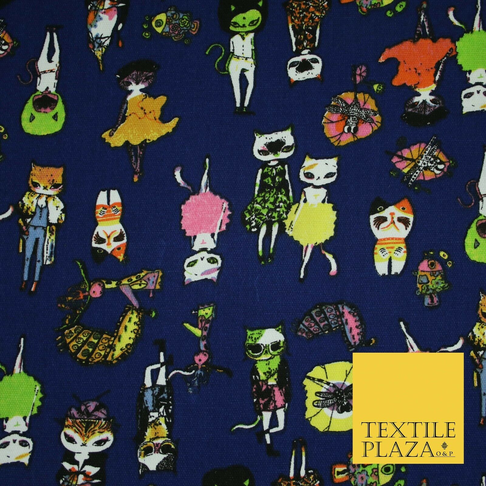Navy Blue Dressed Up Animals Trendy Cats Printed Cotton Canvas Fabric 59" 4130