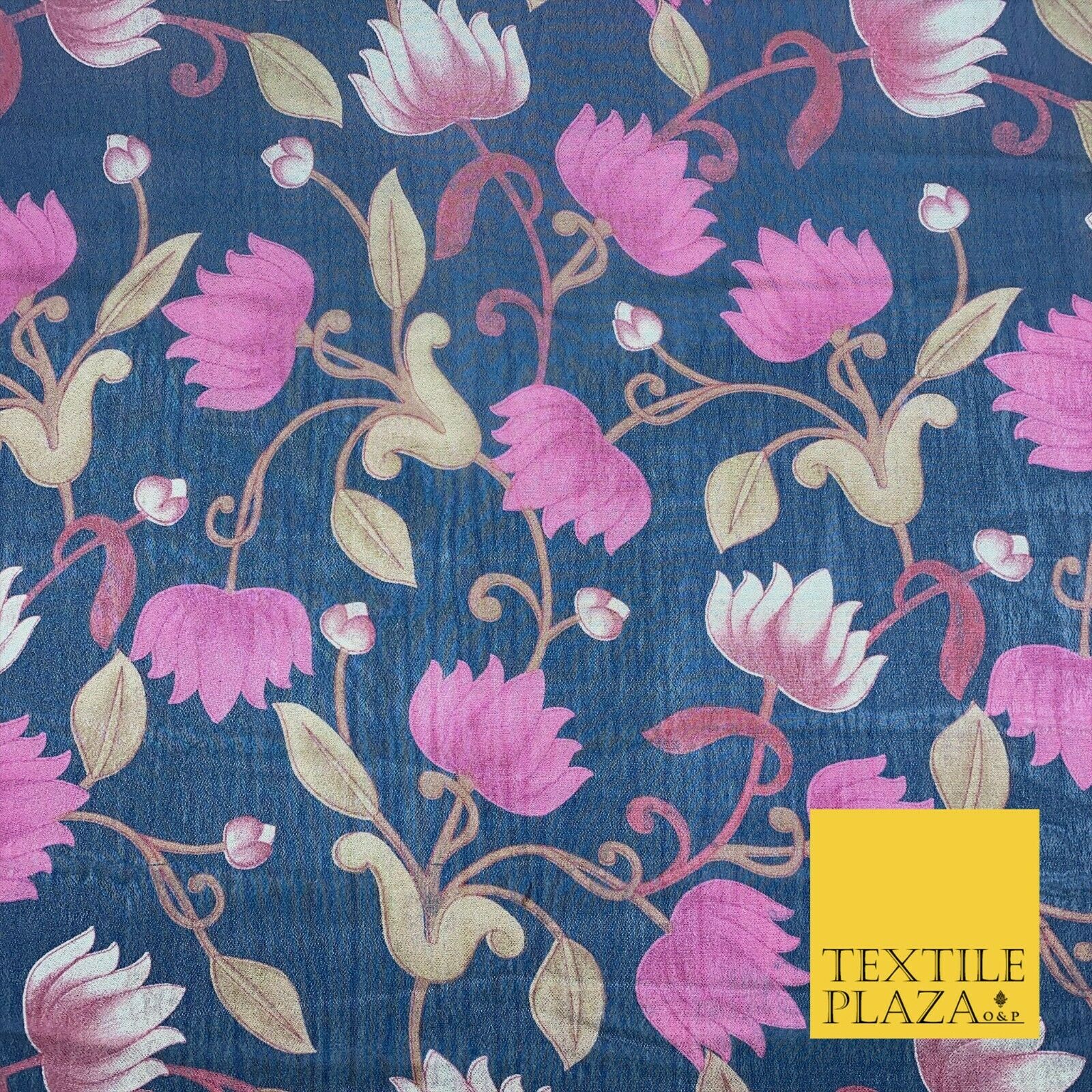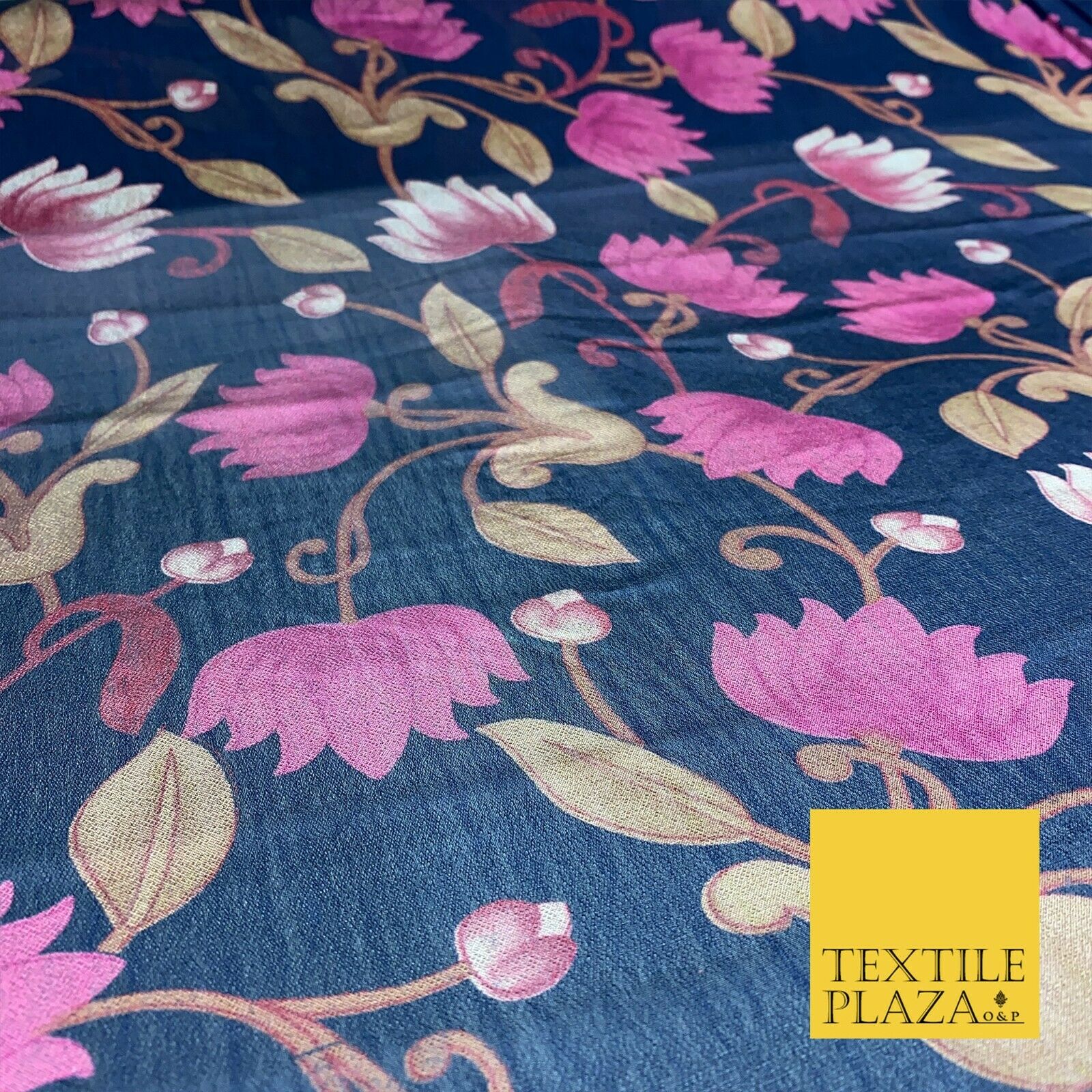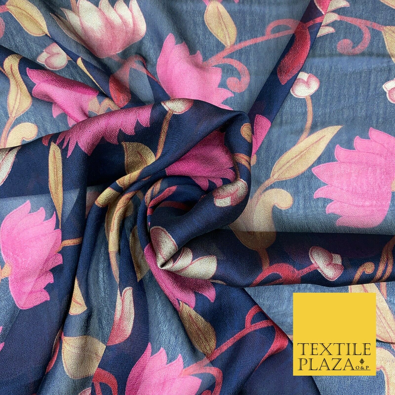 NAVY BLUE Floral Lotus Premium Printed Sheen Georgette Dress Fabric Drape 1669