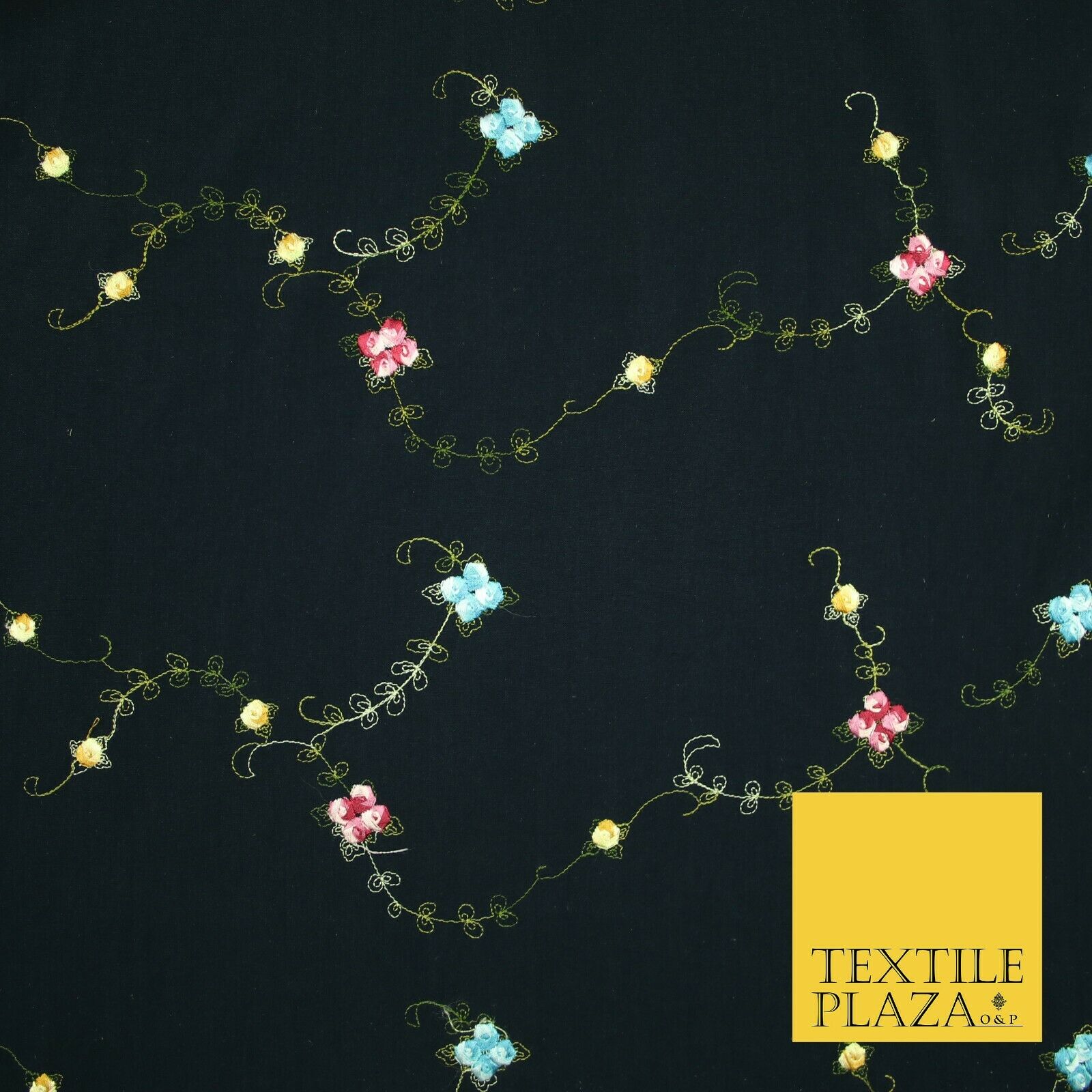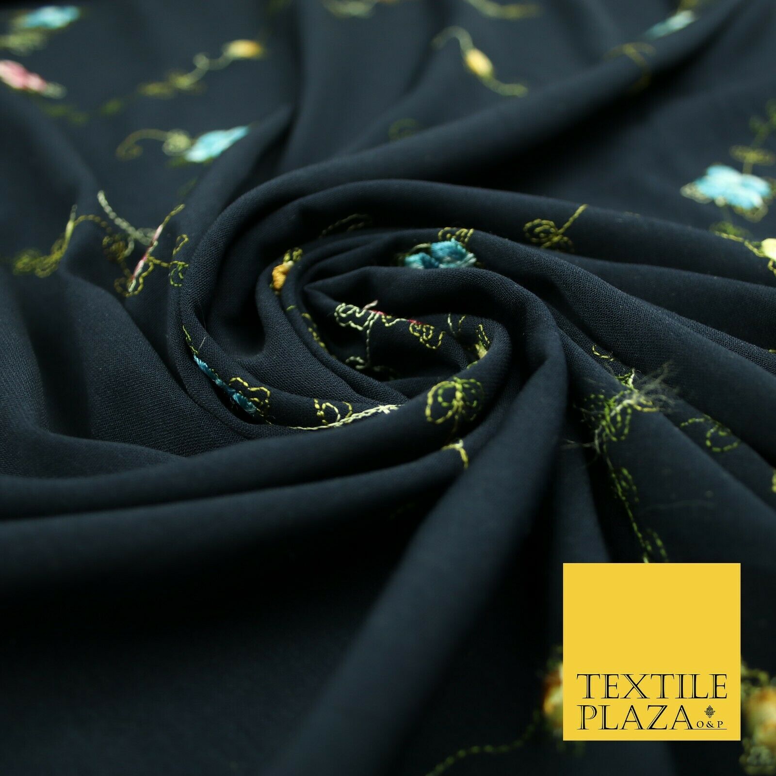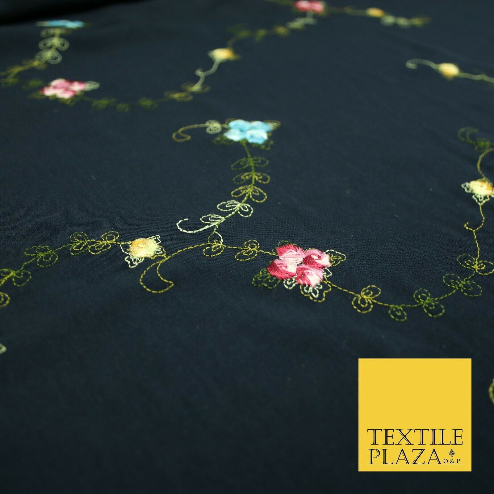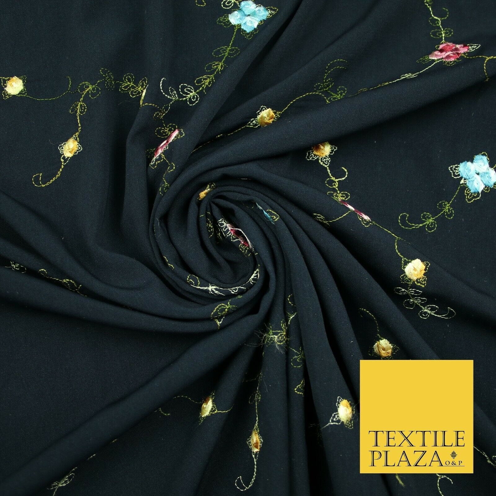 Navy Blue Multicolour Flowers Silky Threadwork Embroidered Peachskin Fabric 2831