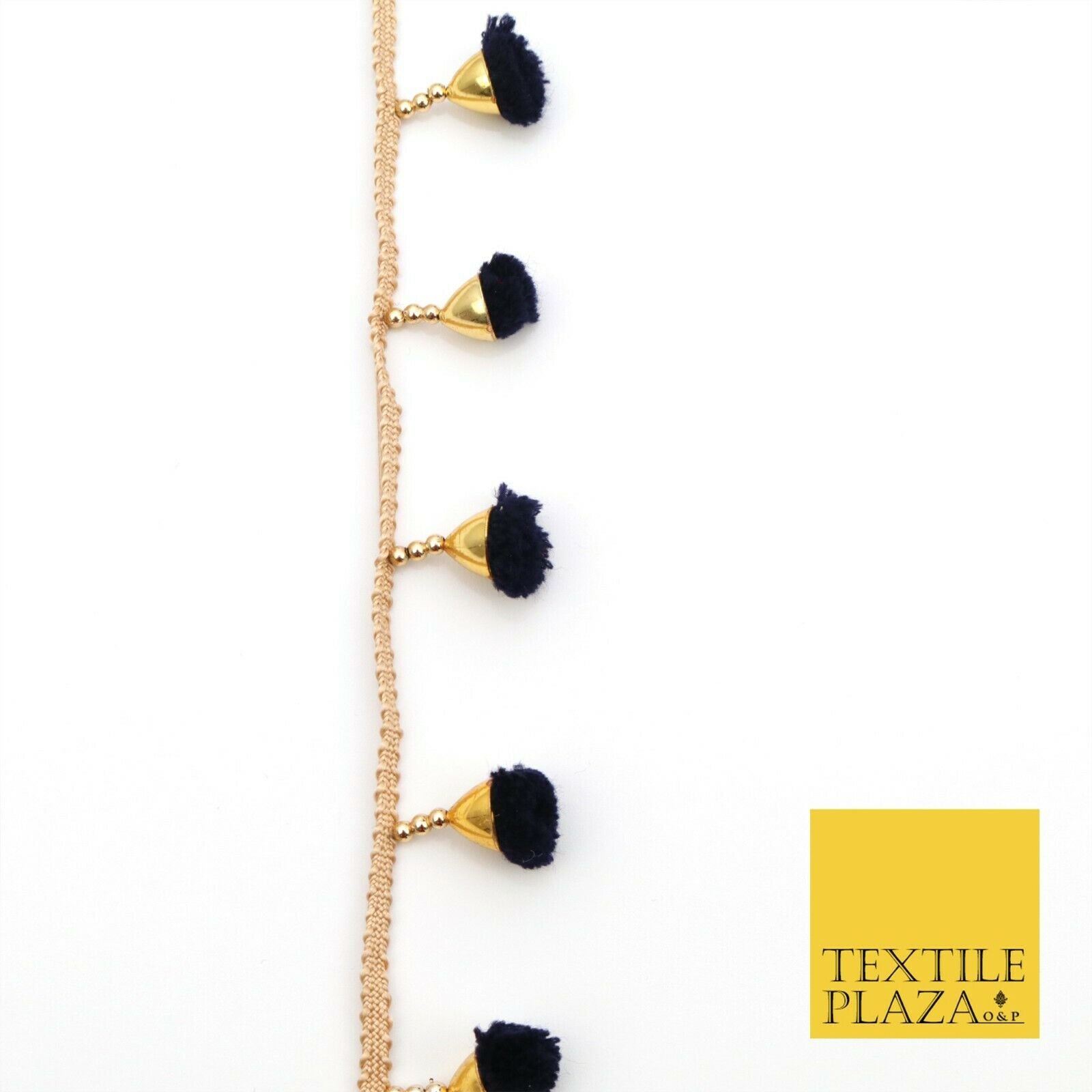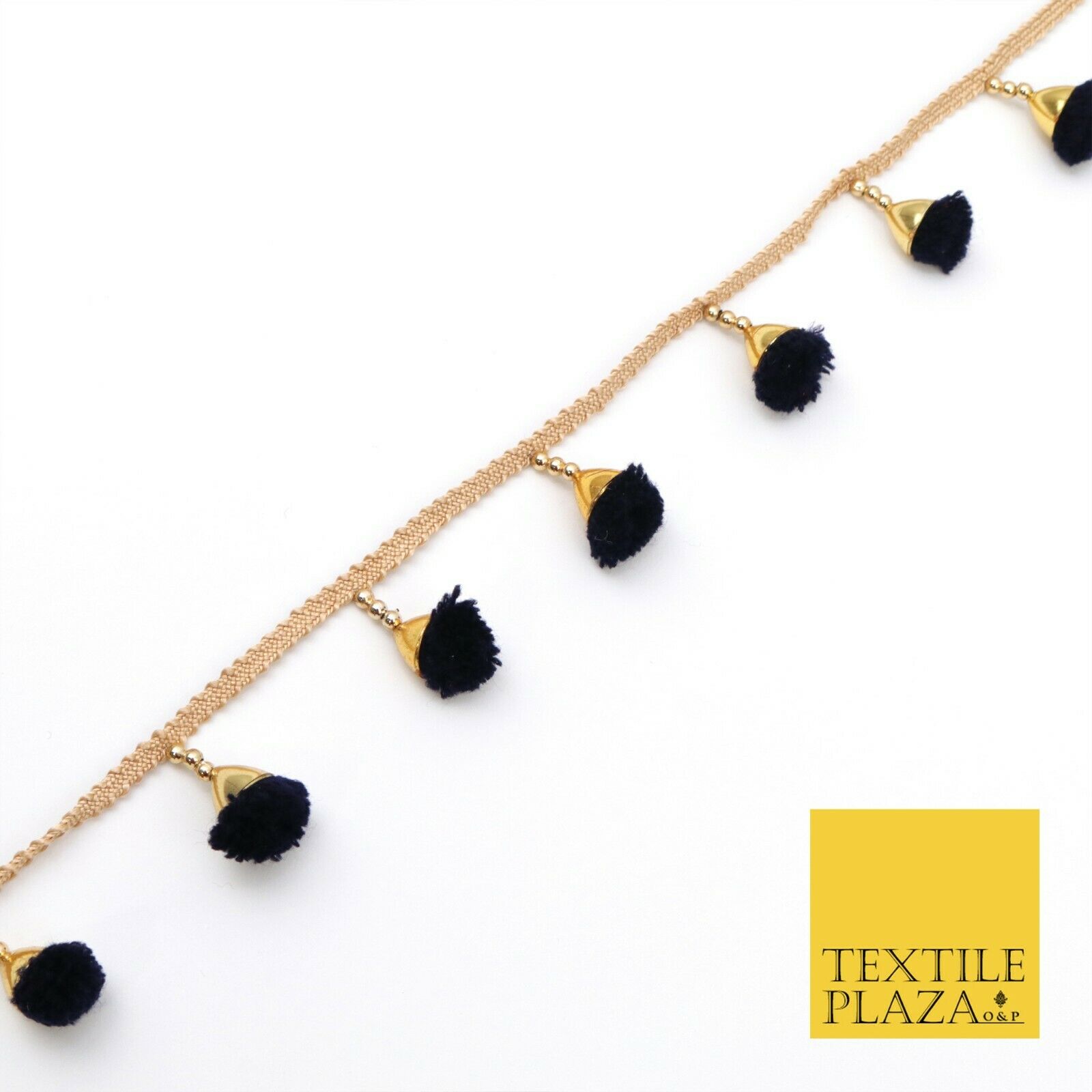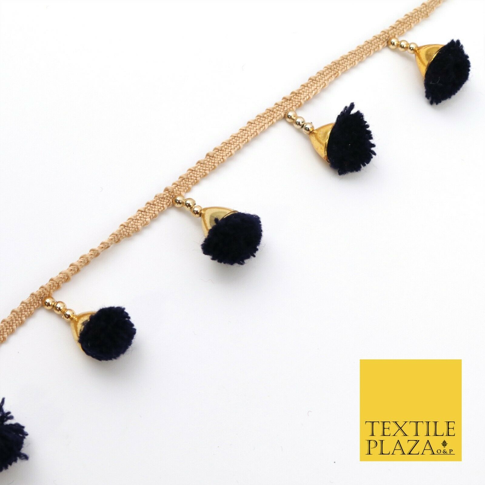 NAVY BLUE Pom Pom Tassels Indian Woven Gold Trim Ribbon Border Lace Ethnic X254