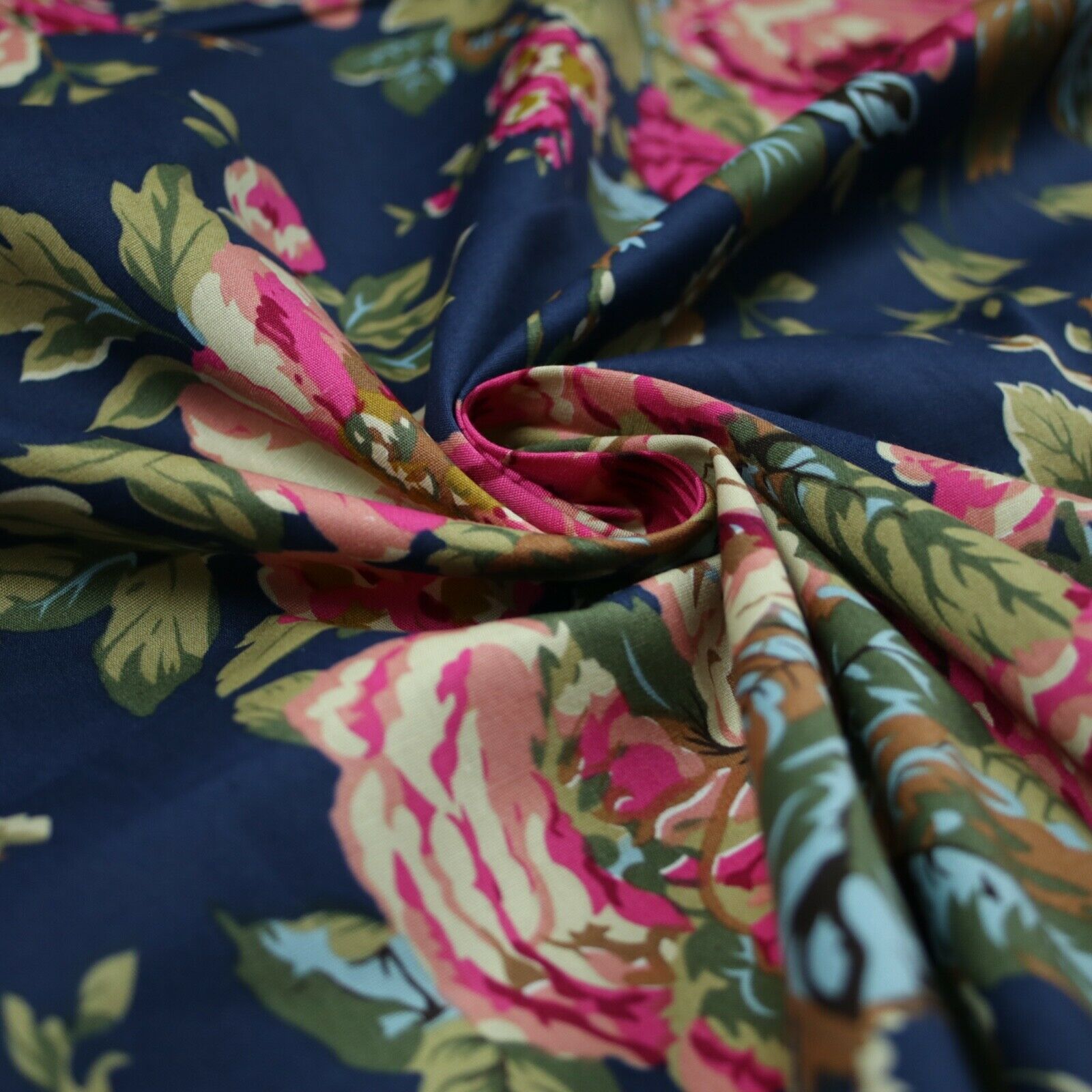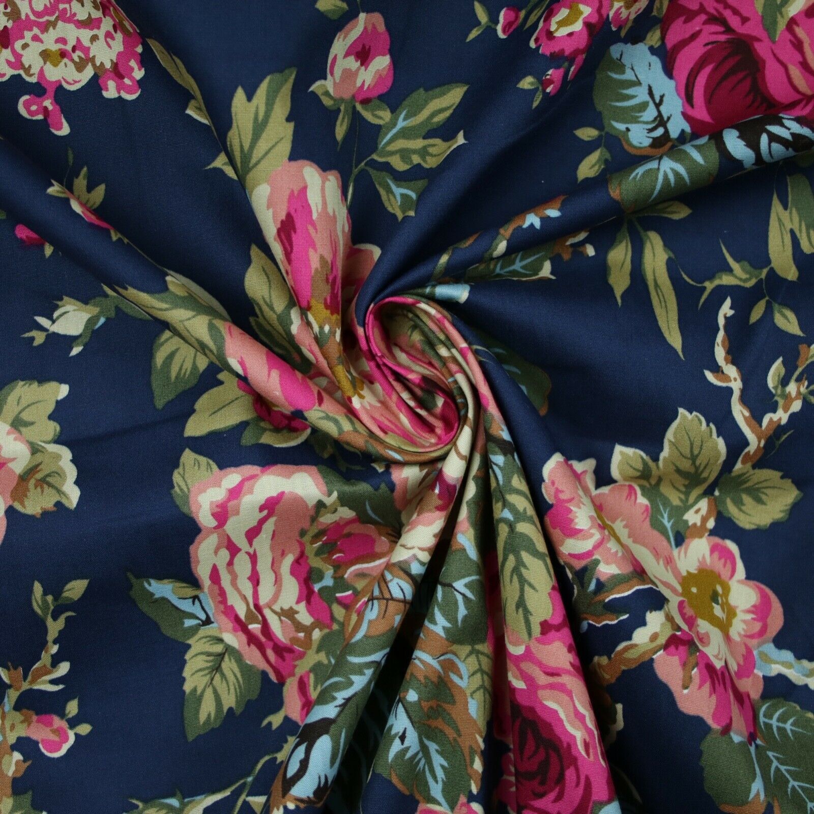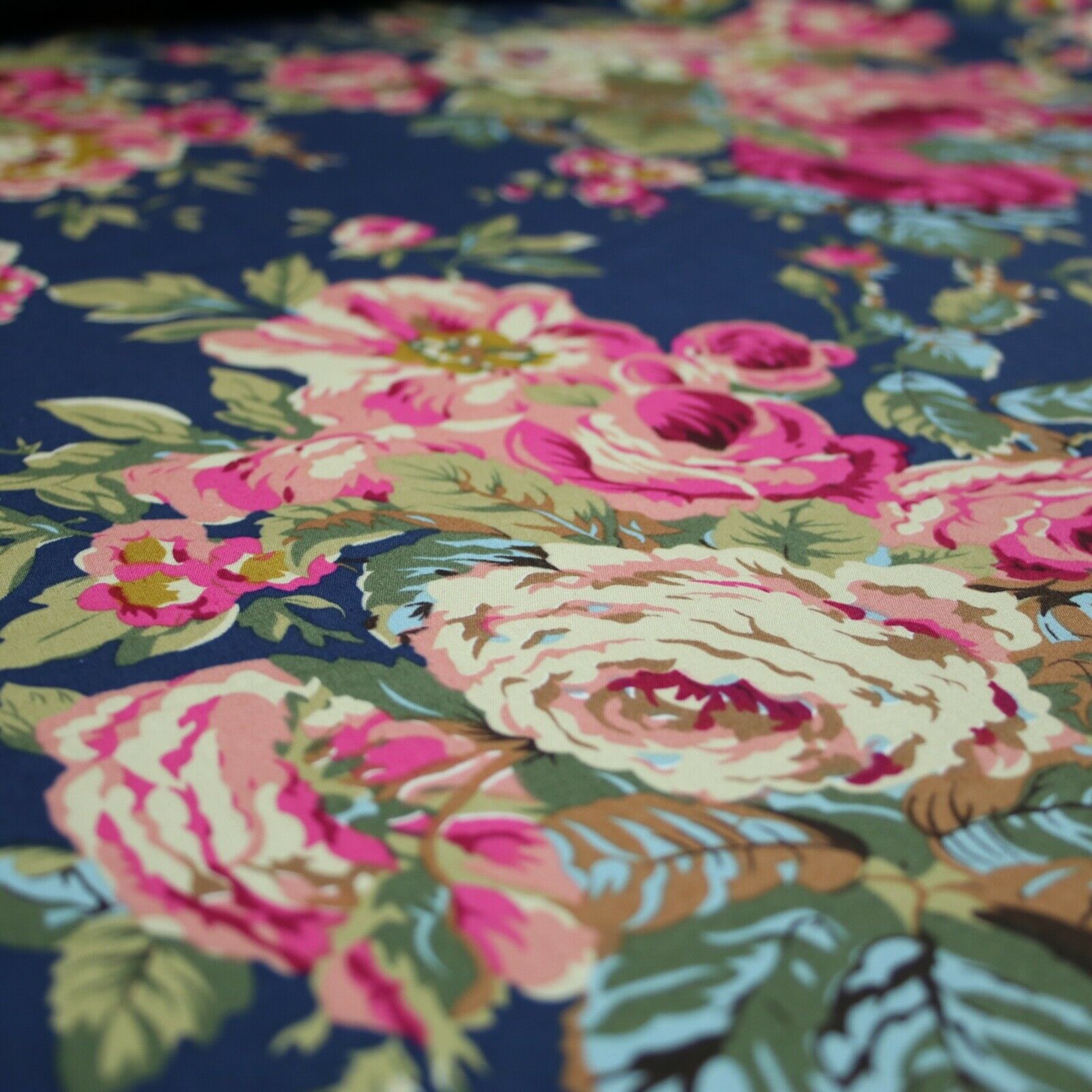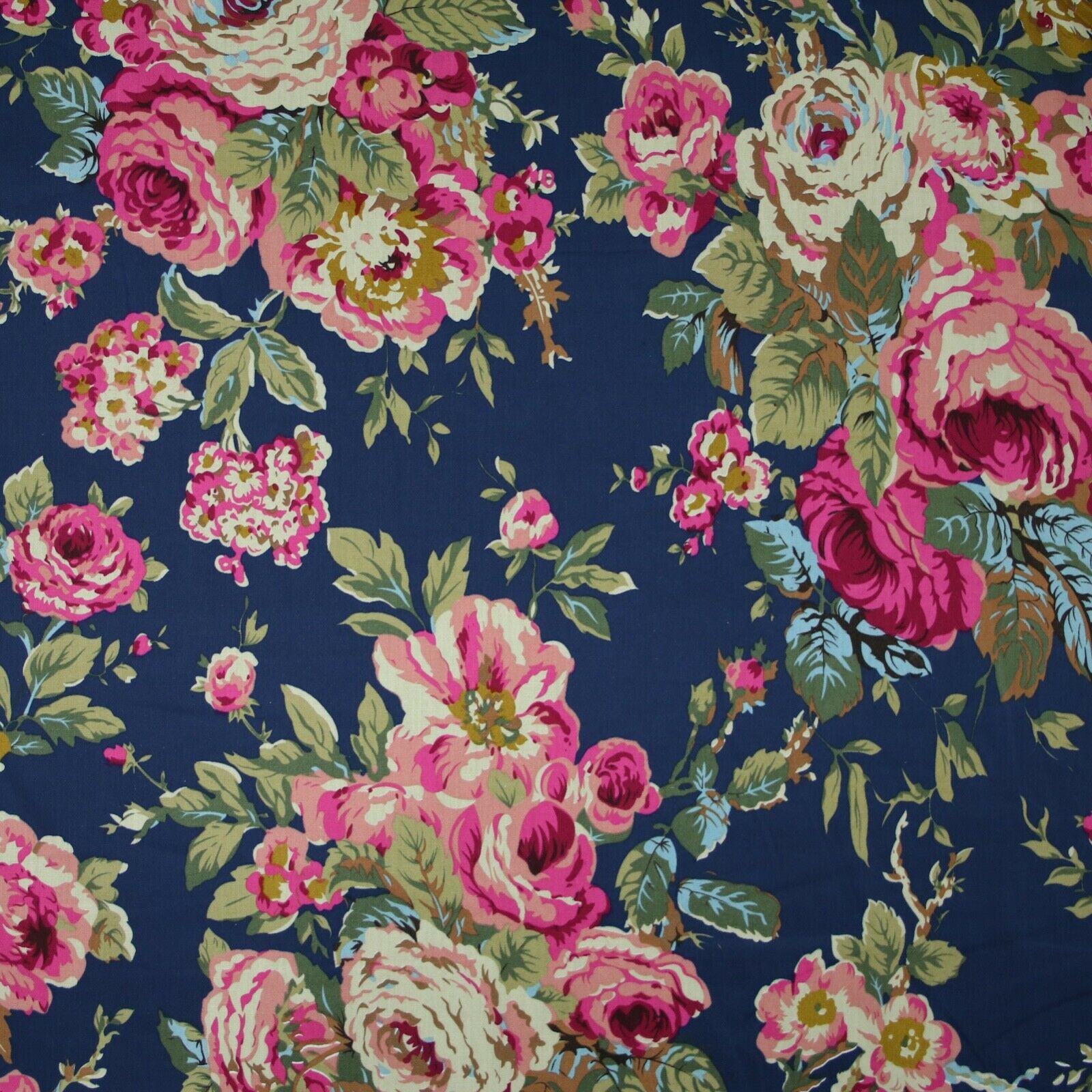 Navy Peach Floral Blooming Roses Printed 100% Cotton Poplin Dress Fabric 59"