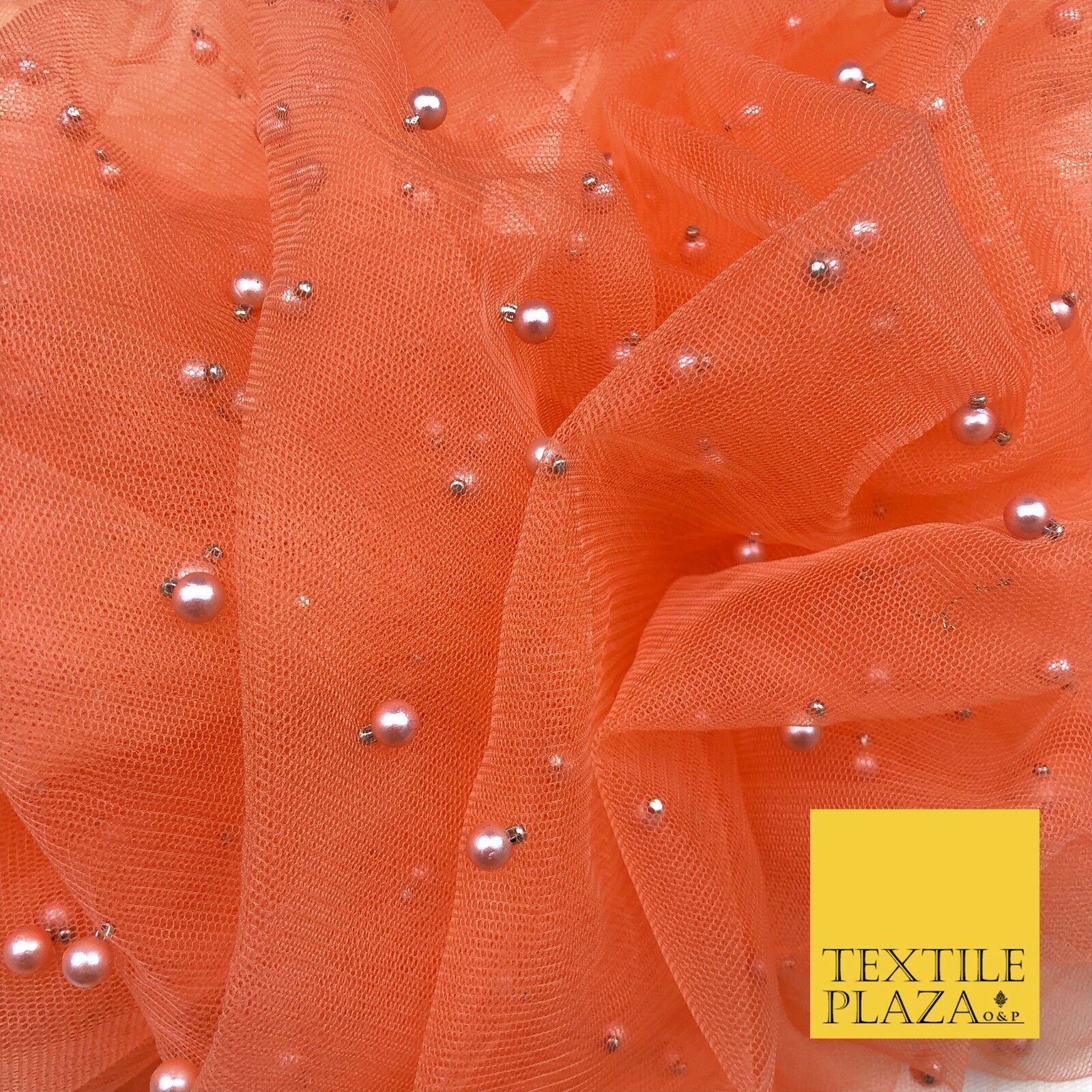 ORANGE Studded Pearl Mesh Net Fabric Bridal Sheer Craft Dress N1097