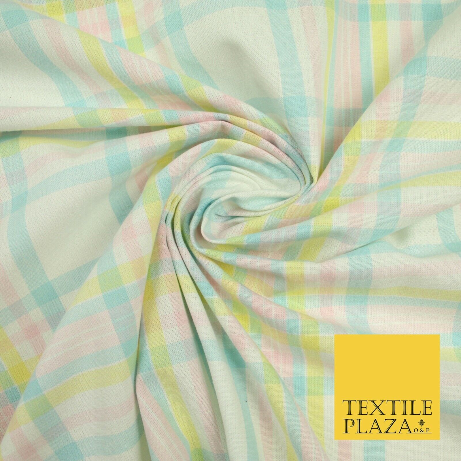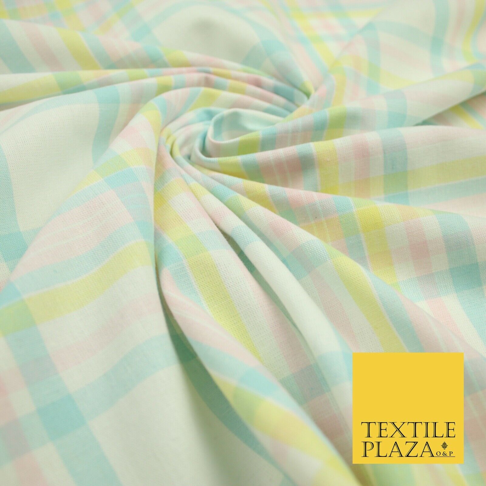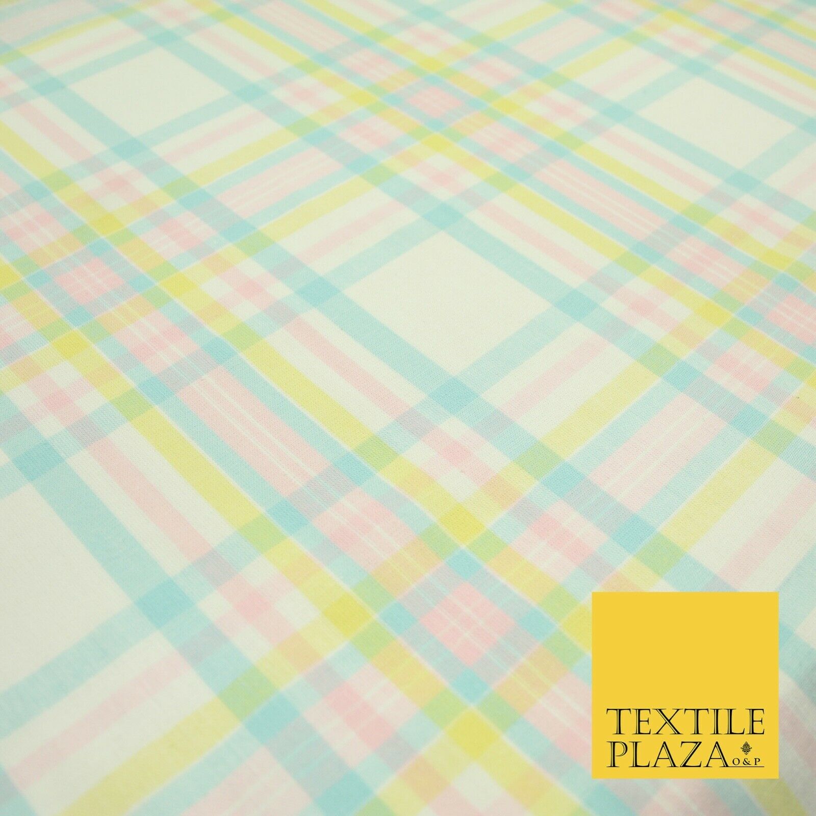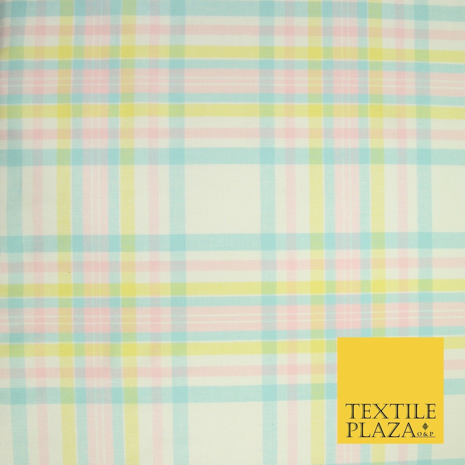 Pastel Blue Pink Lemon Check Tartan Plaid Printed Fabric 100% Cotton 6386