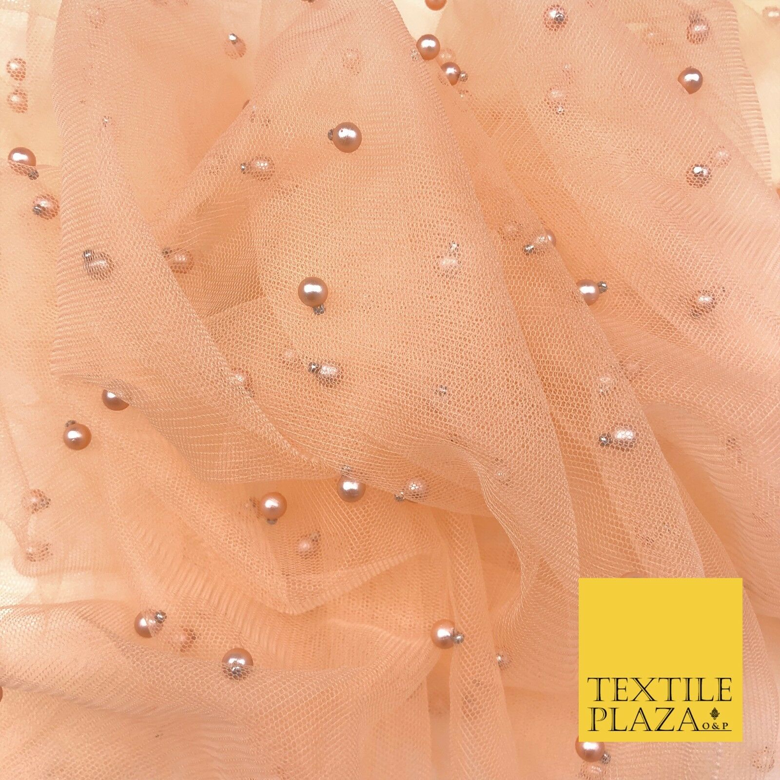 PEACH Studded Pearl Mesh Net Fabric Bridal Sheer Craft Dress N1110