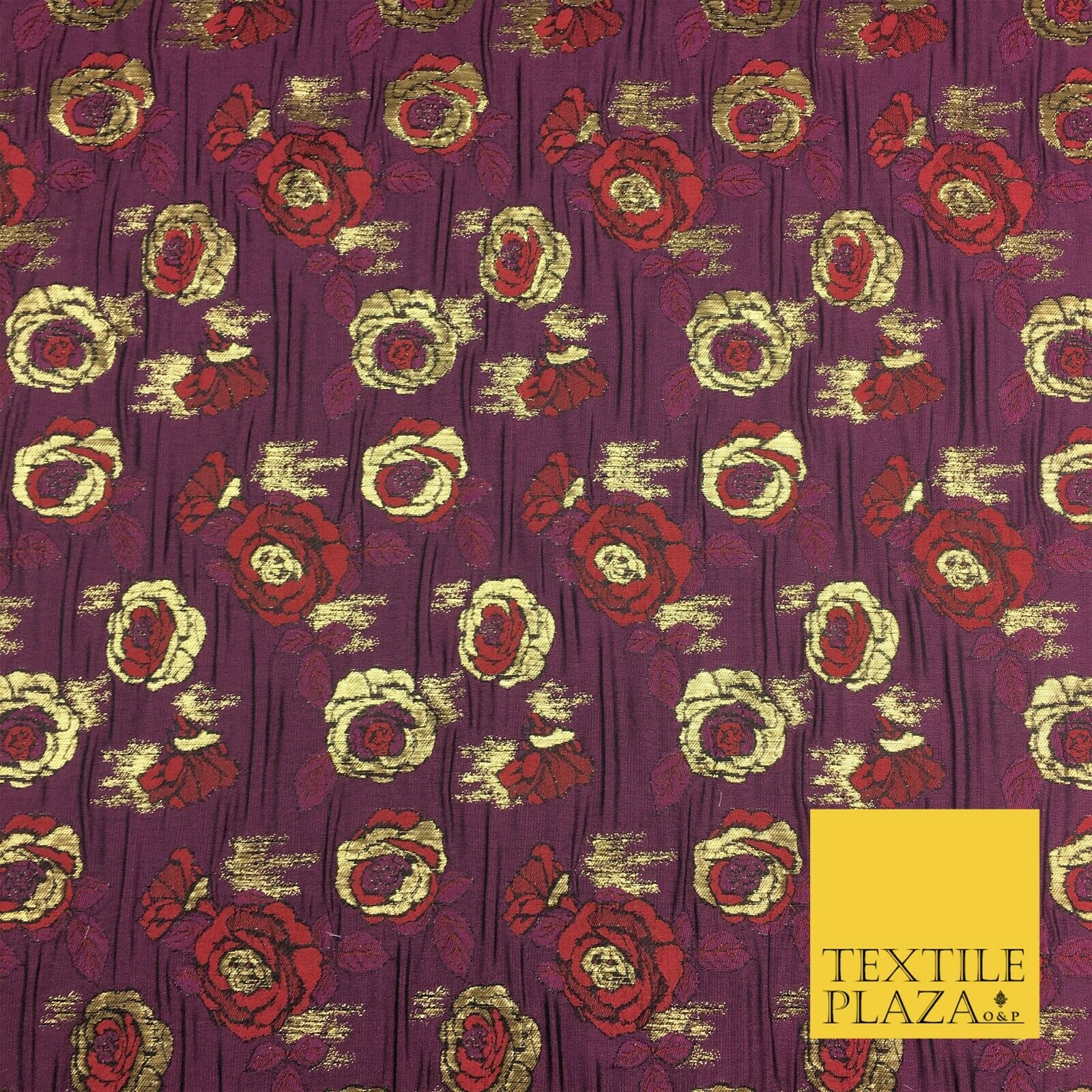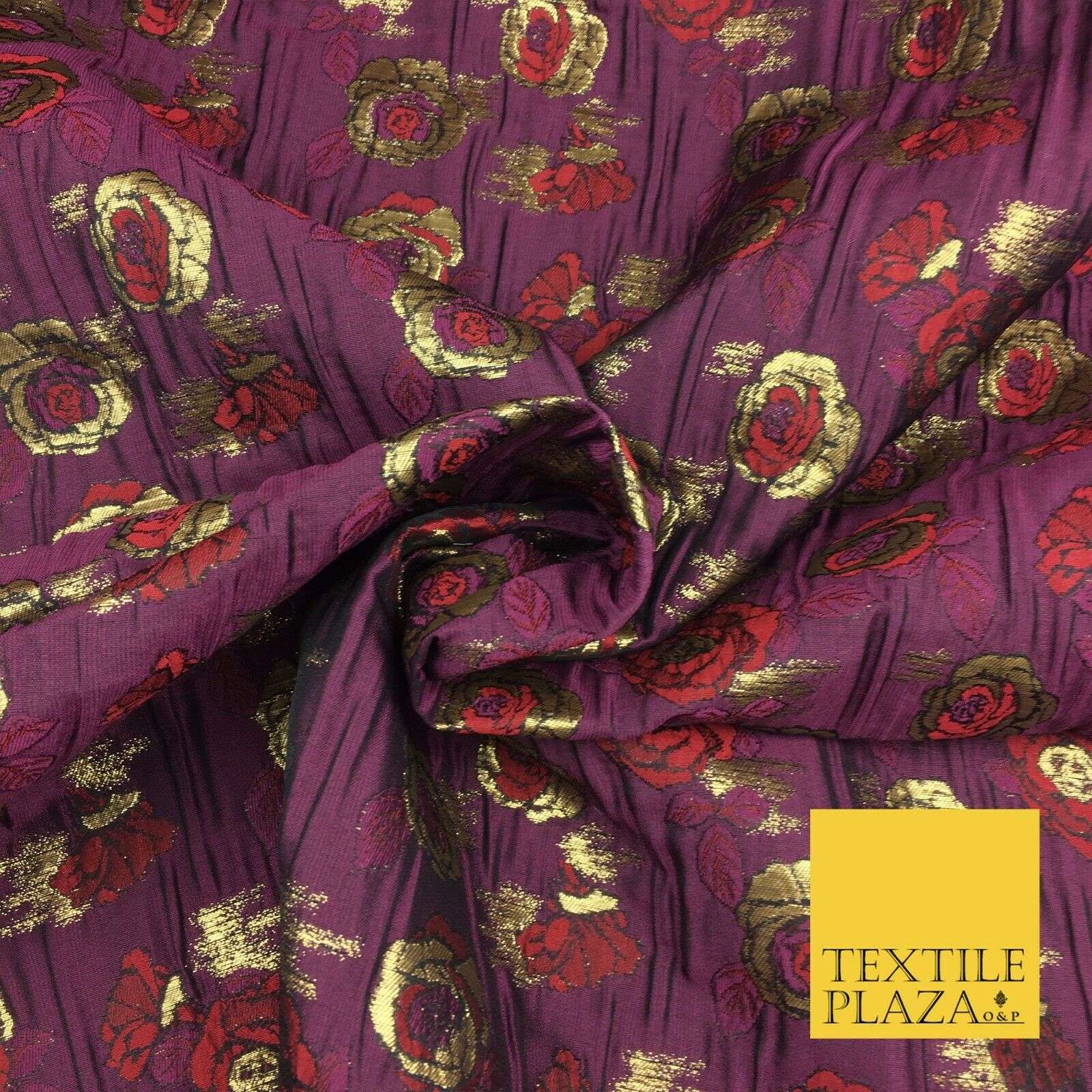 PLUM Two Tone Floral Metallic Rose Creased Brocade Jacquard Dress Fabric 1374