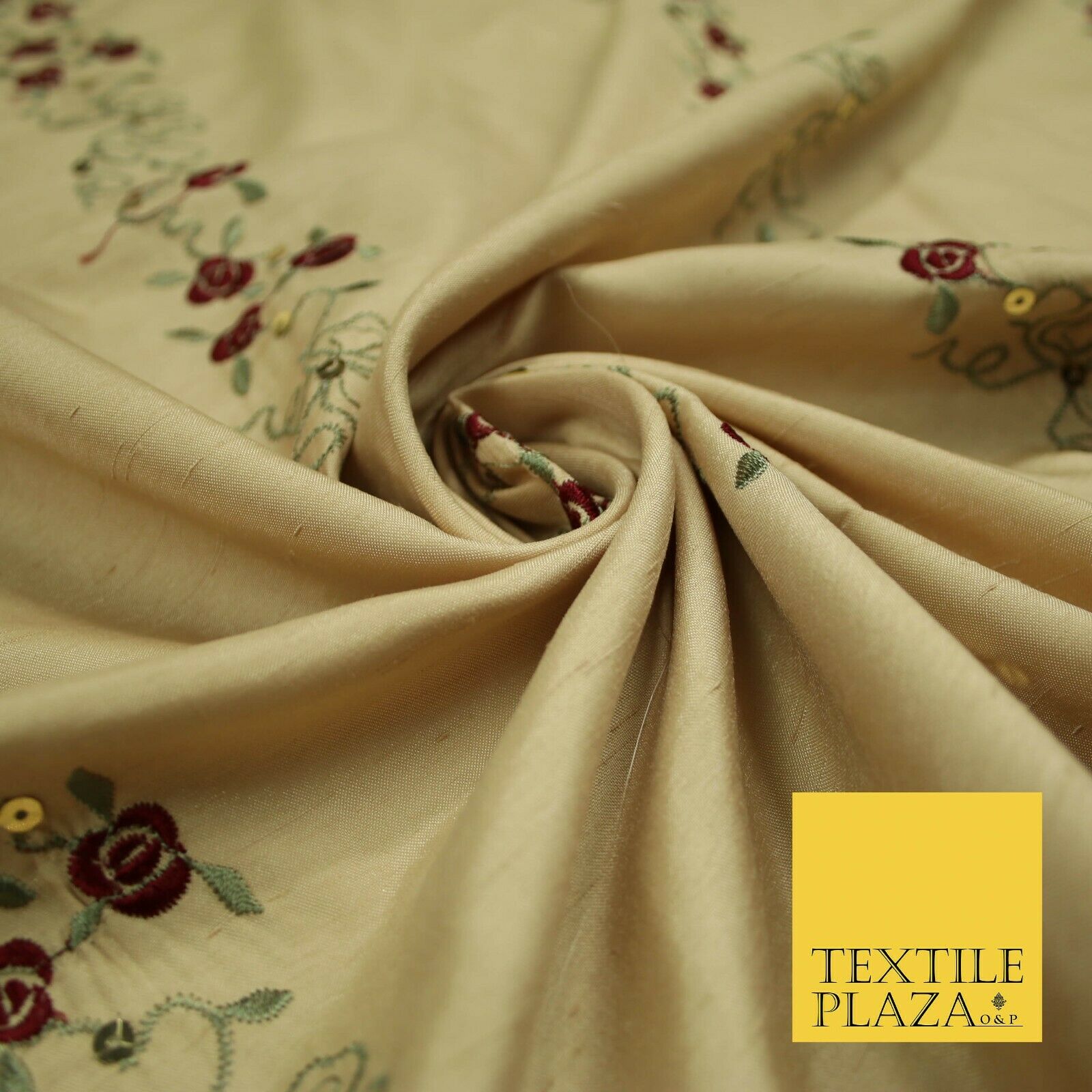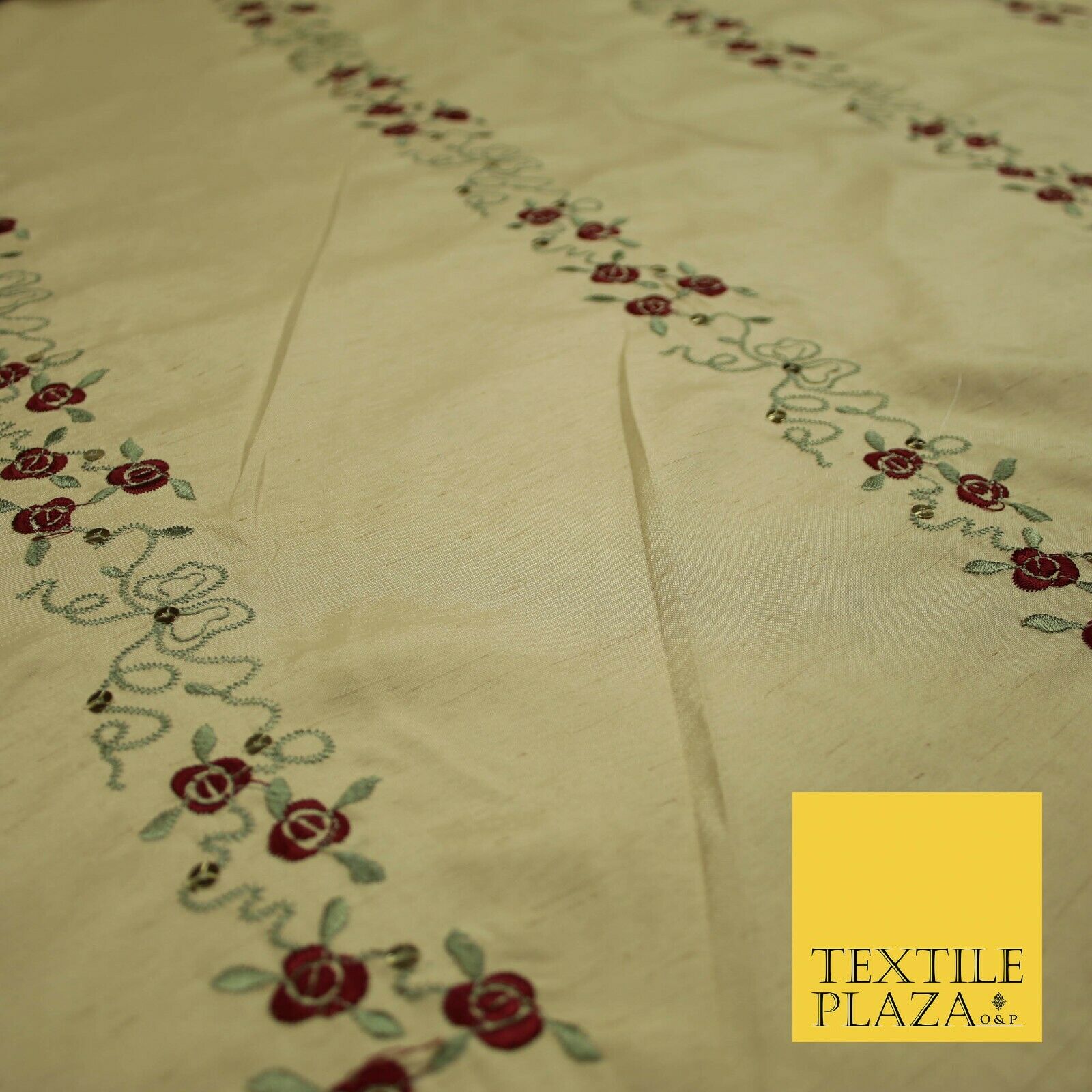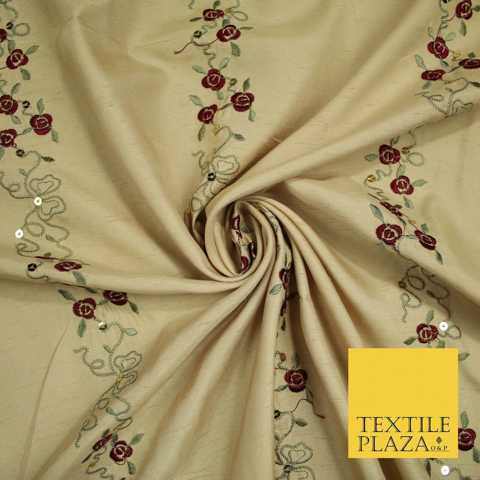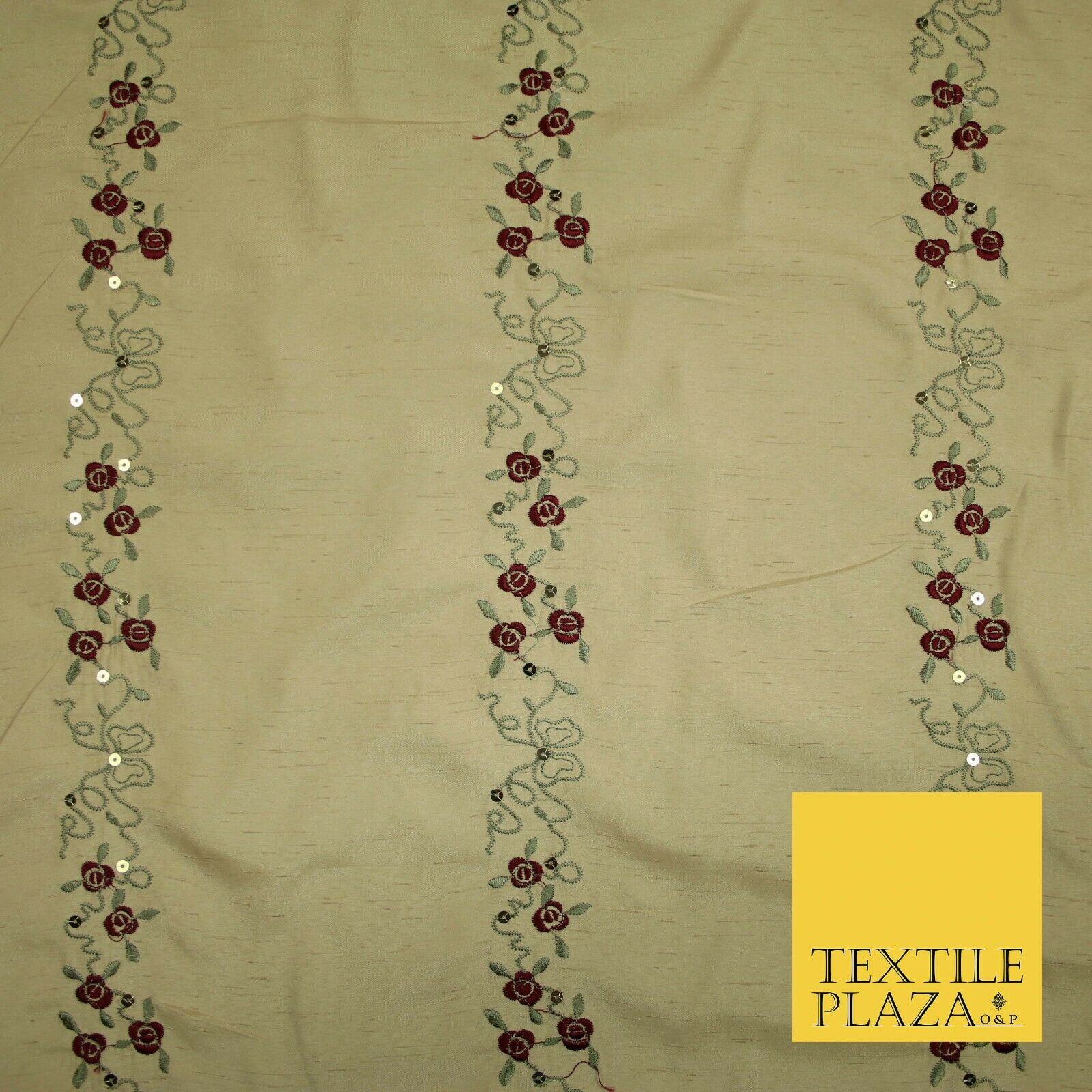 Premium Gold Floral Vine Striped Sequin Embroidered Shantung Raw Silk Fabric4688