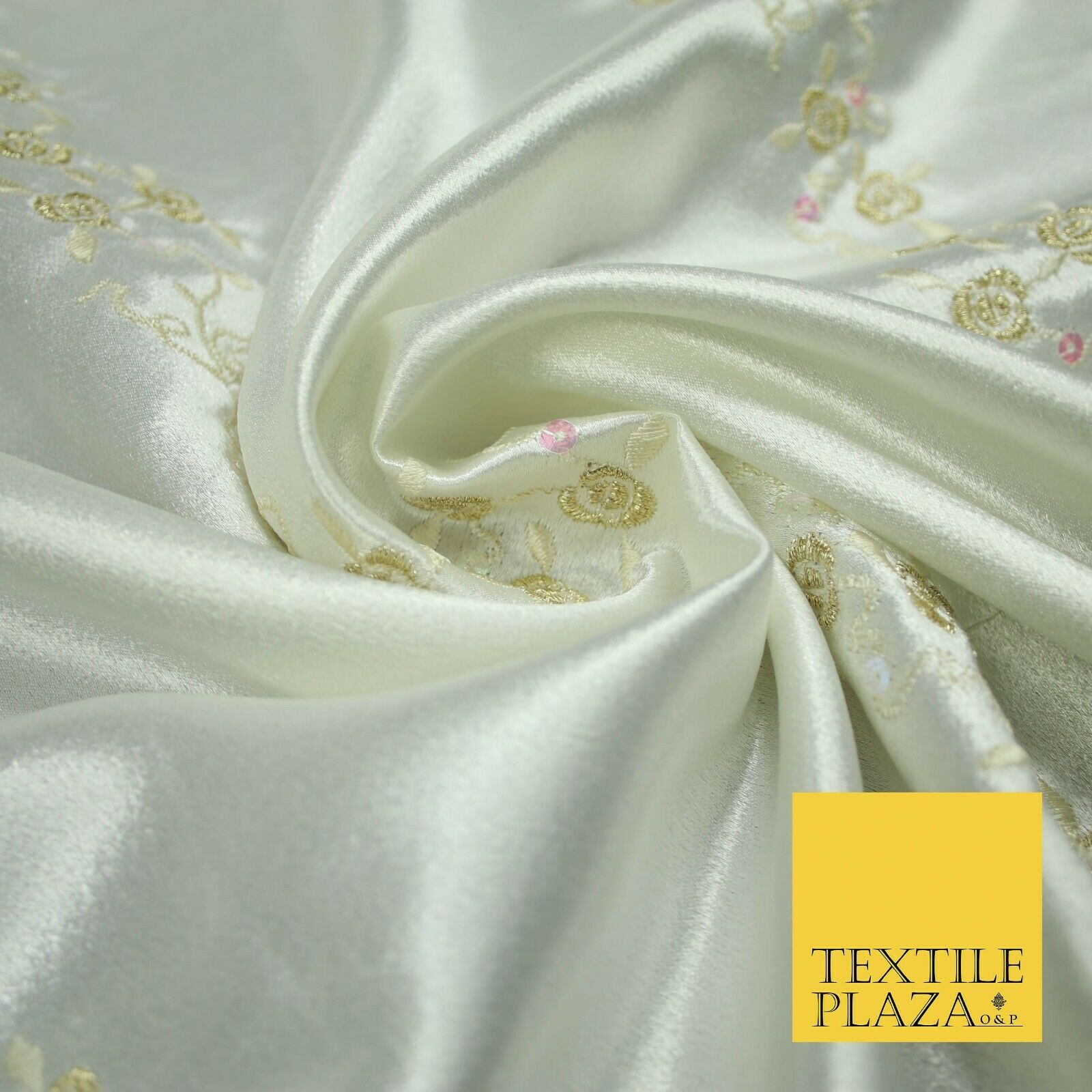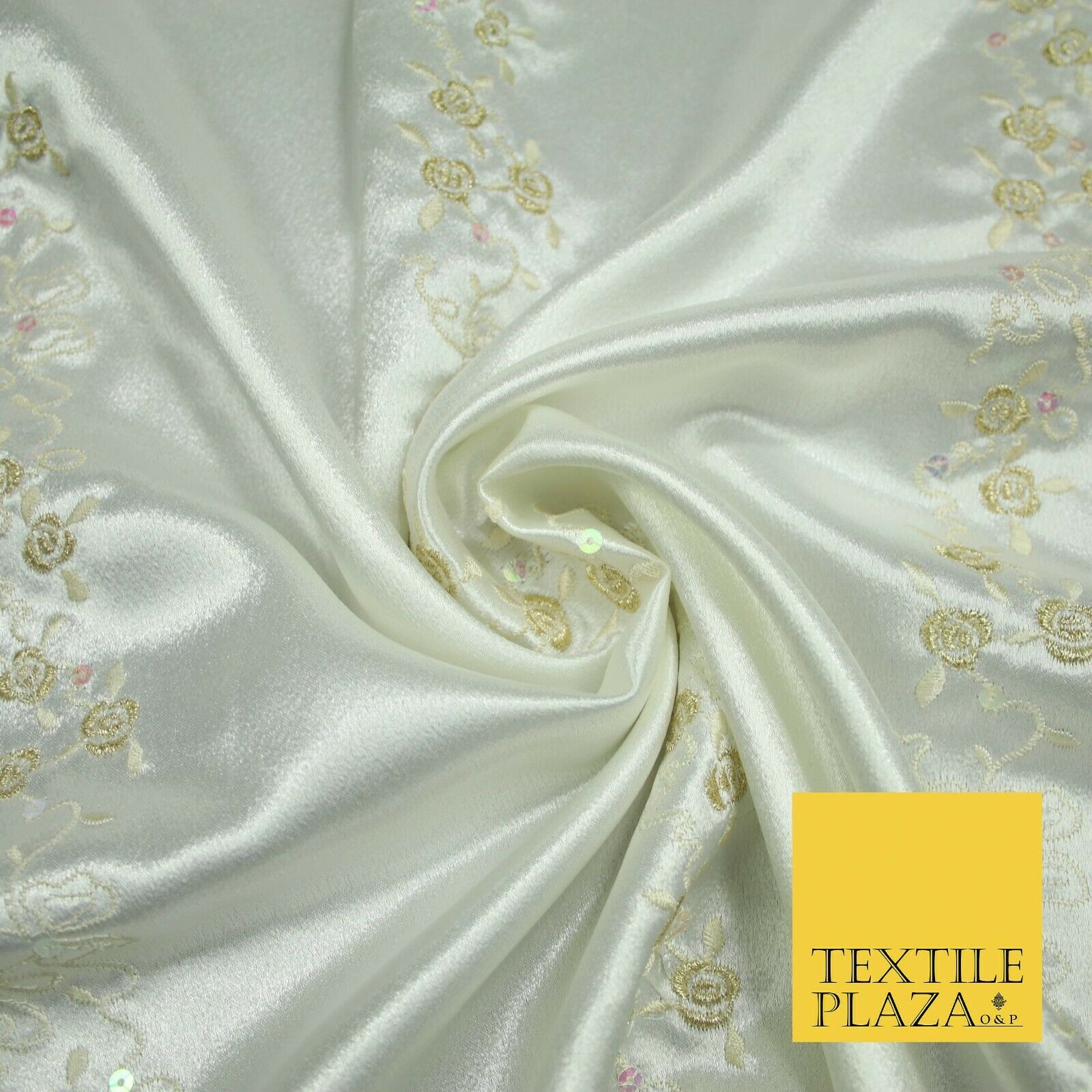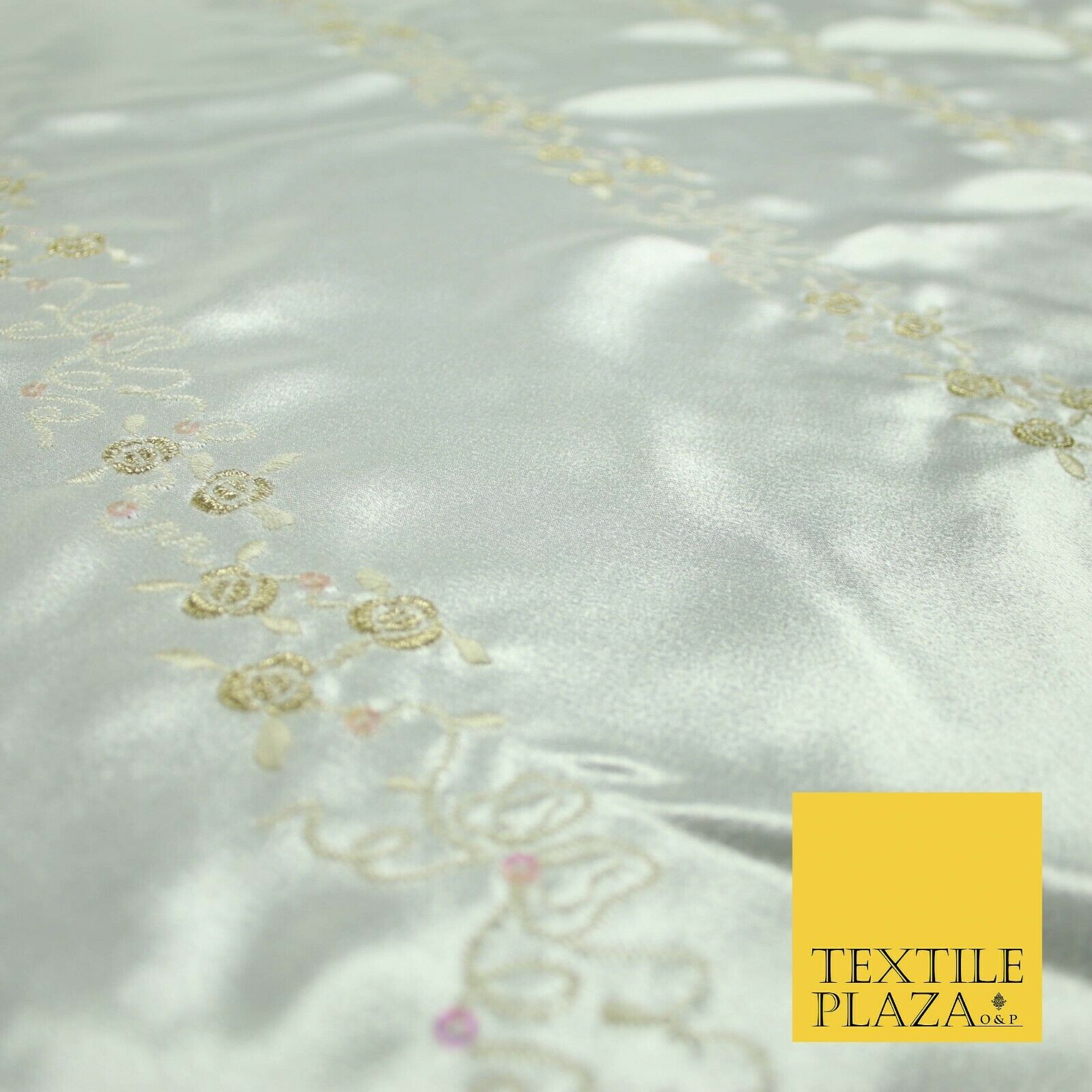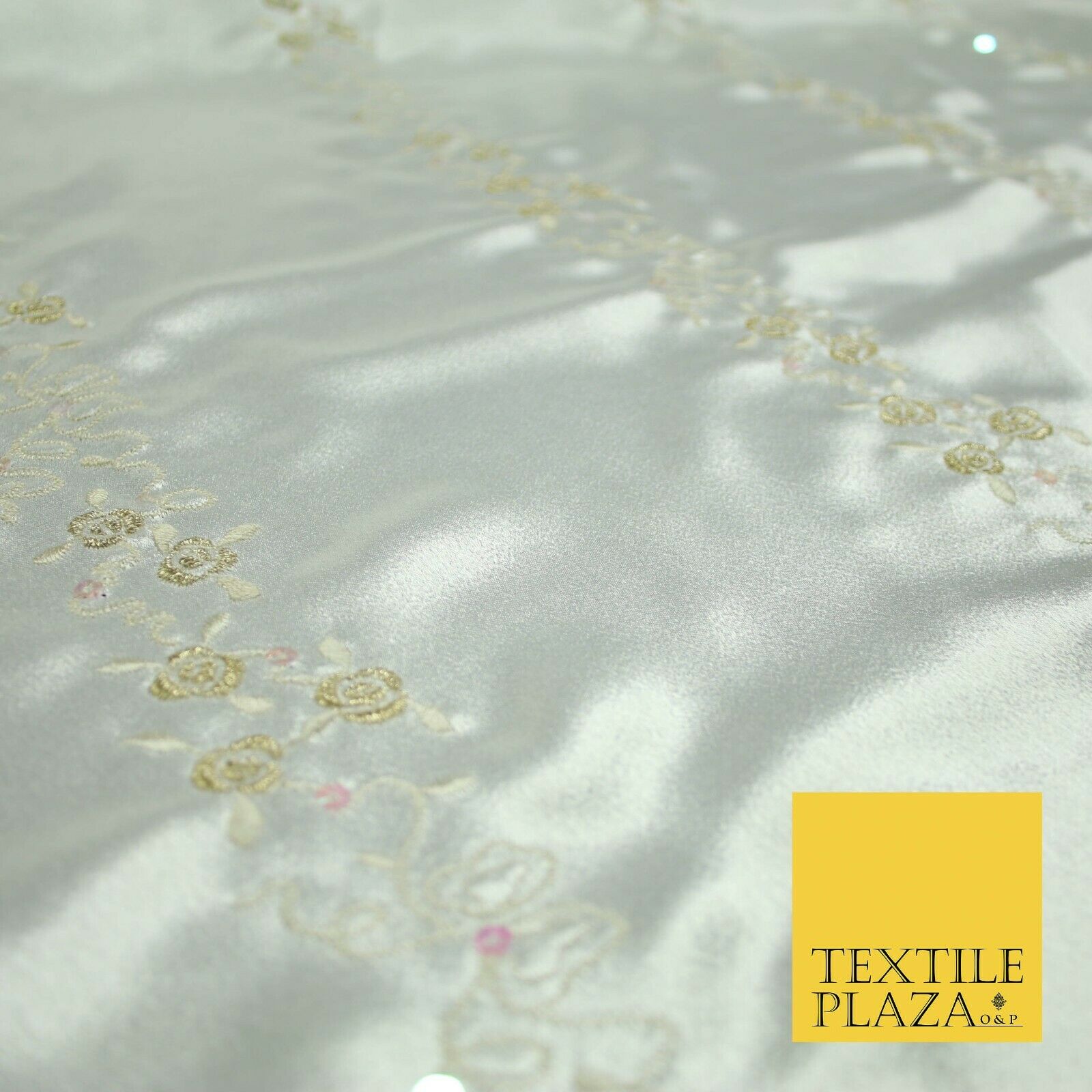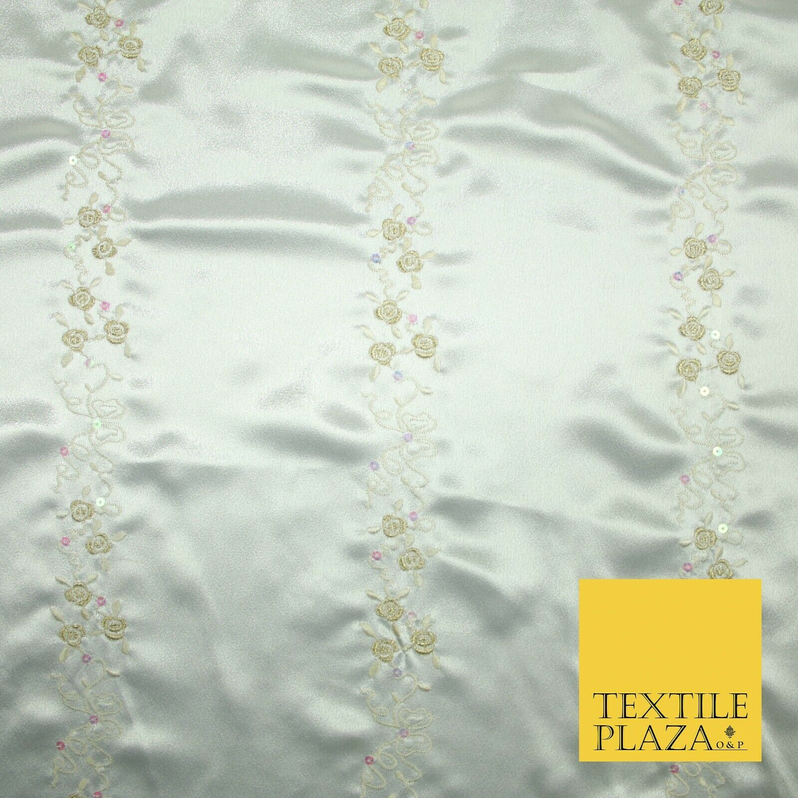 Premium Ivory Floral Rose Striped Sequin Embroidered Satin Dress Fabric 44" 4687
