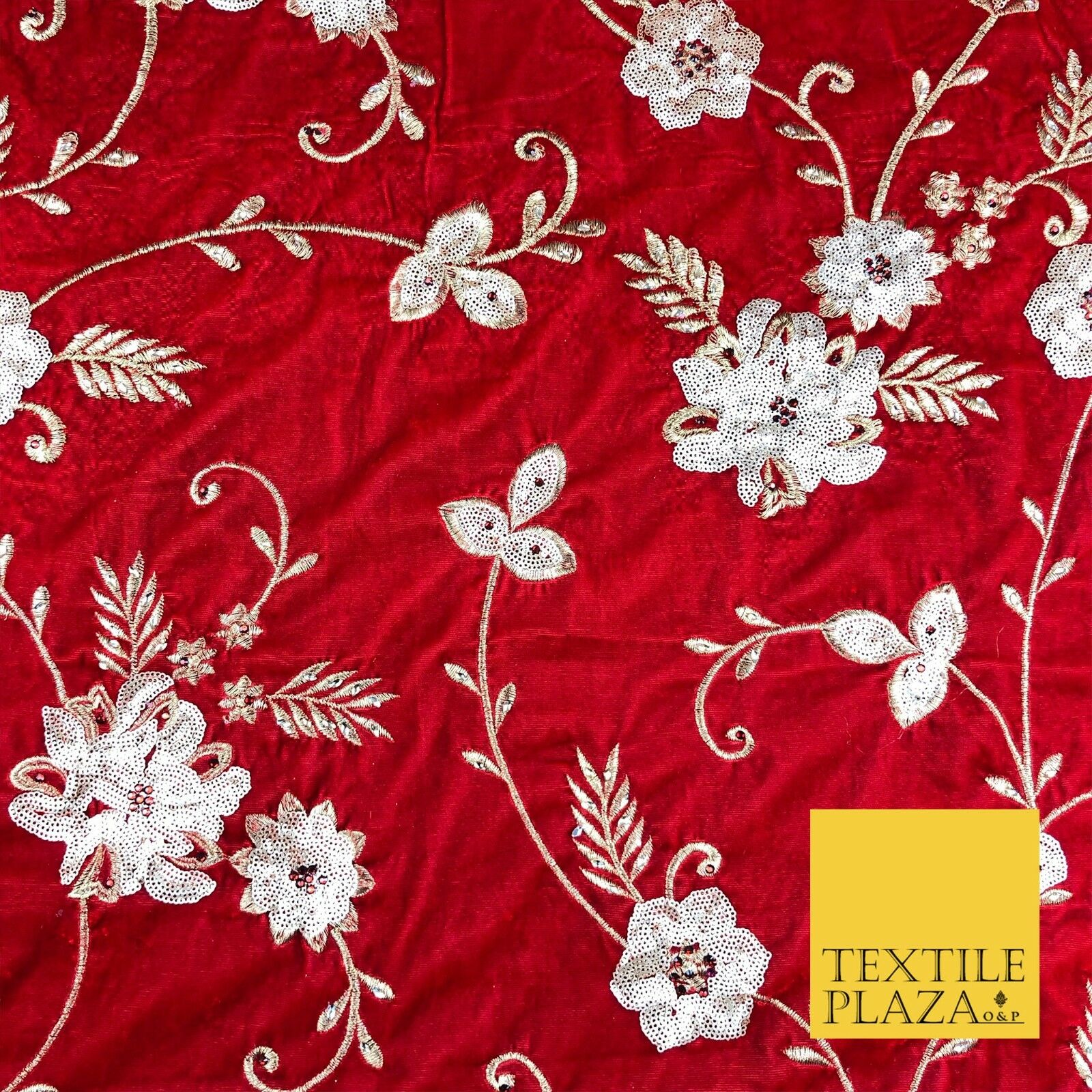 RED Fancy Ornate Floral Sequin Stonework Embroidered Velvet Dress Fabric 1089