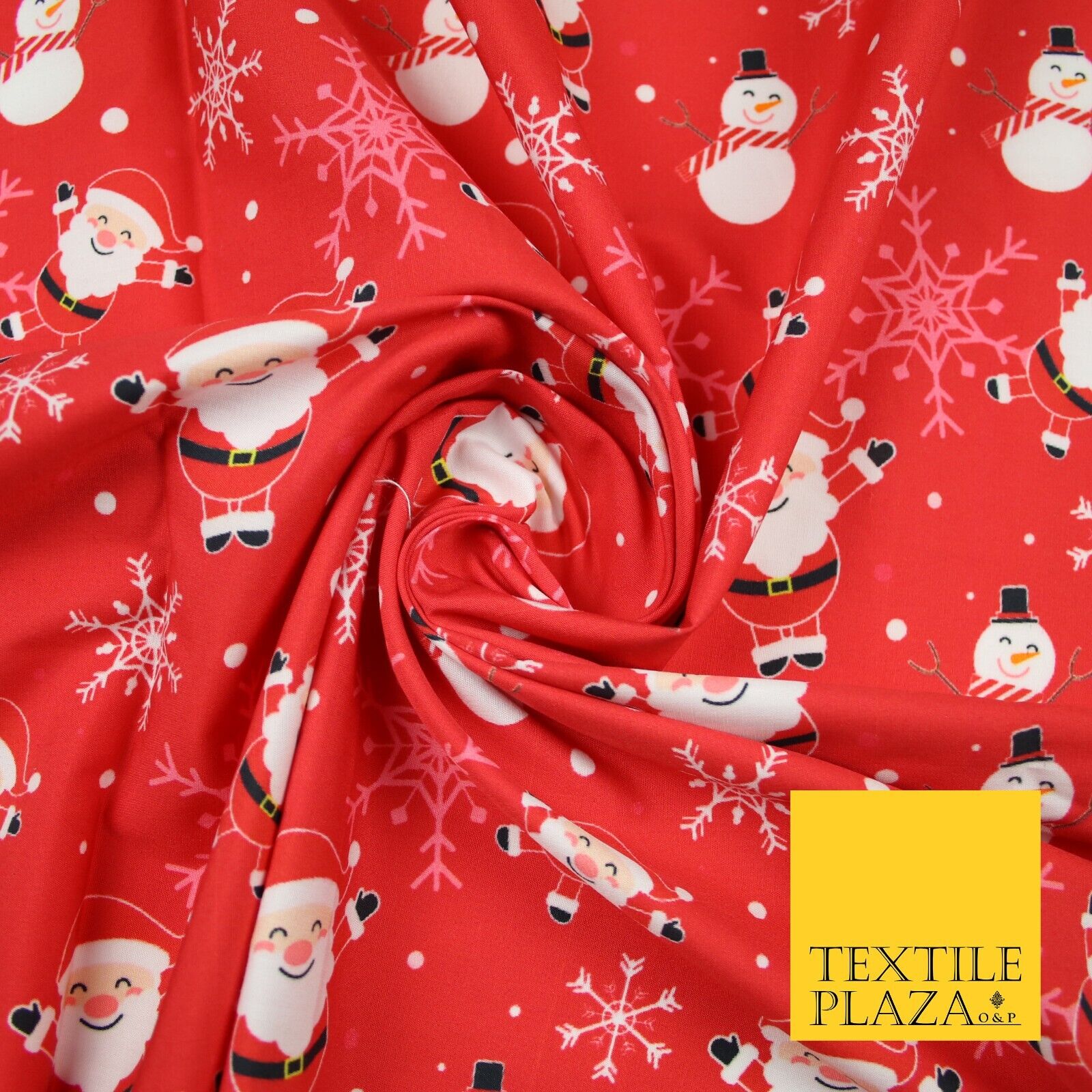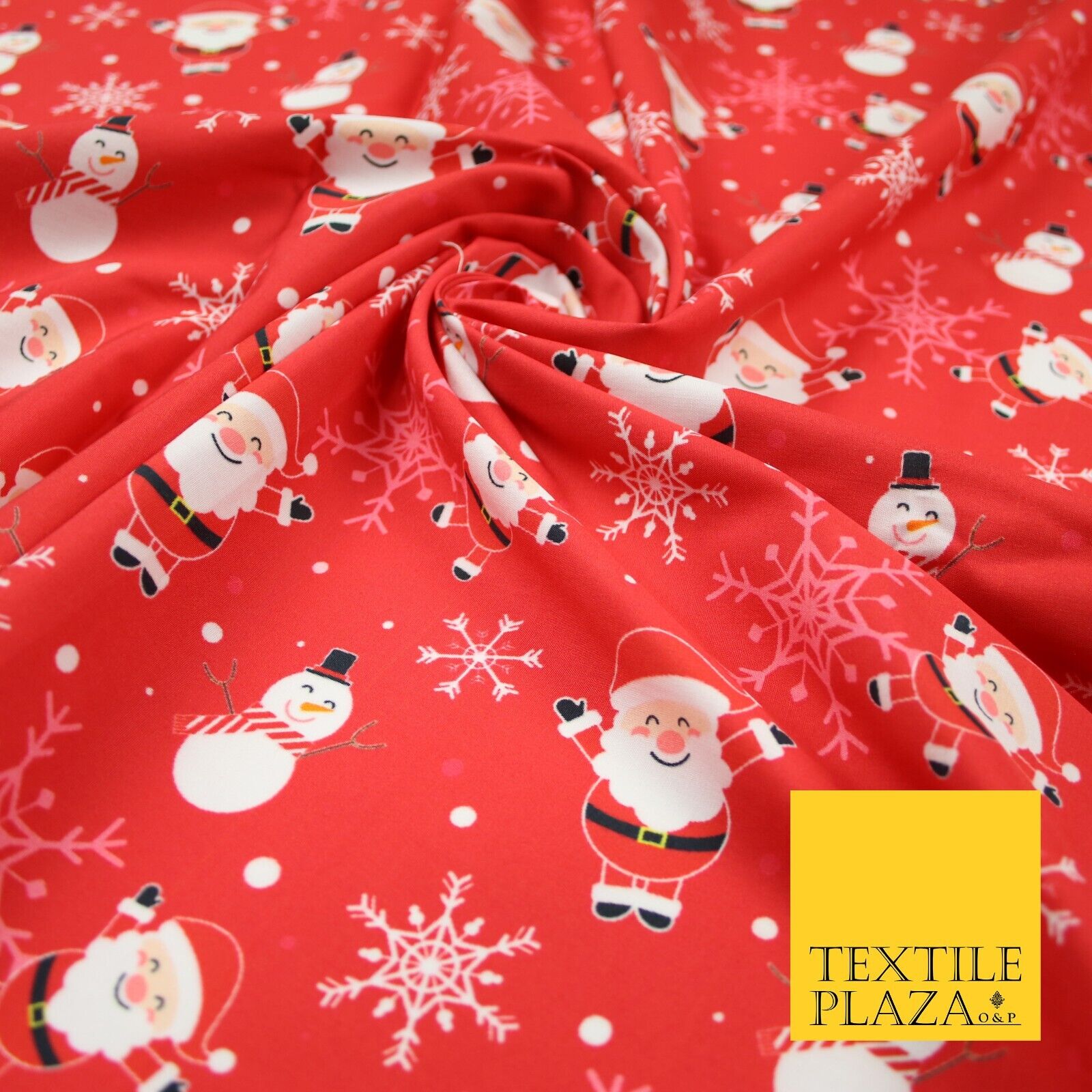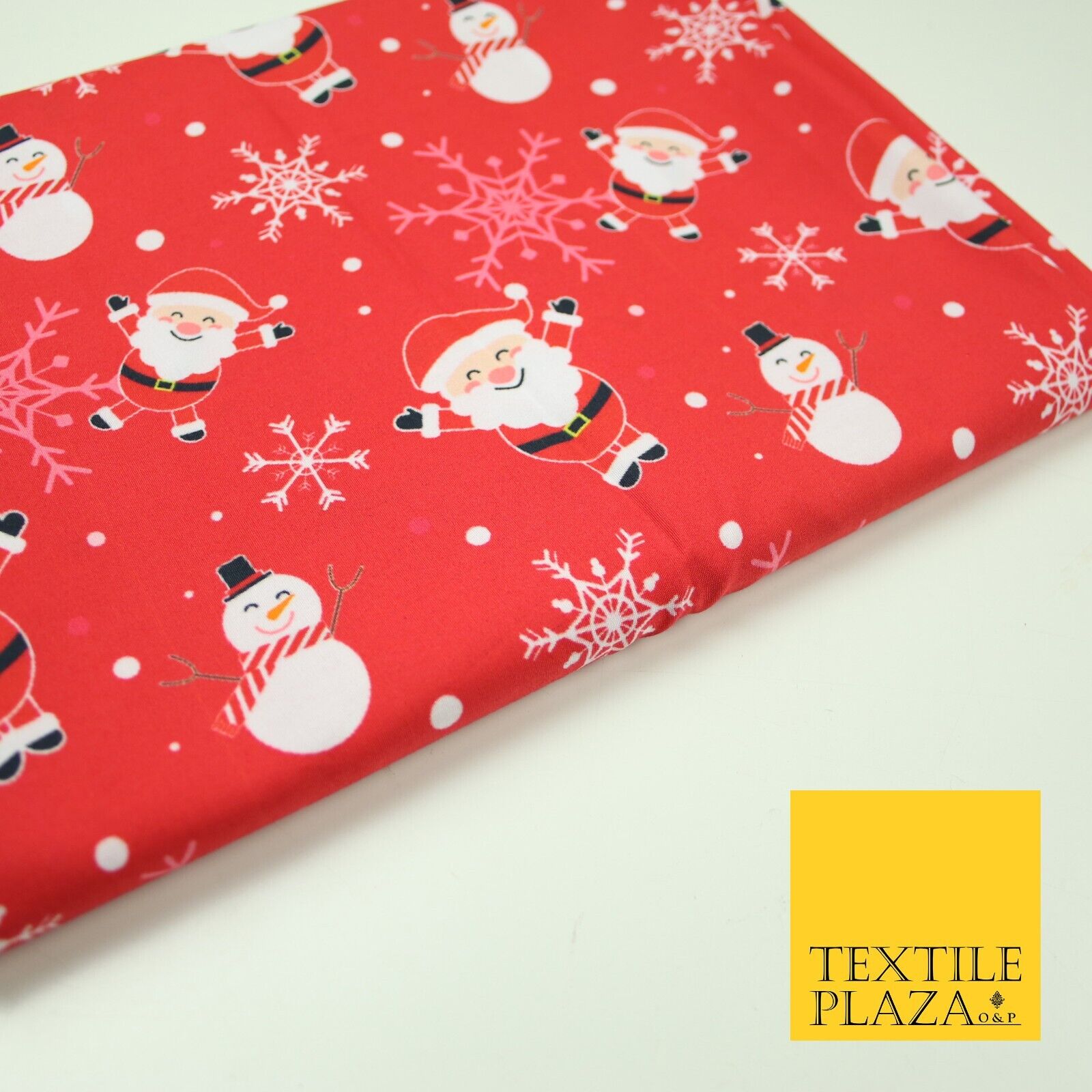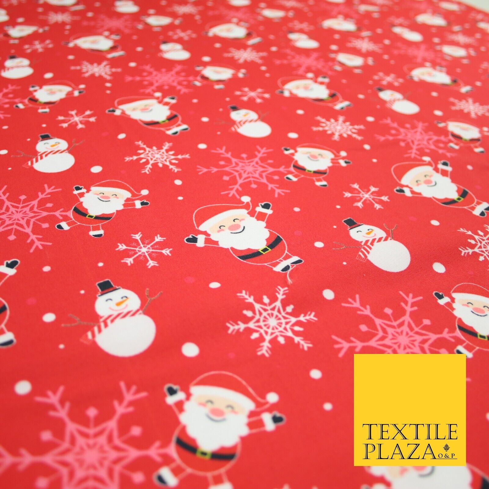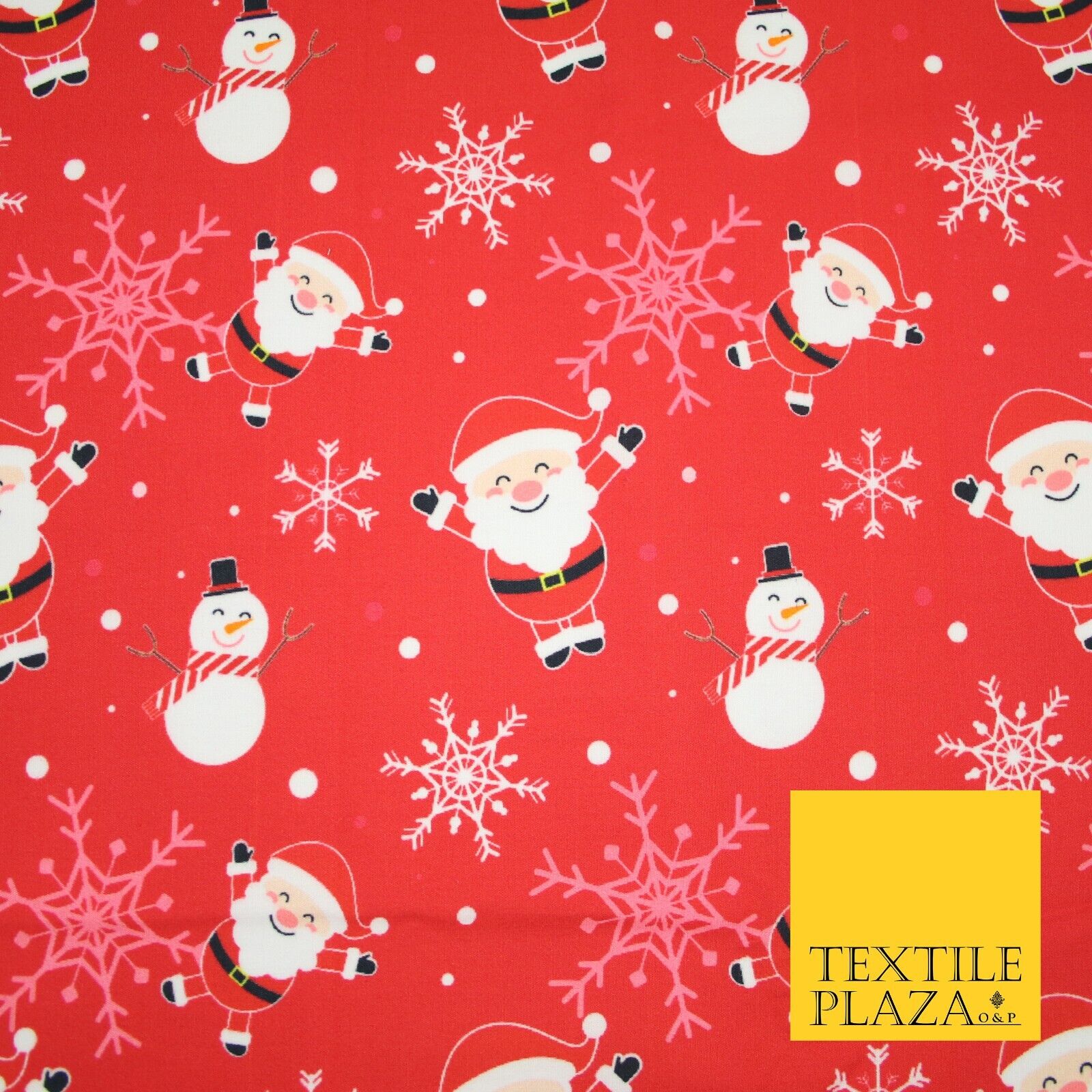 Red Festive Christmas Happy Santa Snowman Snowflakes 100% Cotton Fabric 7355