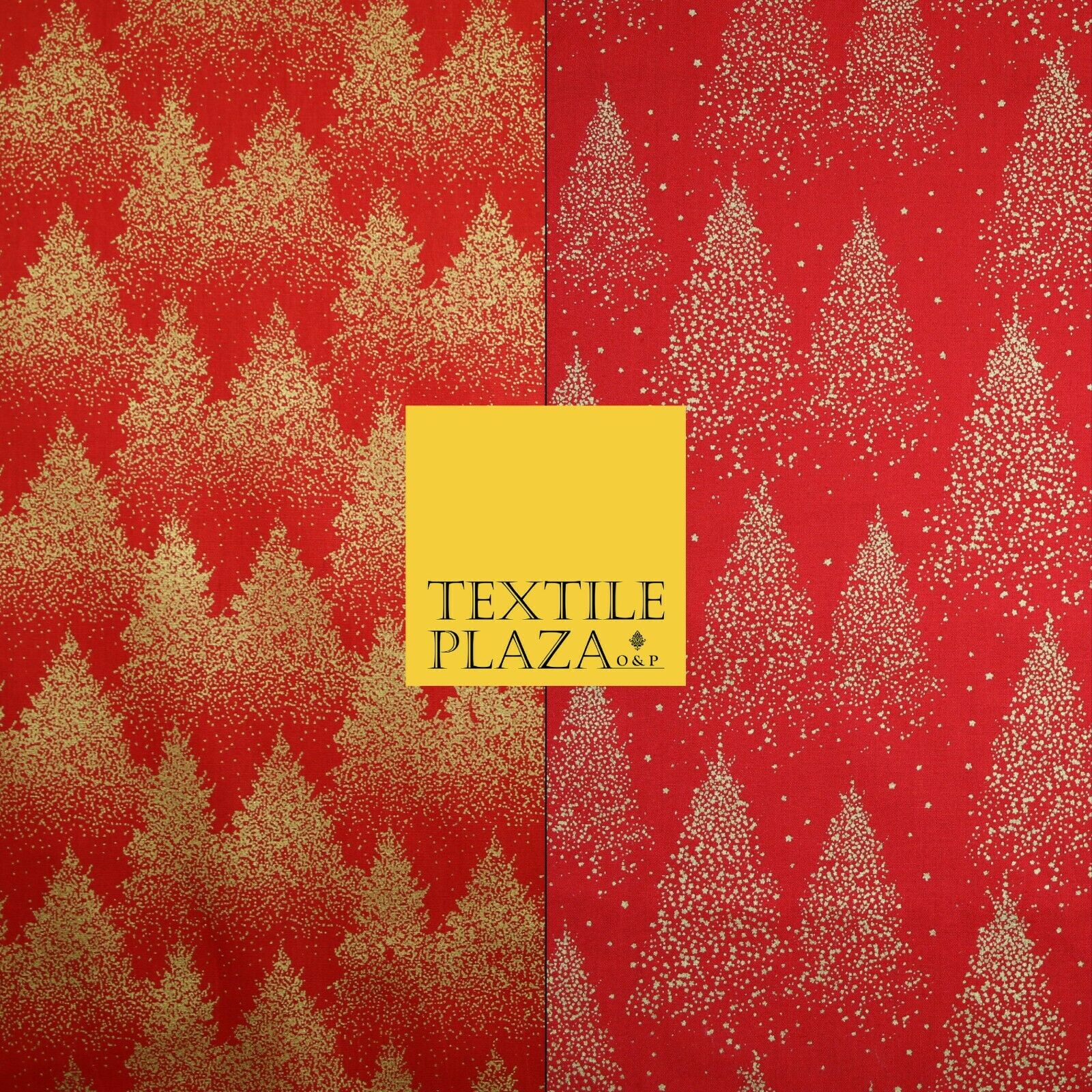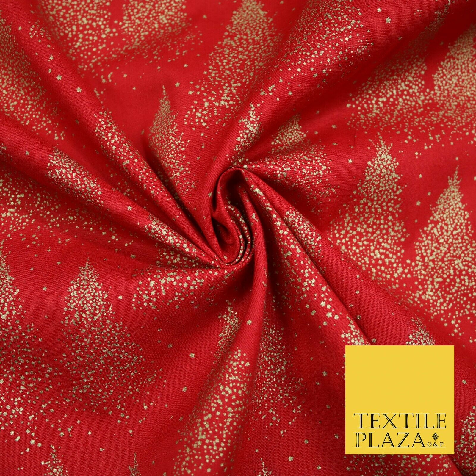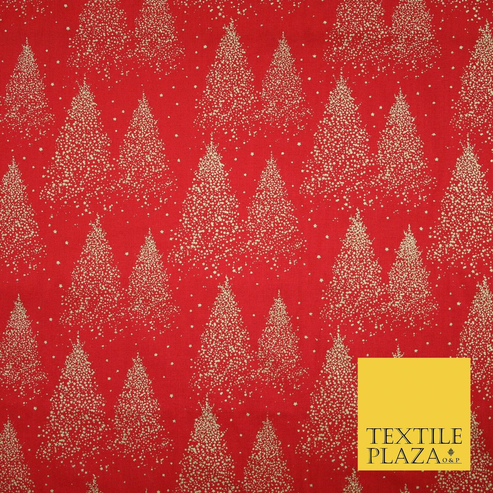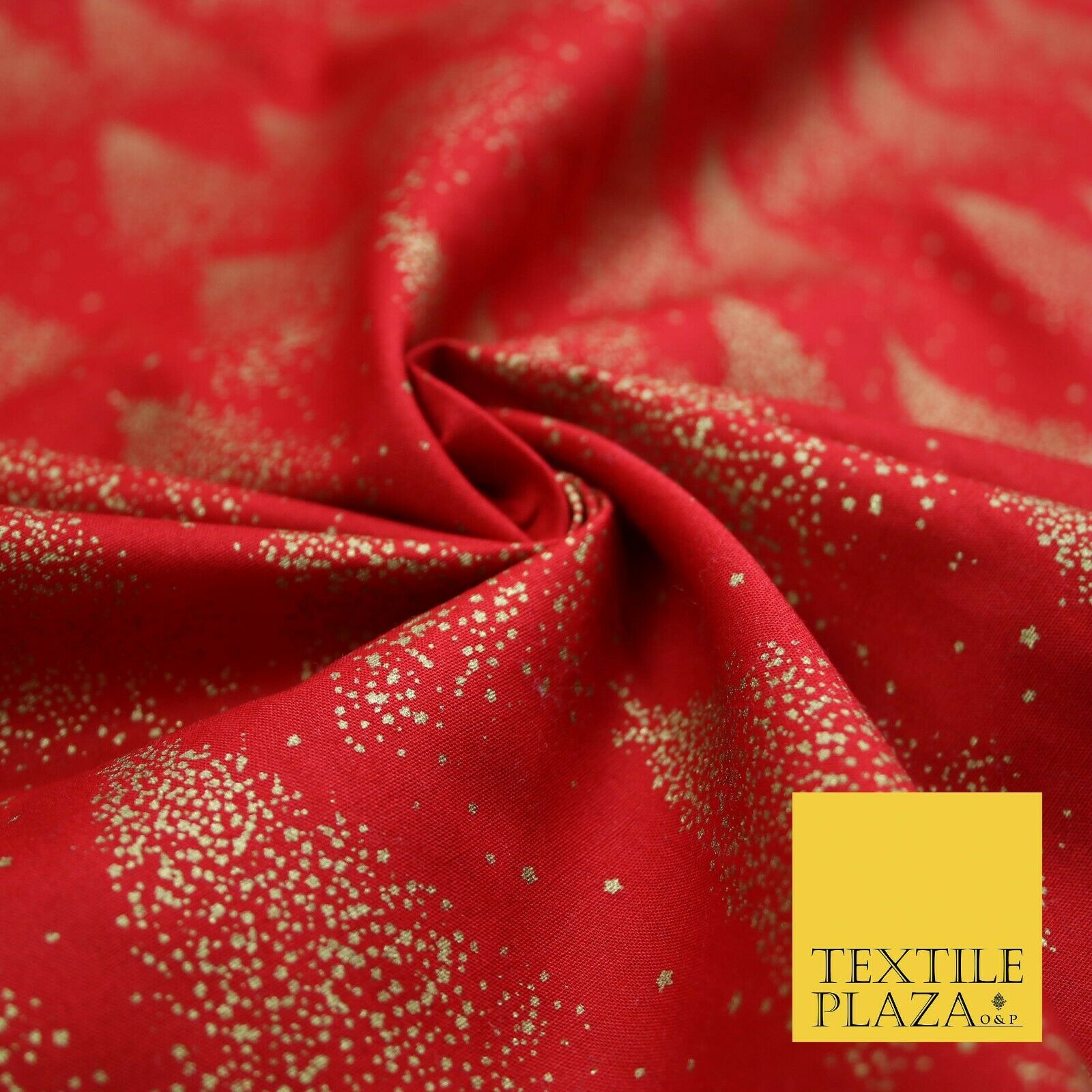 Red Festive Mini Gold Stars Scatter Christmas Trees 100% Cotton Fabric 56" Wide