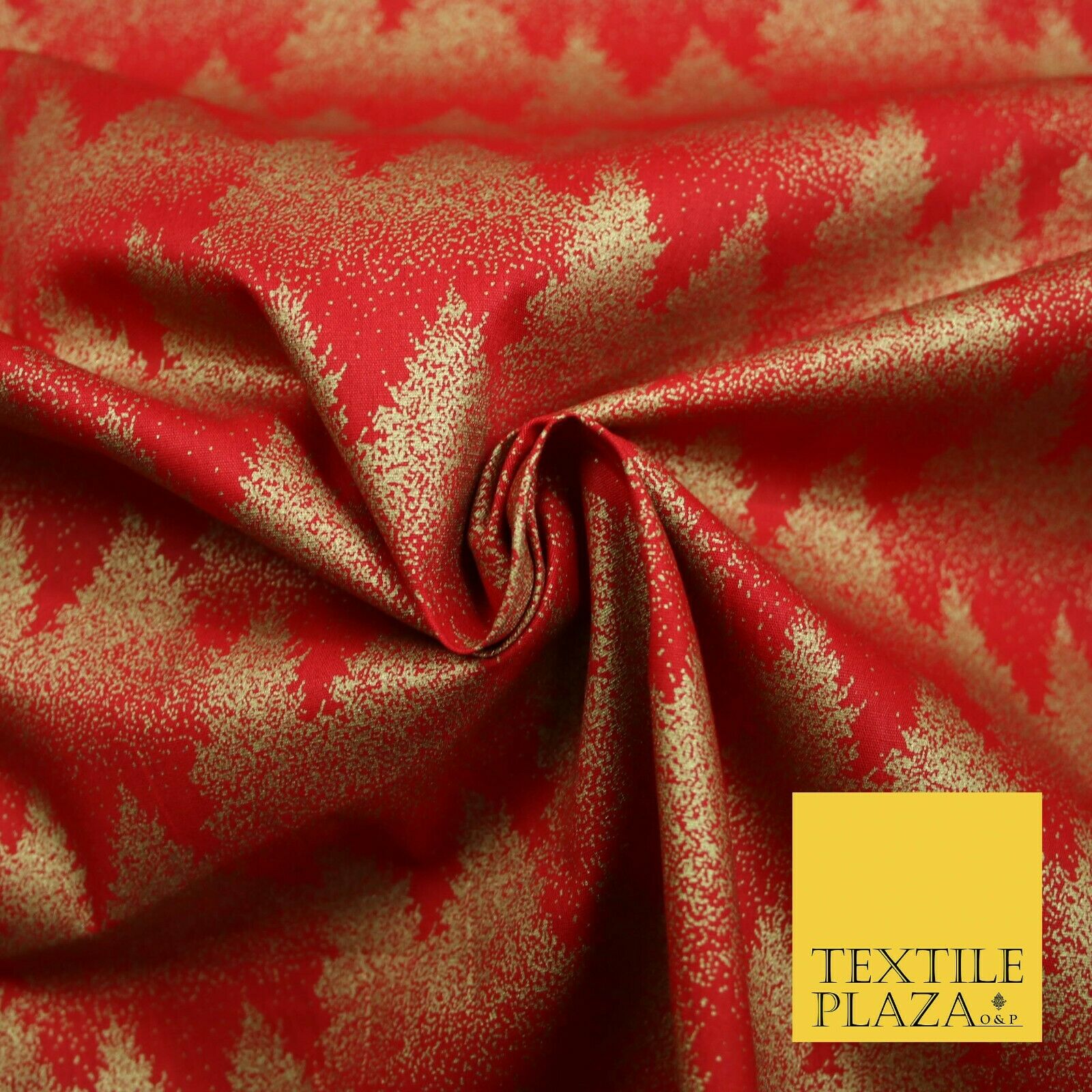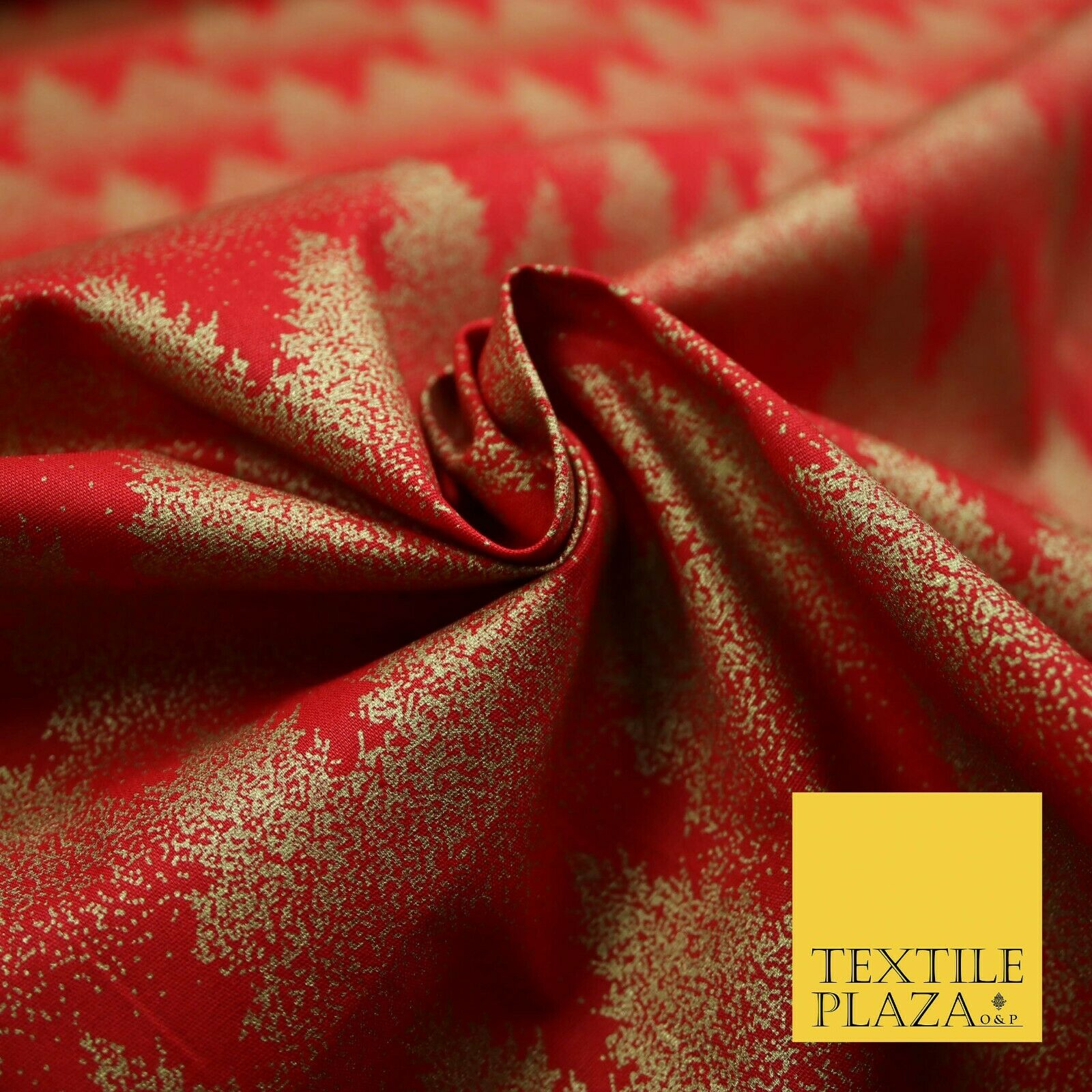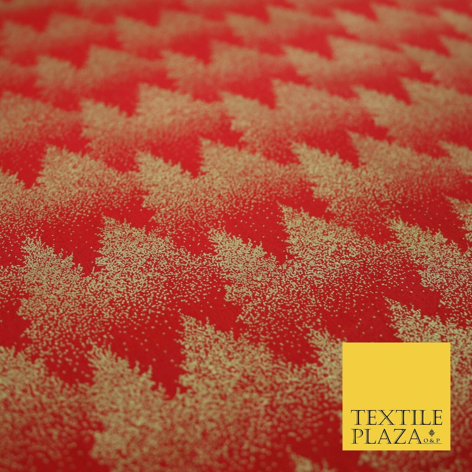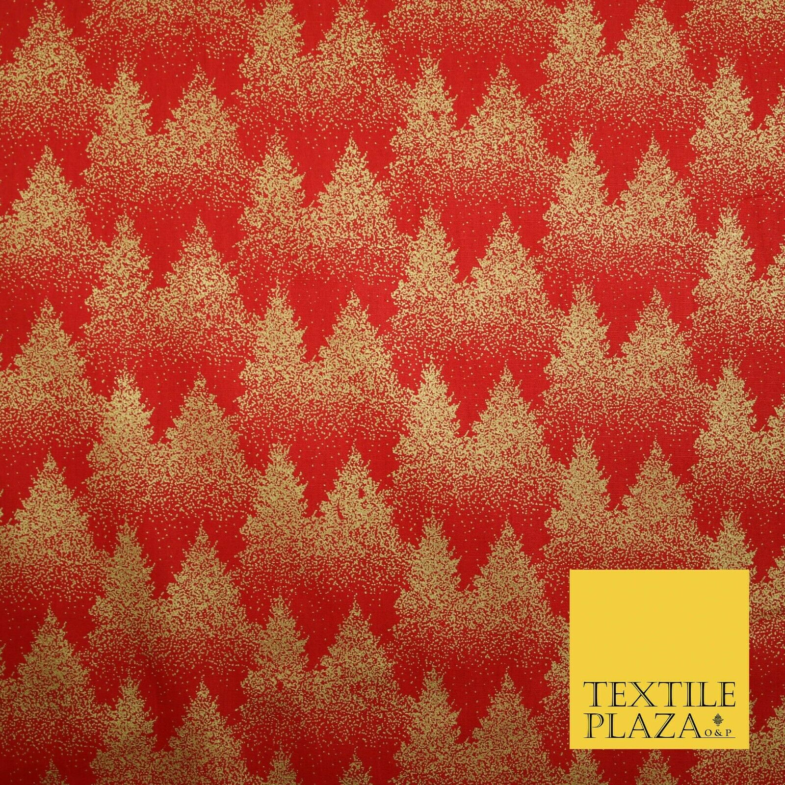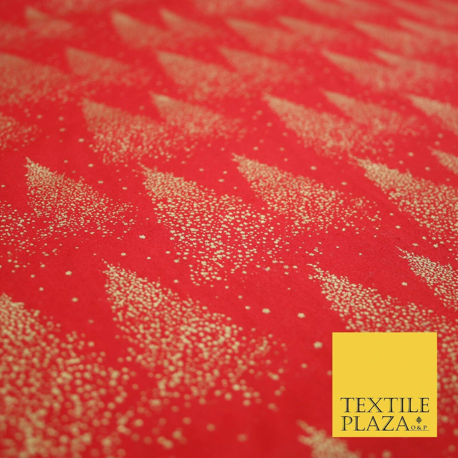 Red Festive Mini Gold Stars Scatter Christmas Trees 100% Cotton Fabric 56" Wide