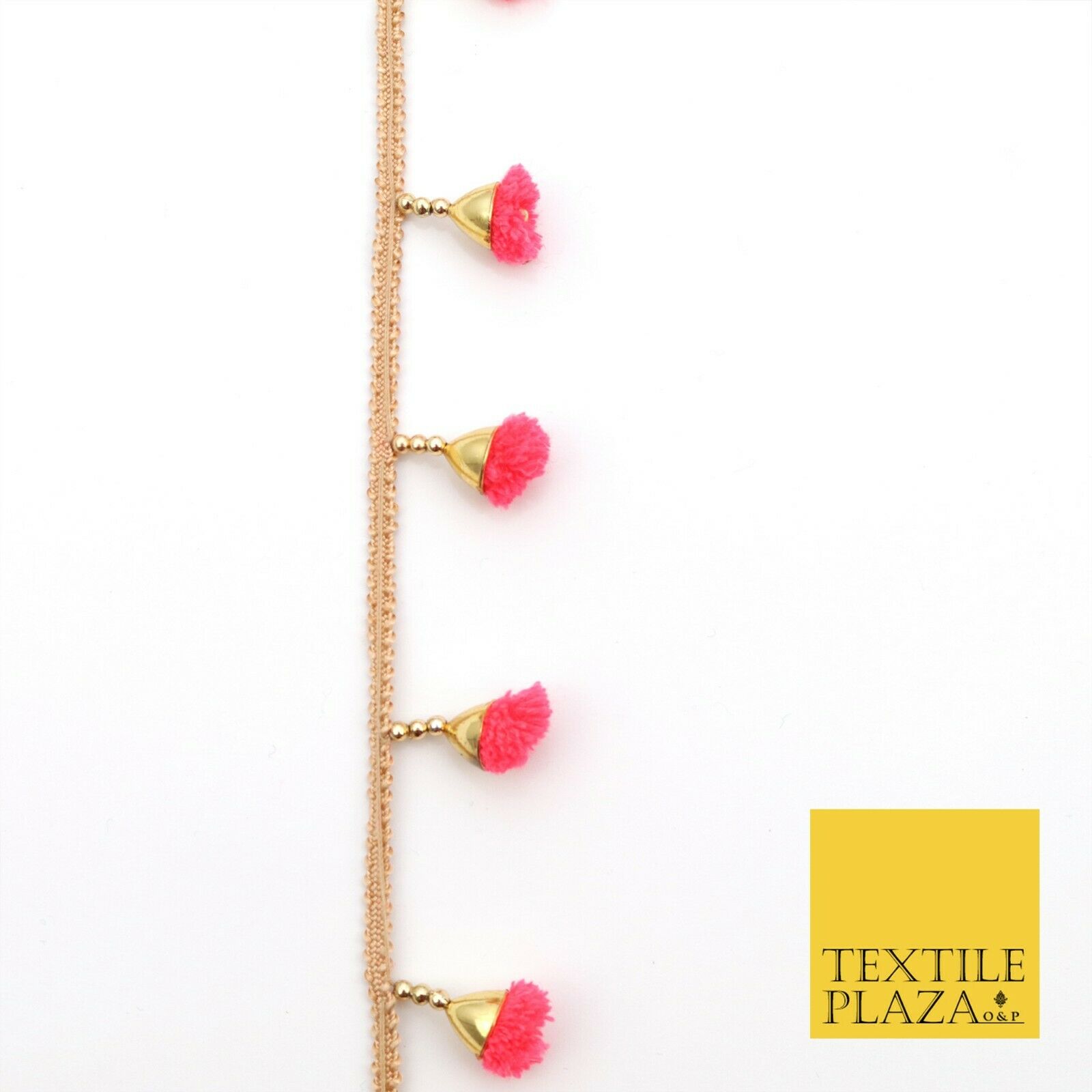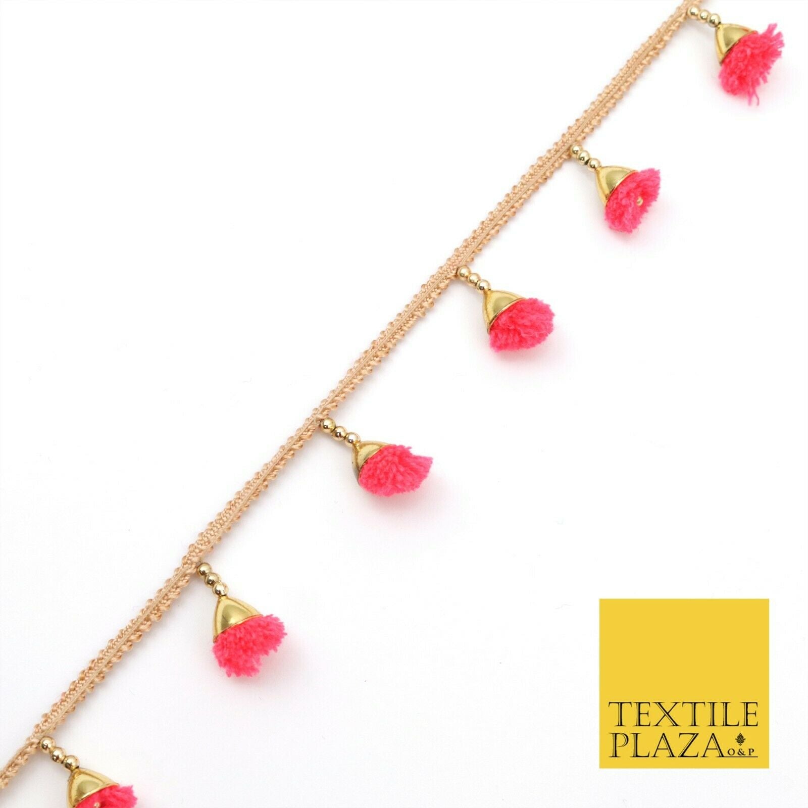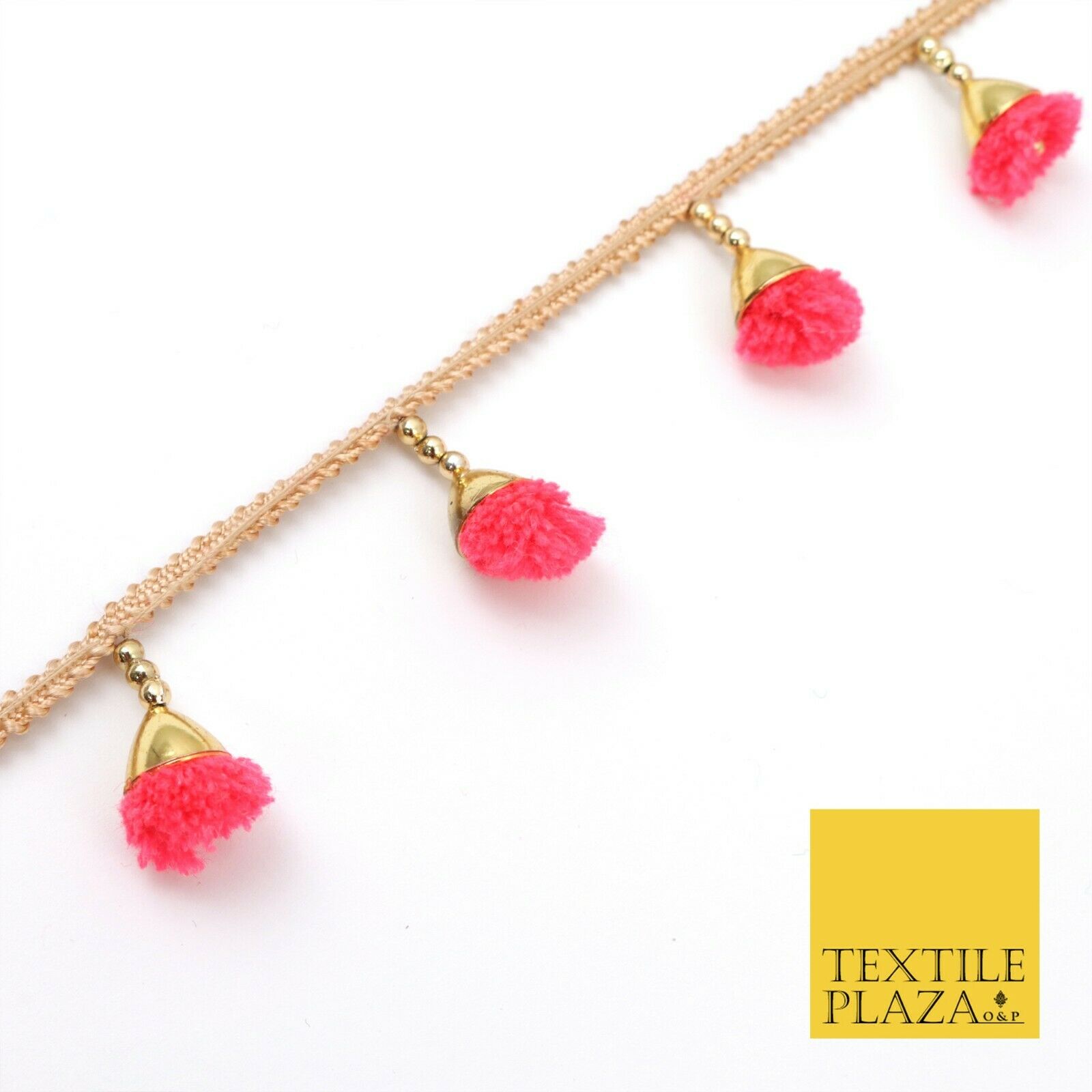 SALMON PINK Pom Pom Tassels Indian Woven Gold Trim Ribbon Border LaceEthnic X257