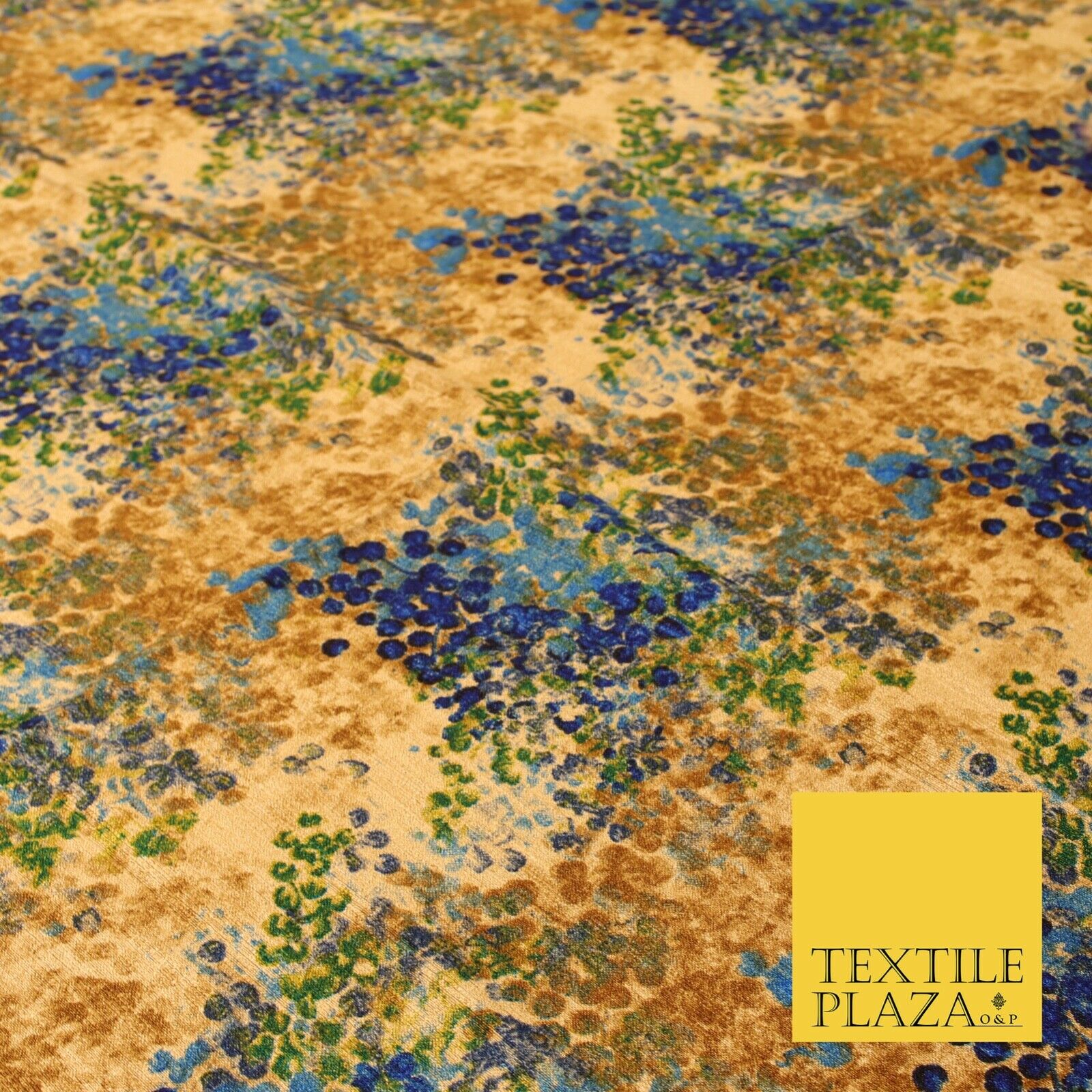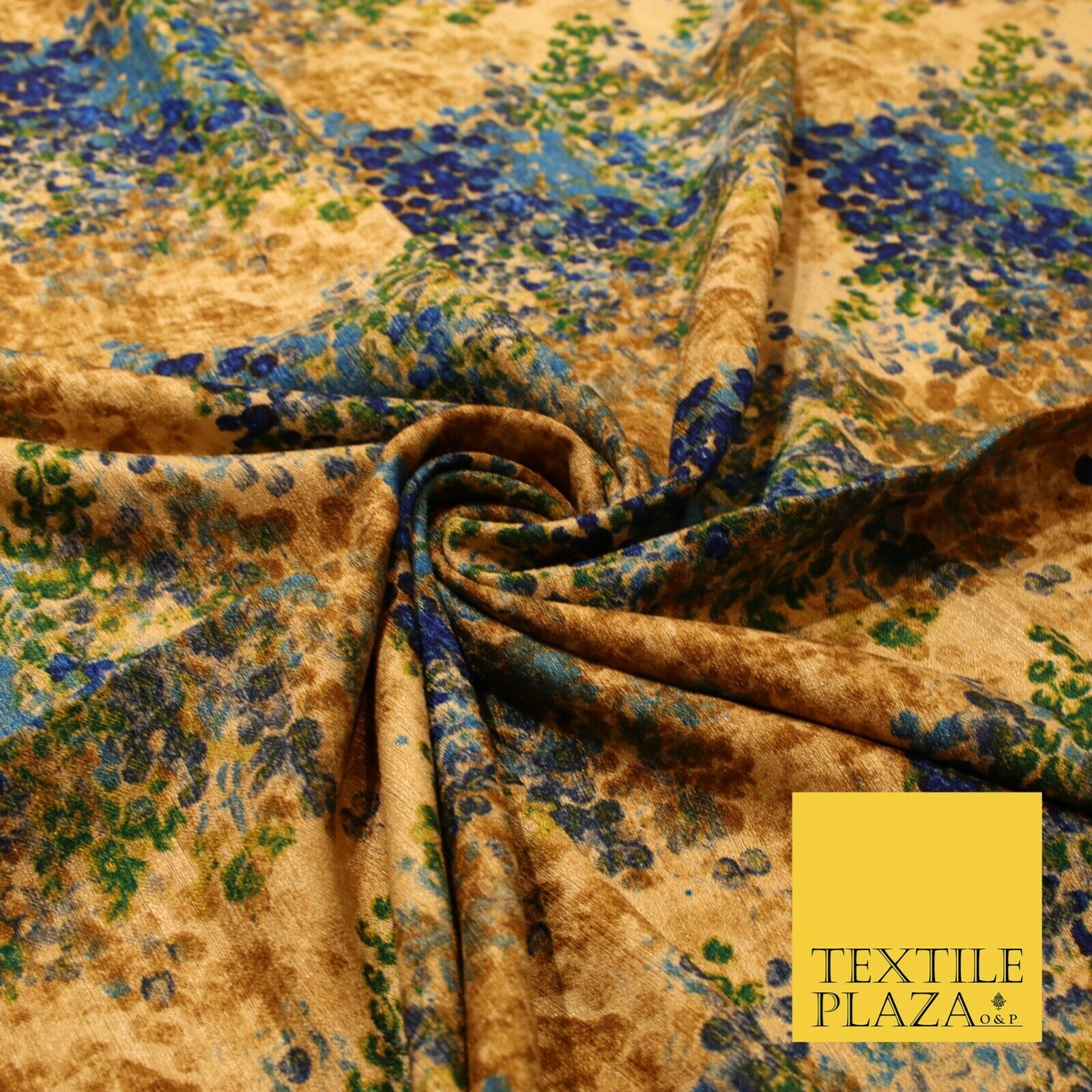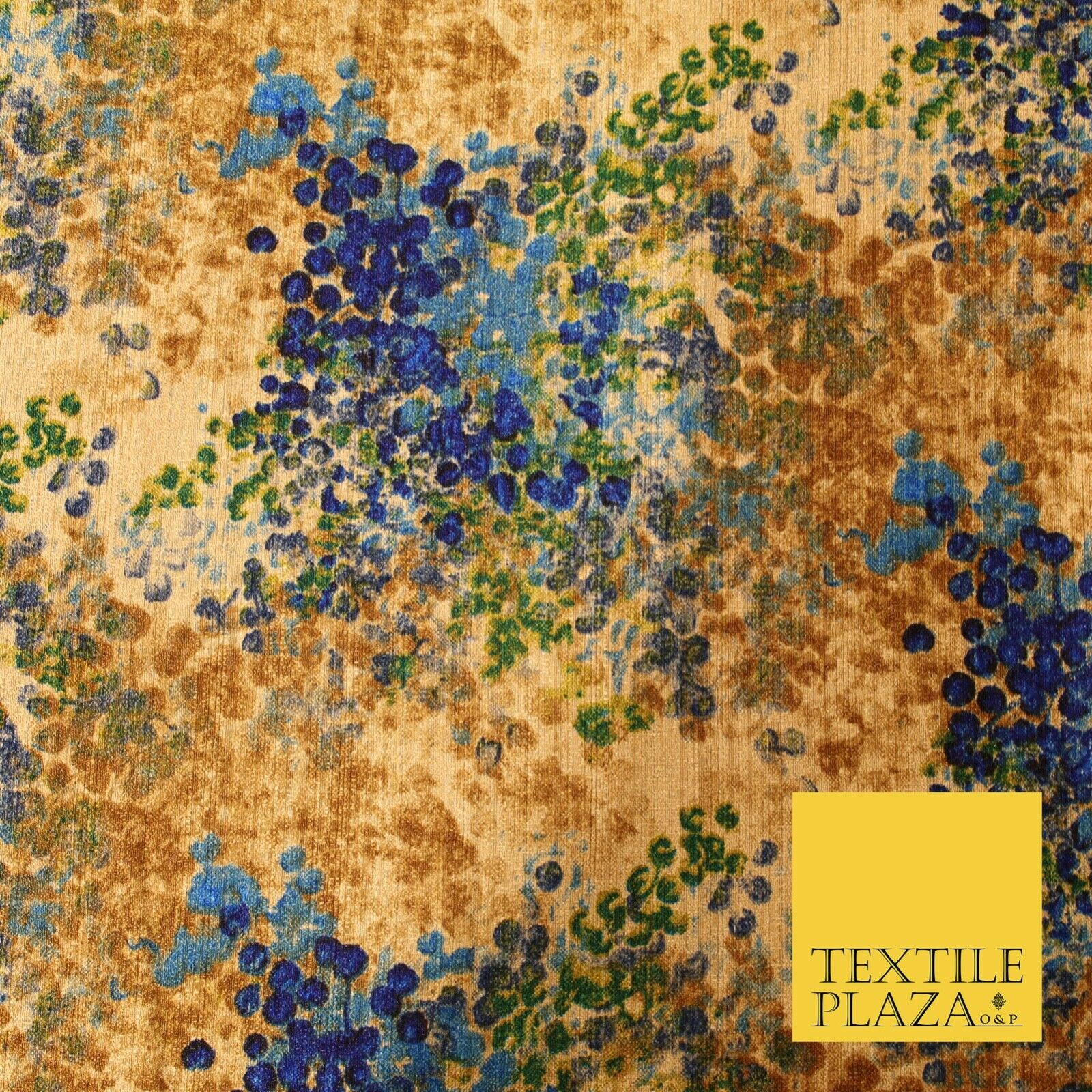 Sand Gold Blue Abstract Art Floral Digital Print Faux Raw Silk Dress Fabric 3022
