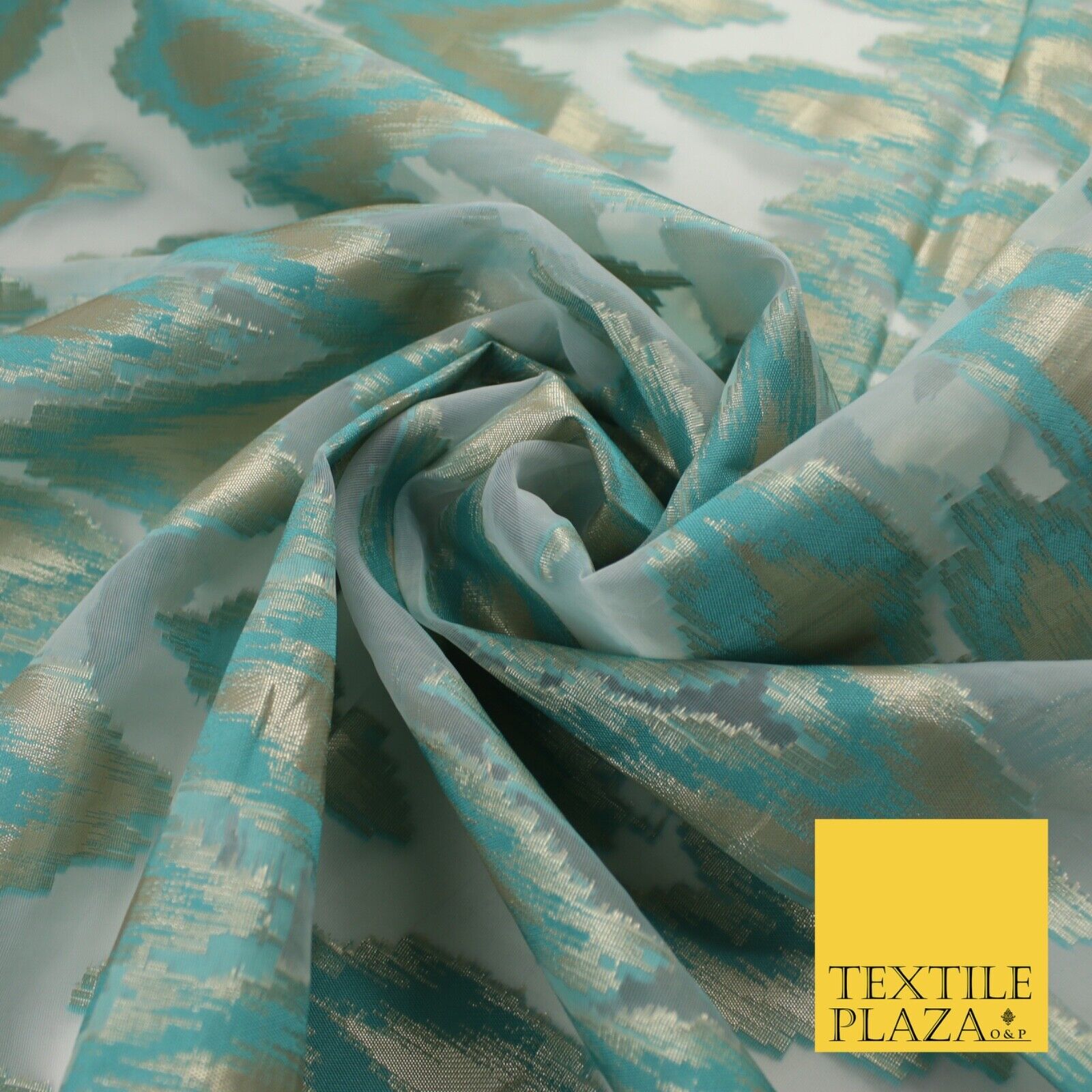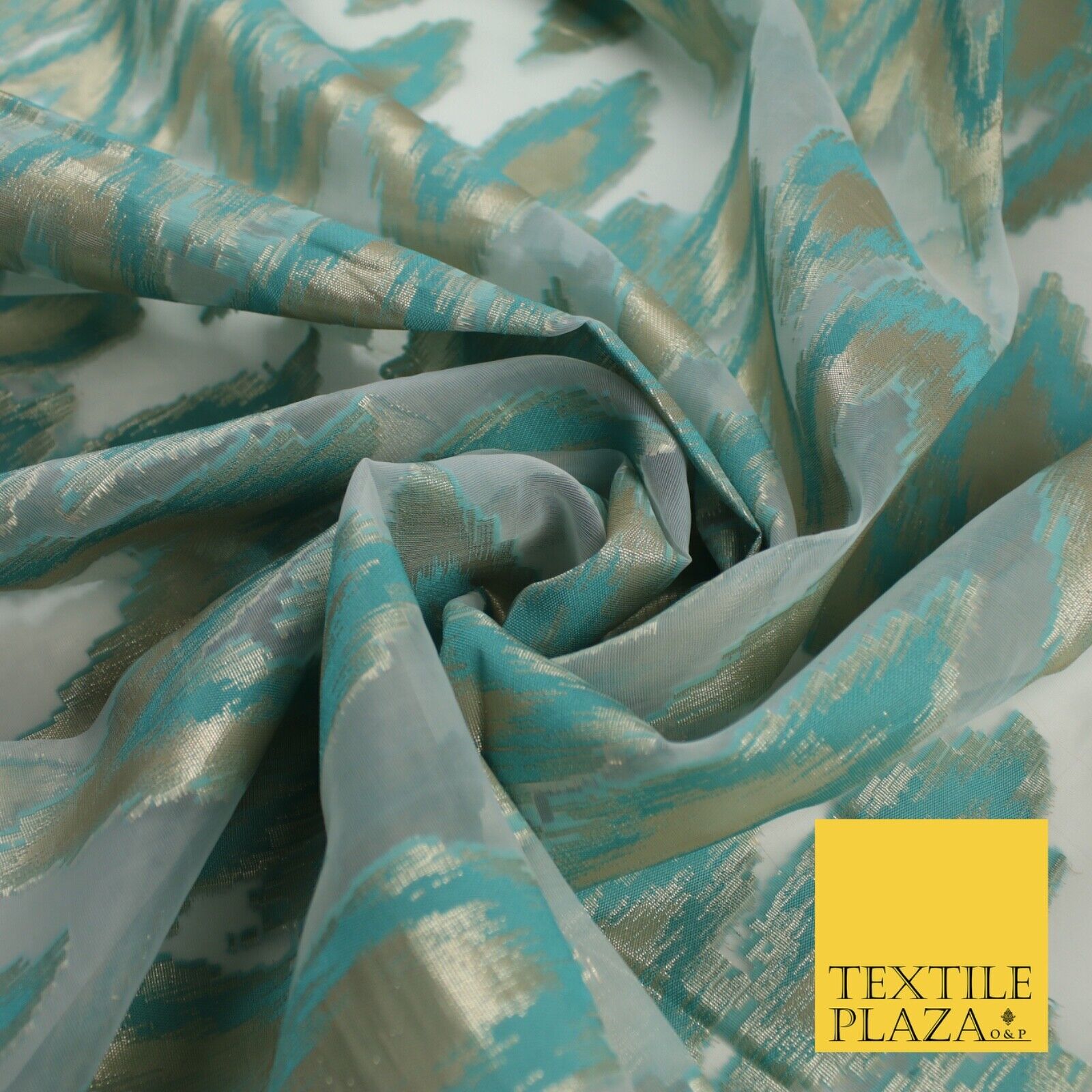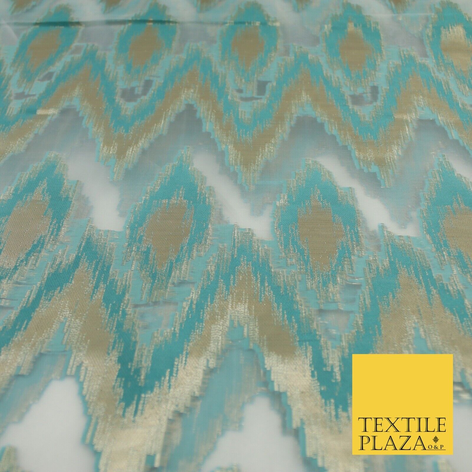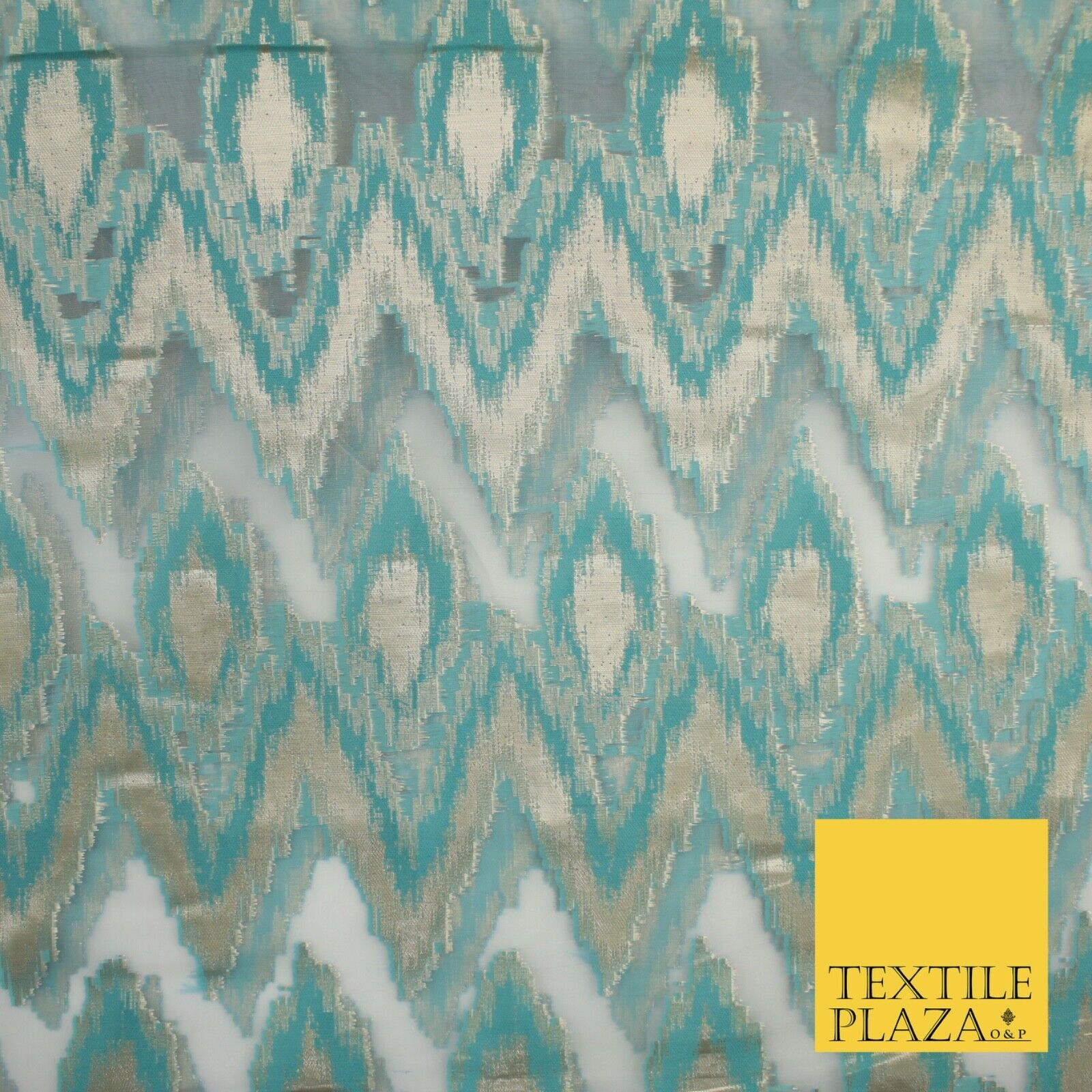 Sea Green Beige ZigZag Retro Metallic Abstract Textured Organza Fabric 9913