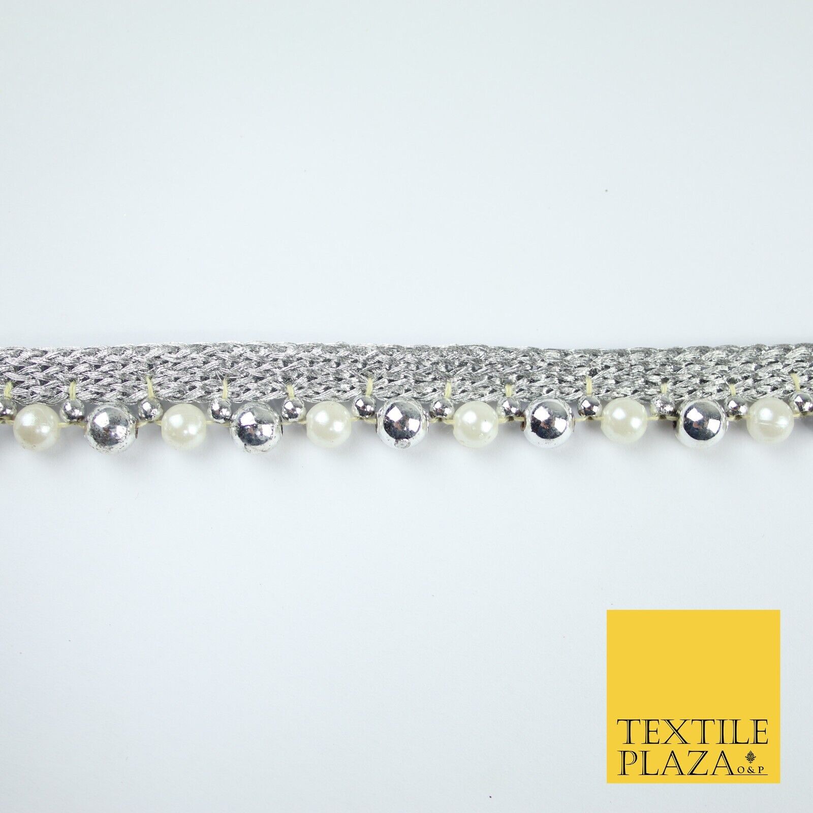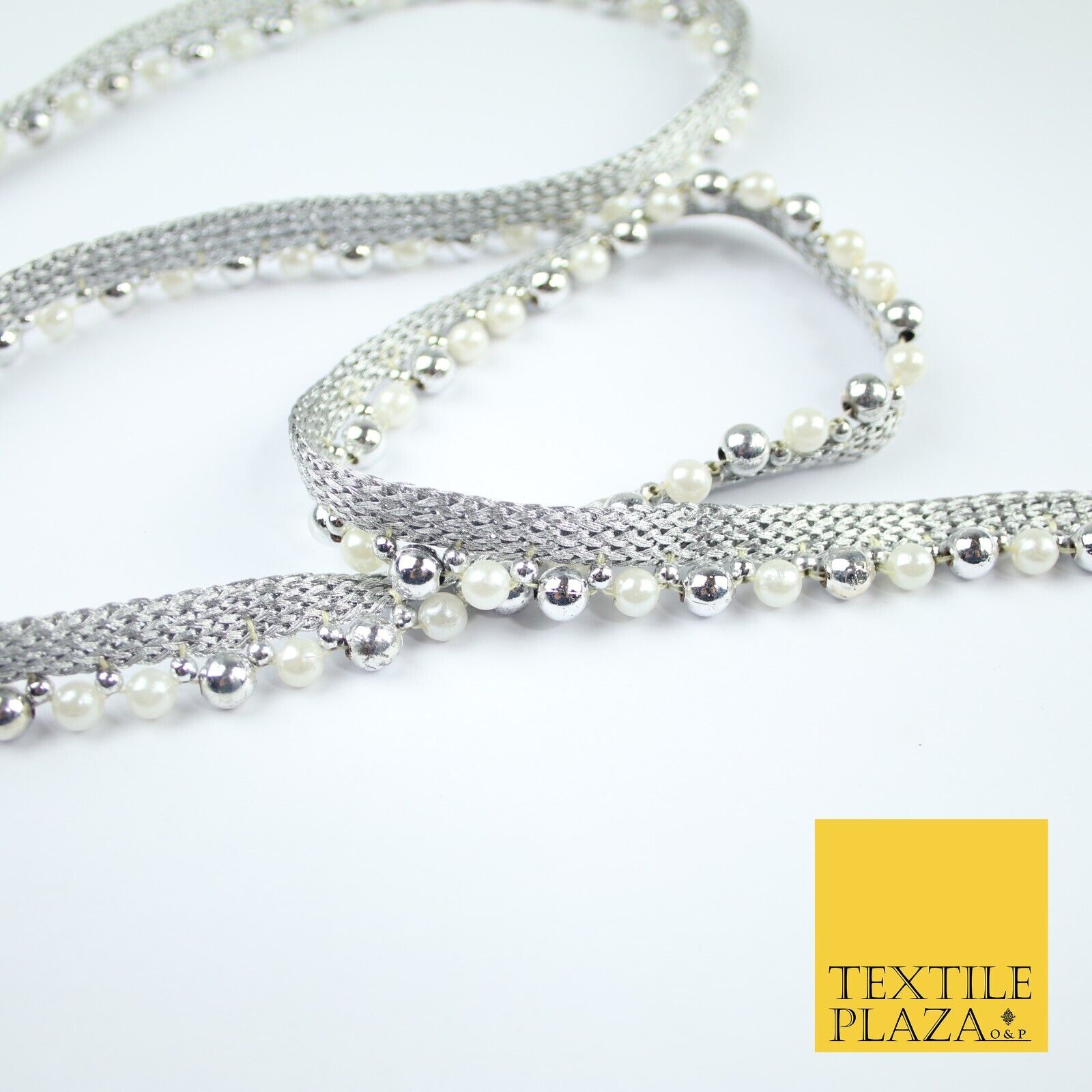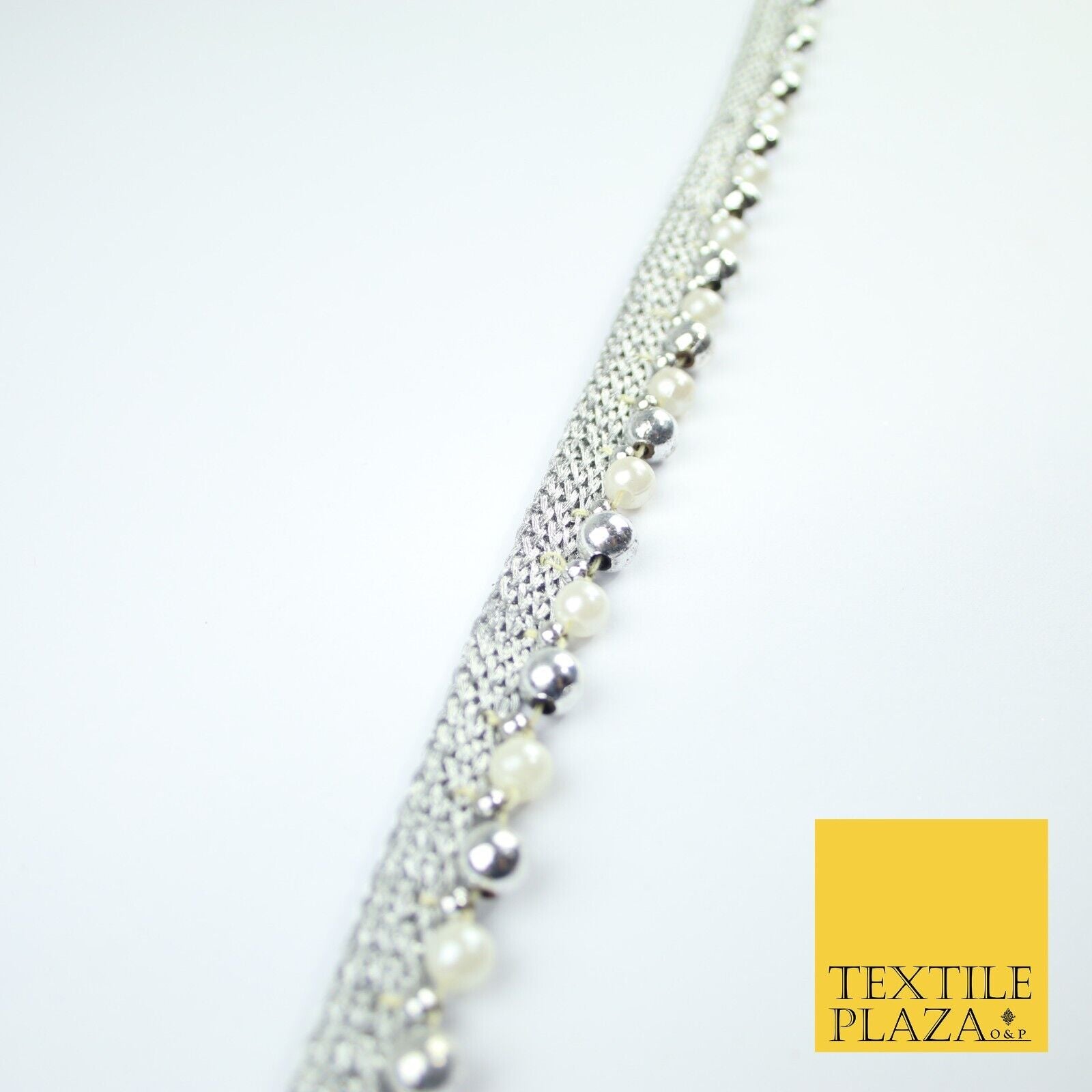 Silver Chrome / White Pearl Beaded Ribbon Trim Border Lace - 1.5cm Wide - X586