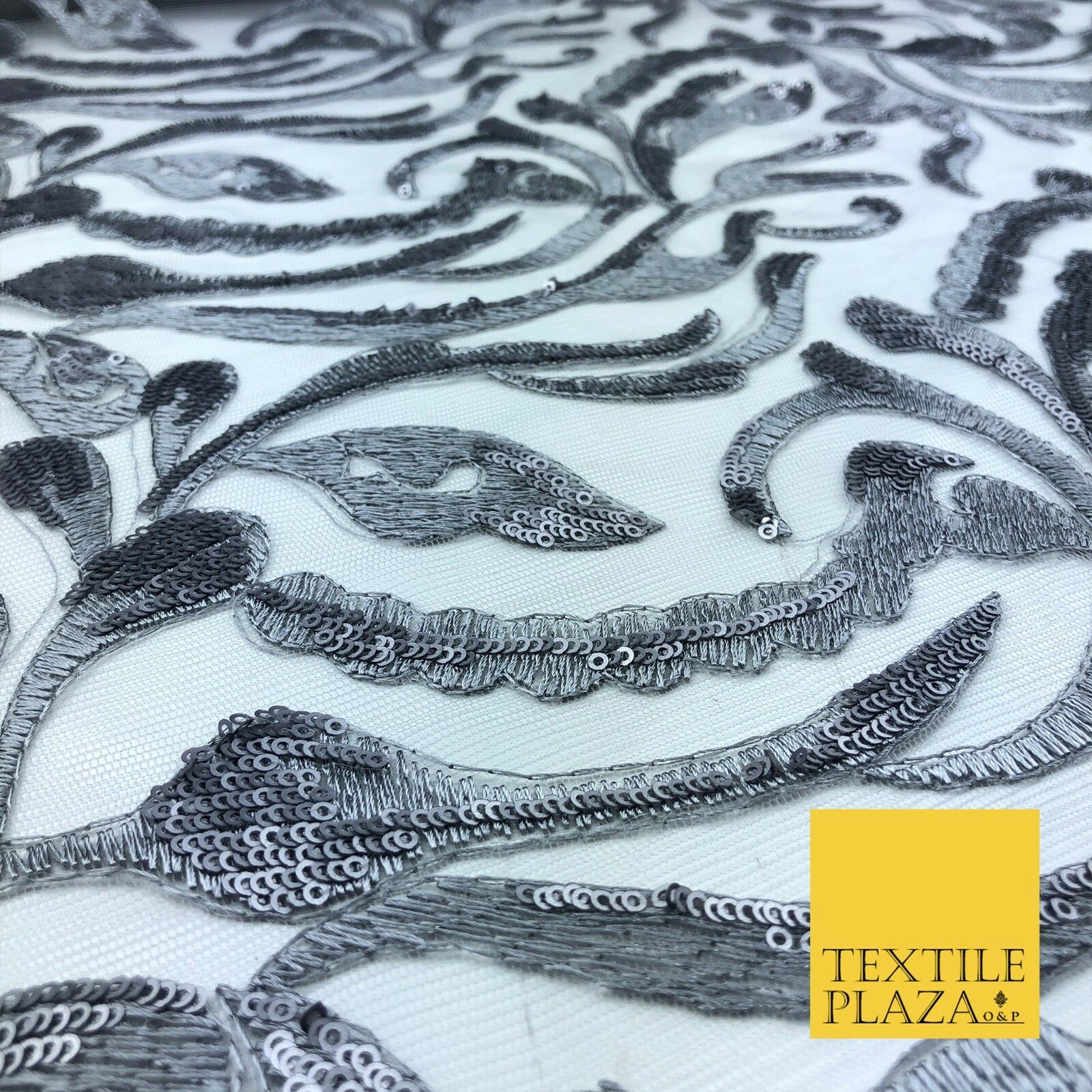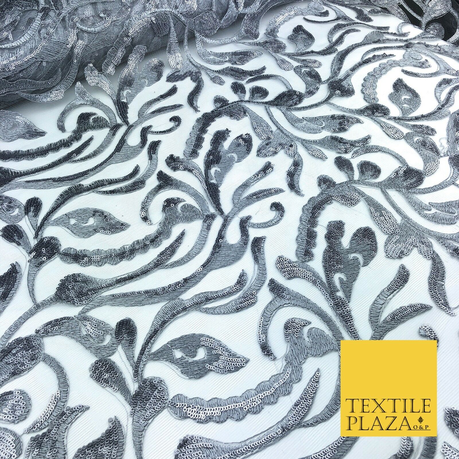 SILVER / GREY Swirl Sequin Net Lace Fancy Botanical Embroidered Net KB263