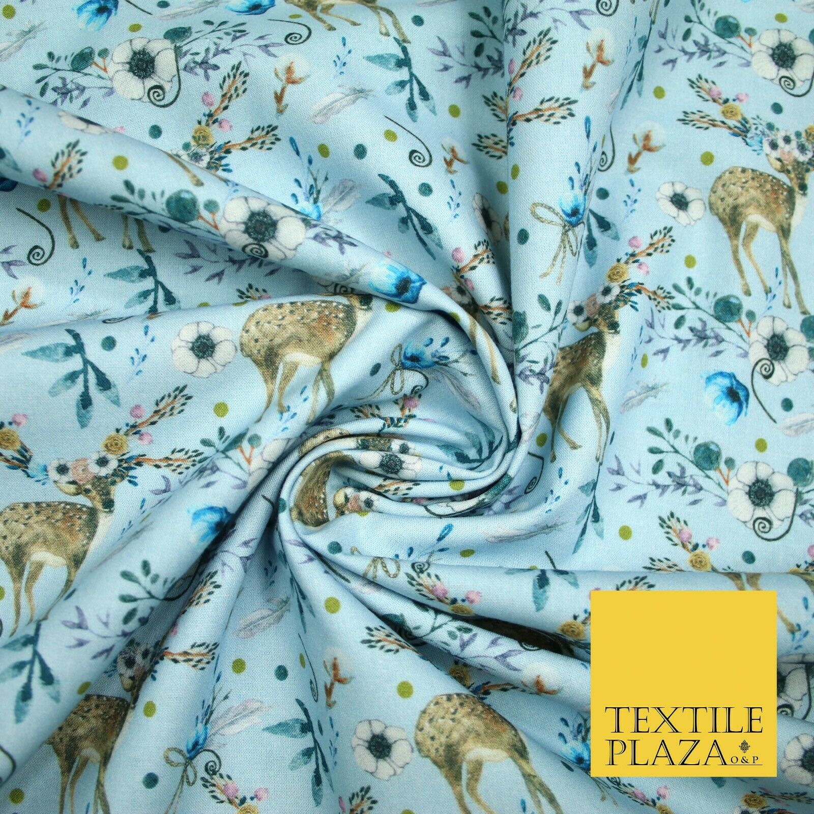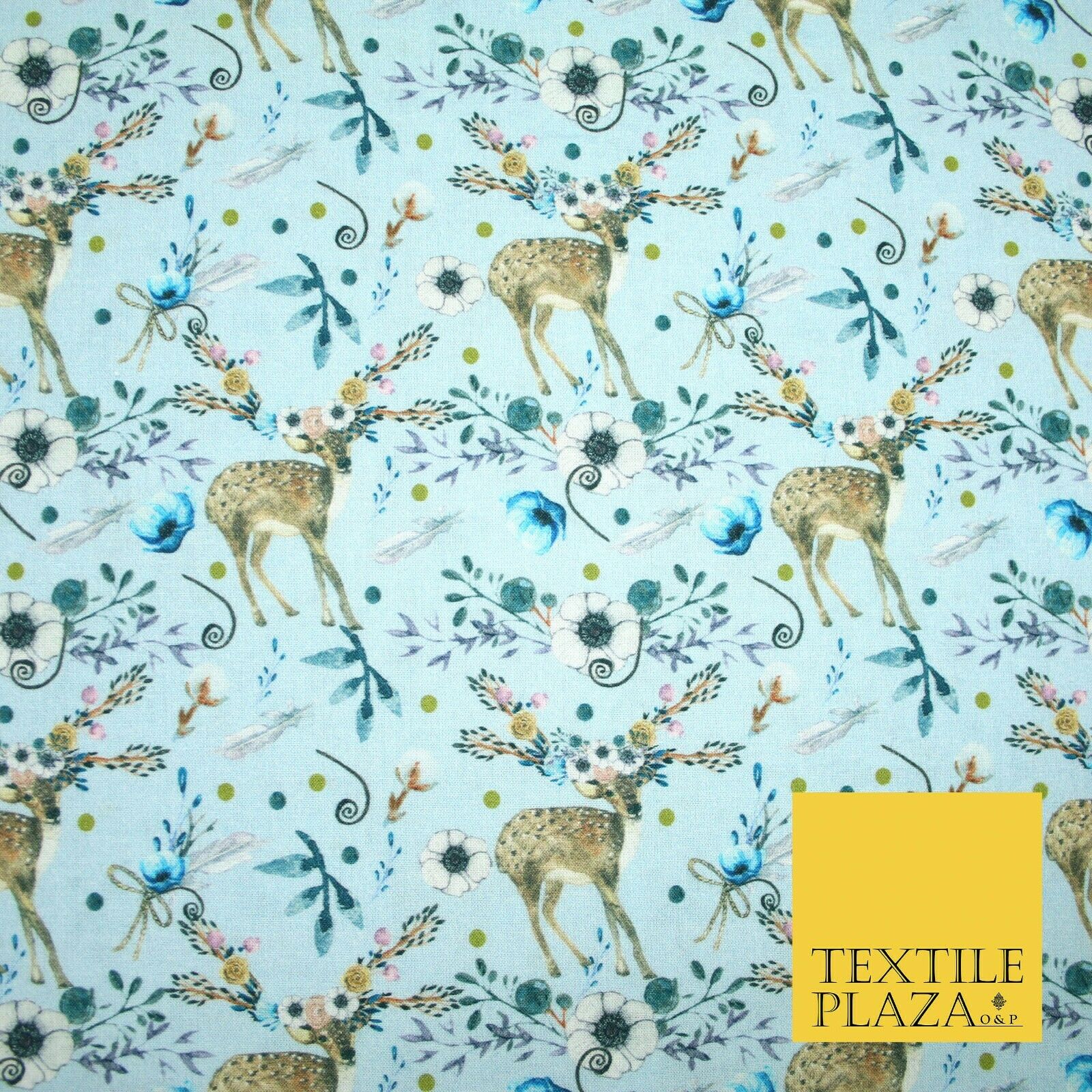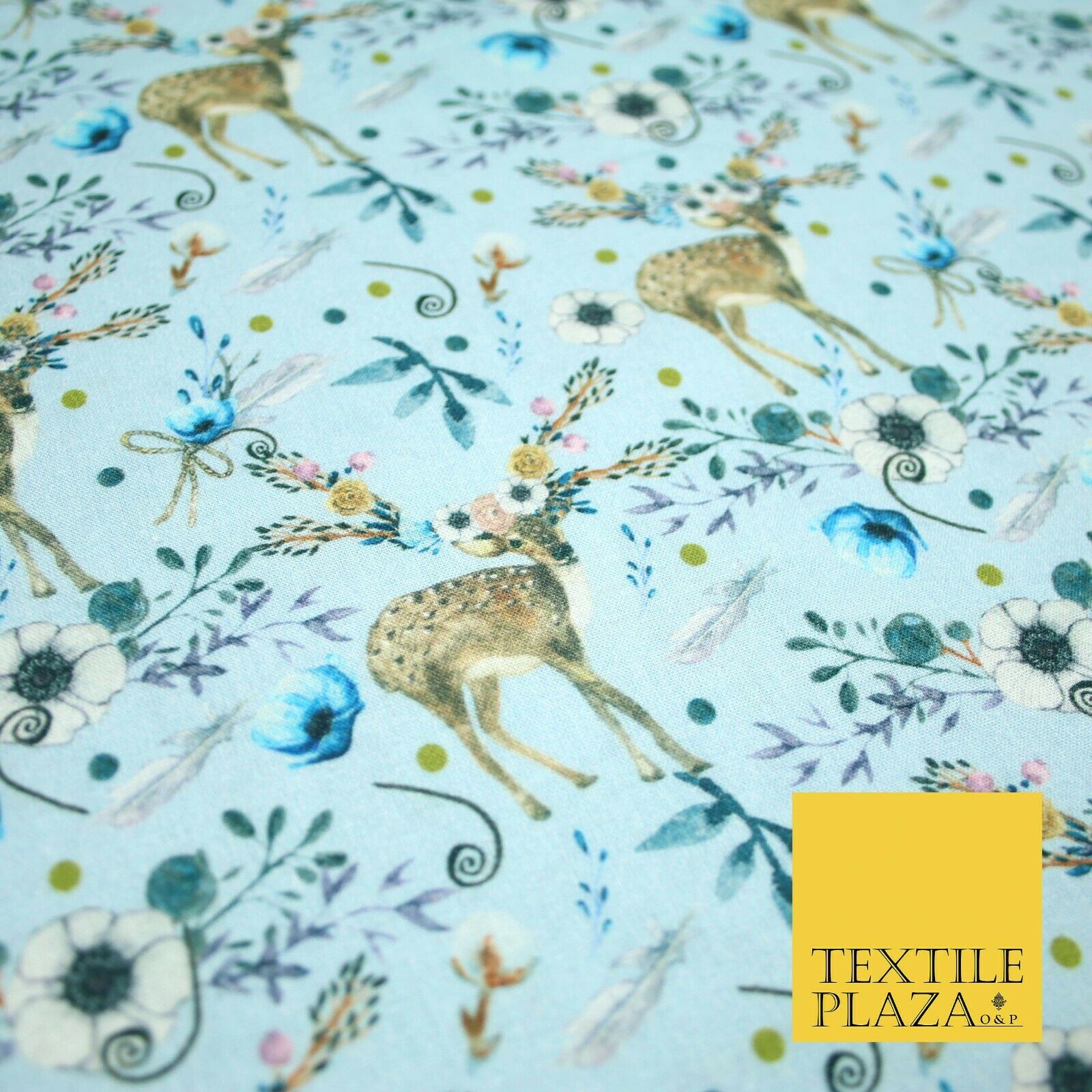 Sky Blue Floral Deer Feather Digital Print 100% Cotton Fabric Sewing 58" 4945