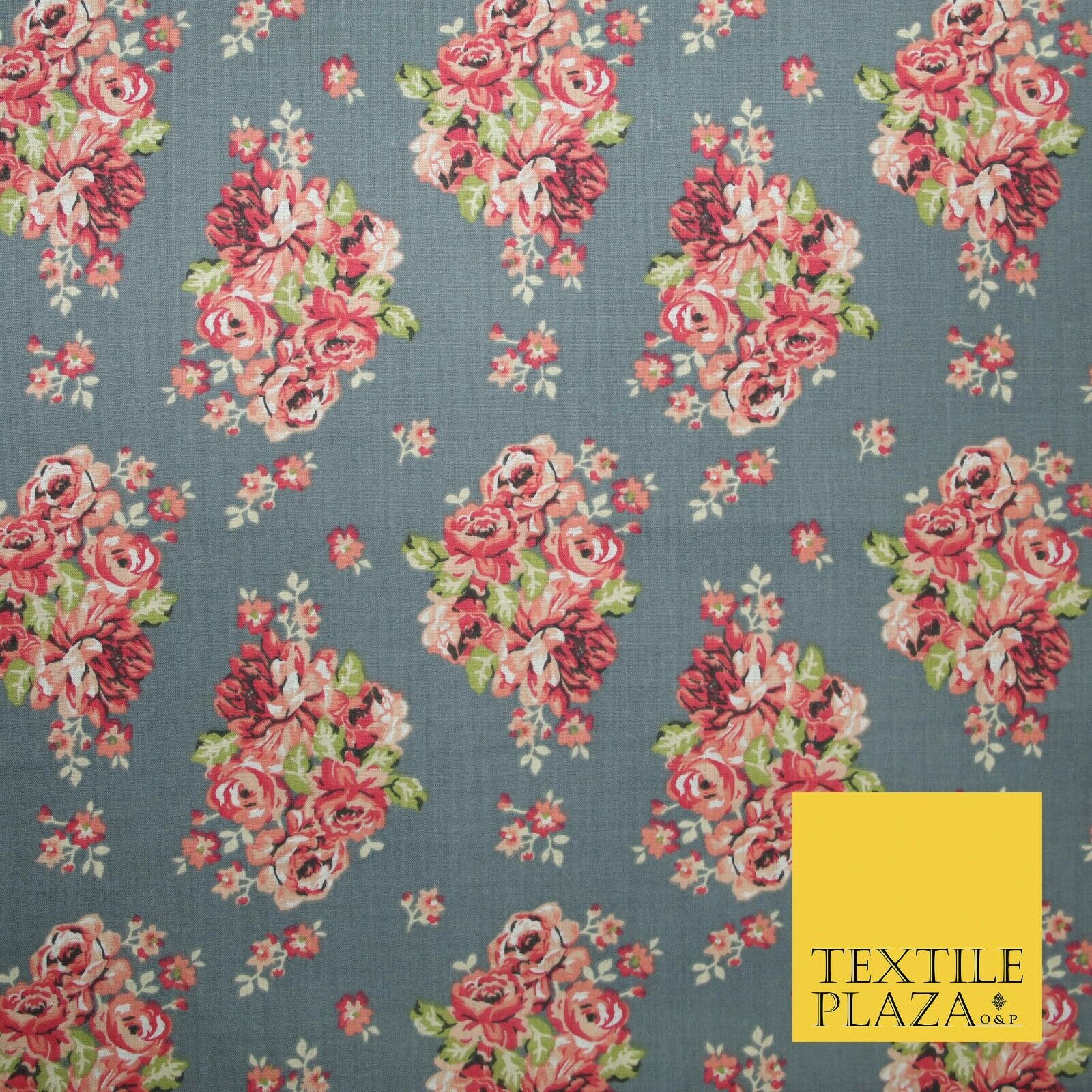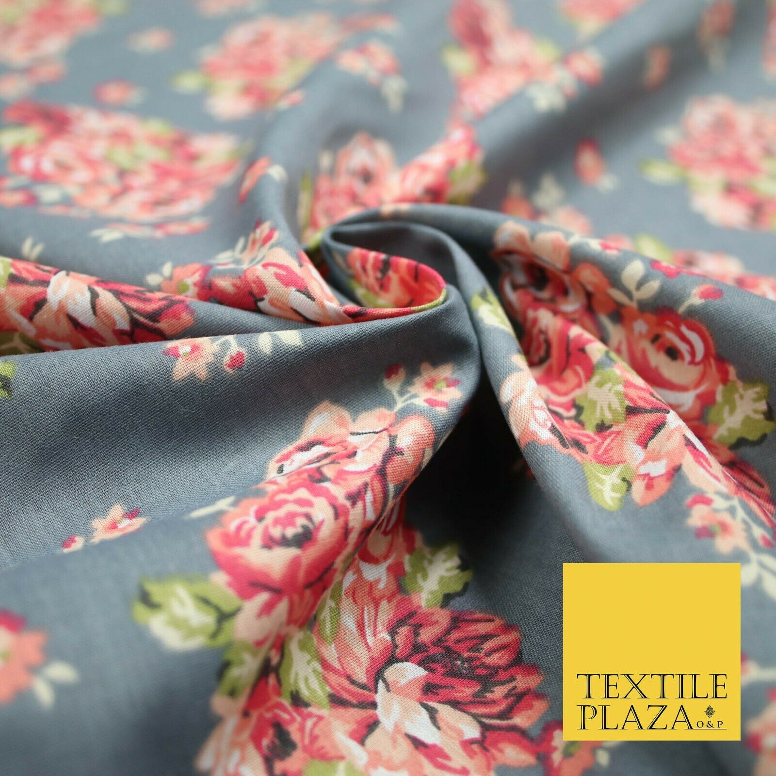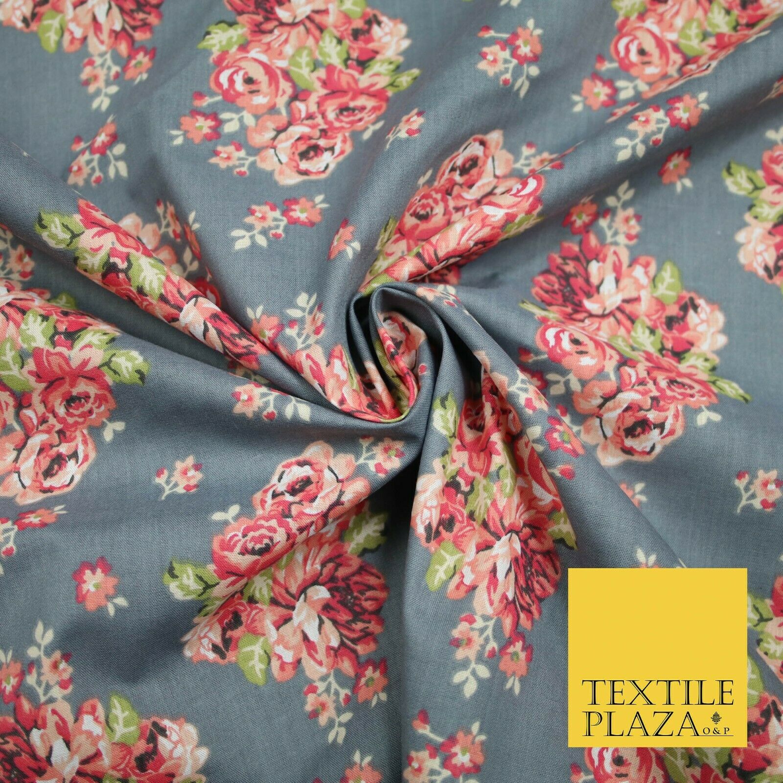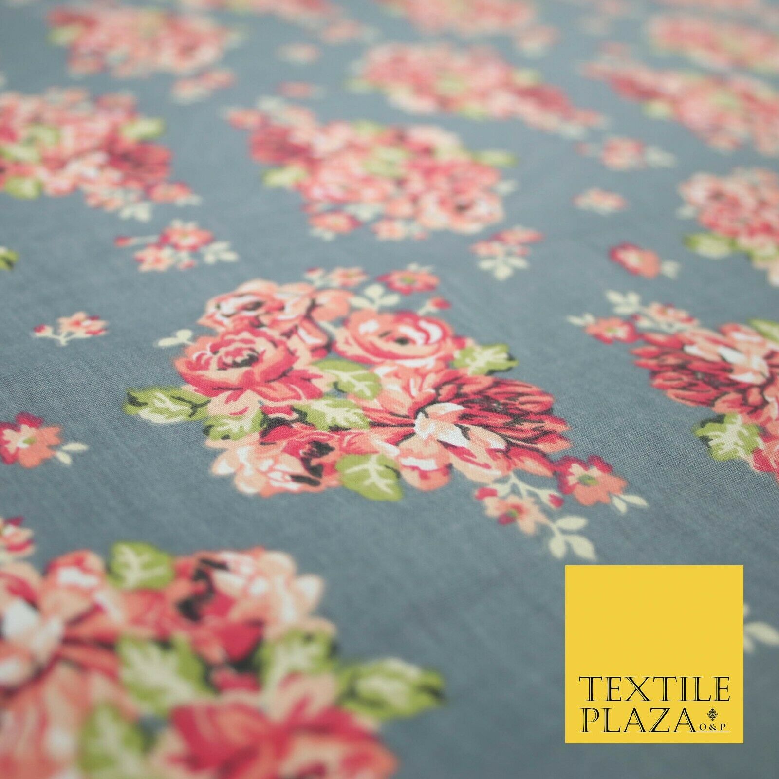 Storm Grey Floral Cluster Bouquets Printed Poly Cotton Fabric Polycotton 5019