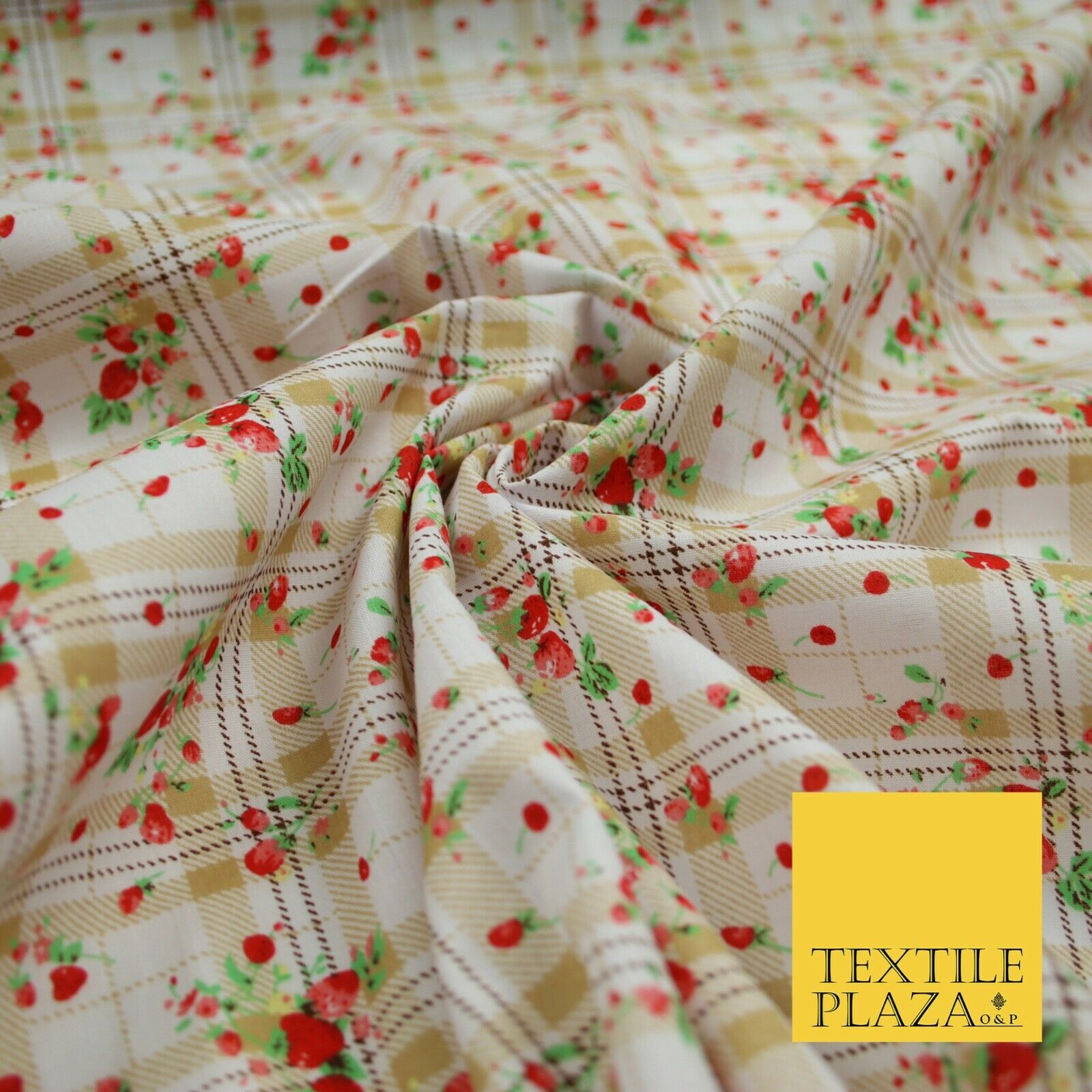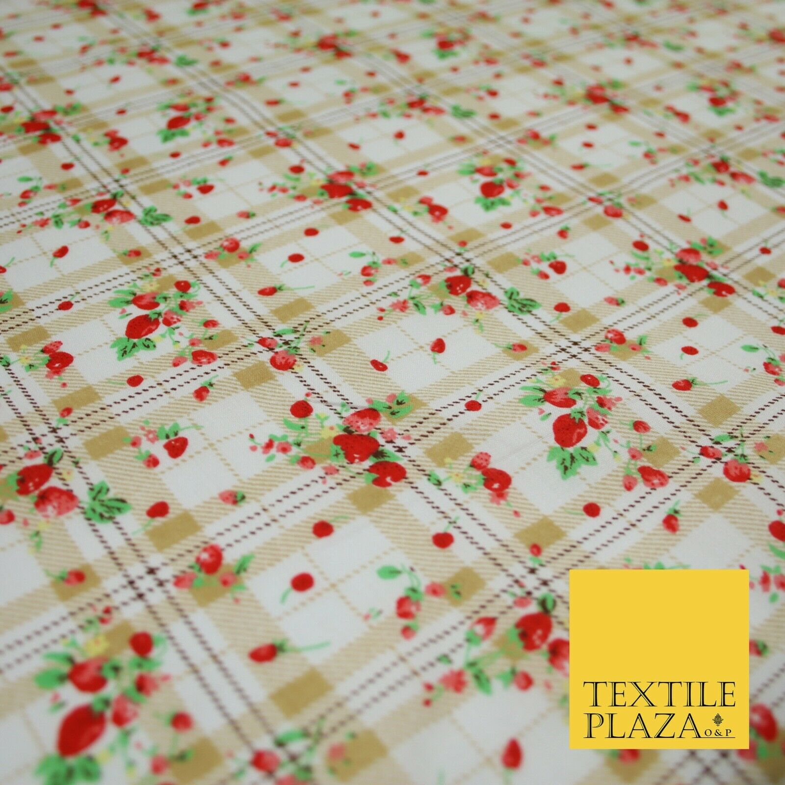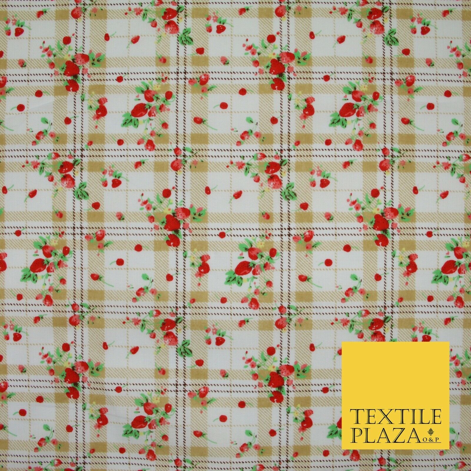 Strawberries Check Tartan Beige Printed Poly Cotton Fabric Polycotton Craft 6384