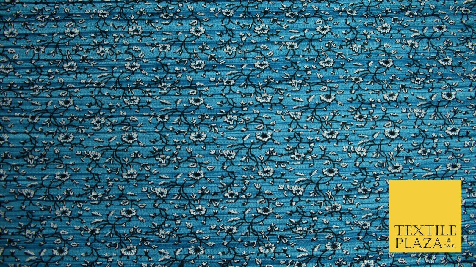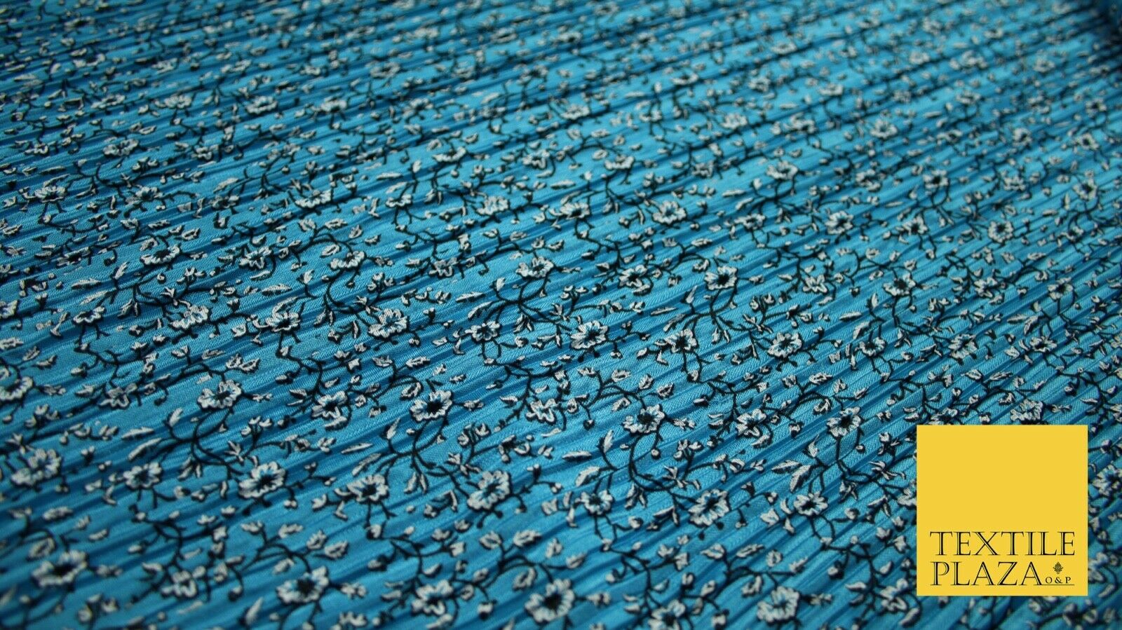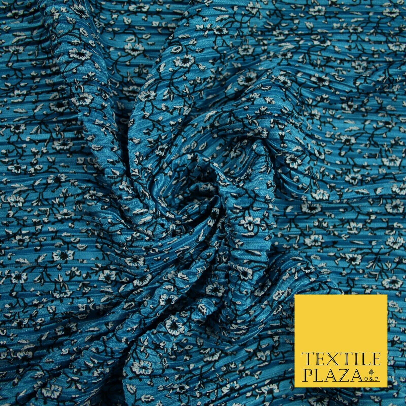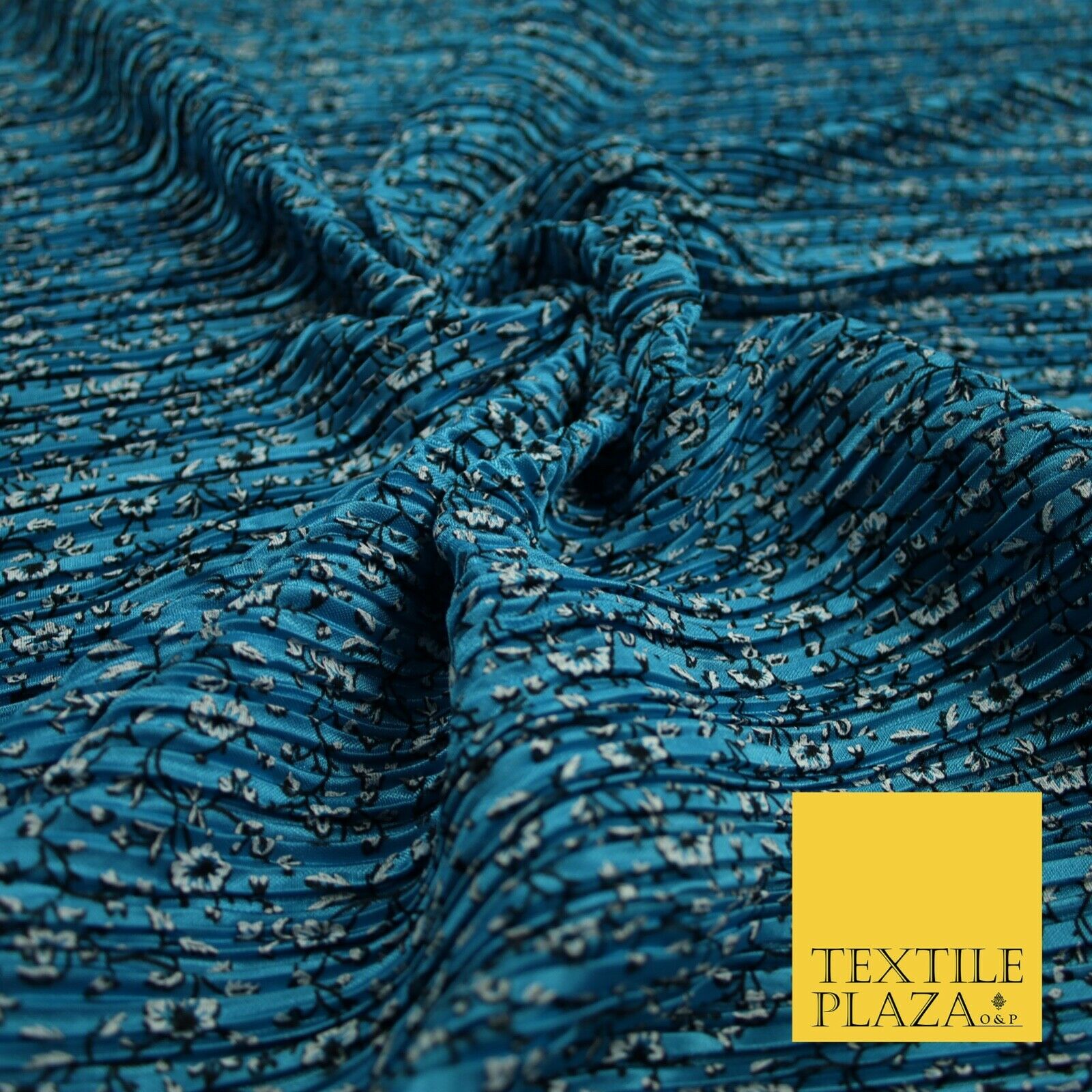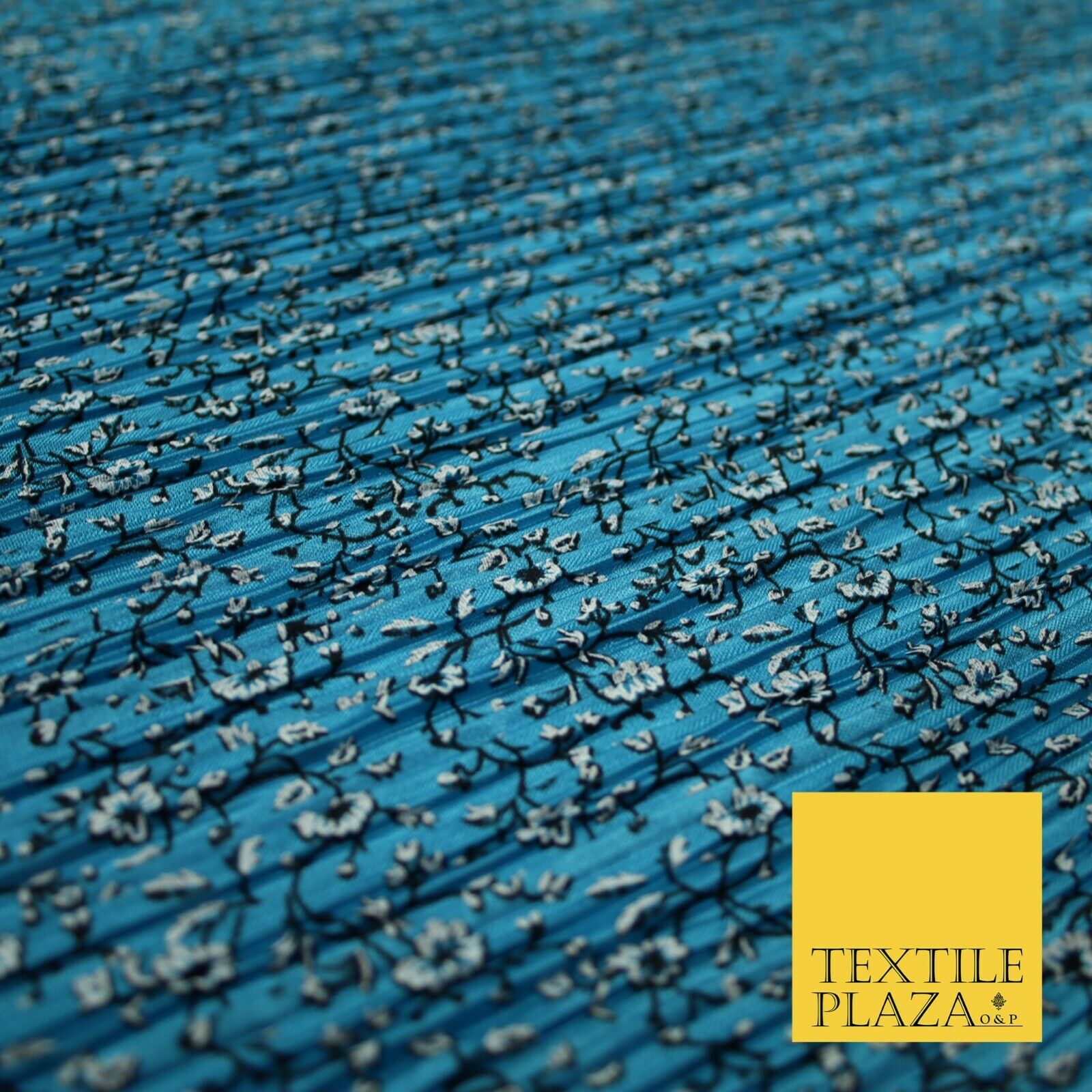 Turquoise Blue Floral Ditsy Print Pleated Plisse Satin Stretch Dress Fabric 6477