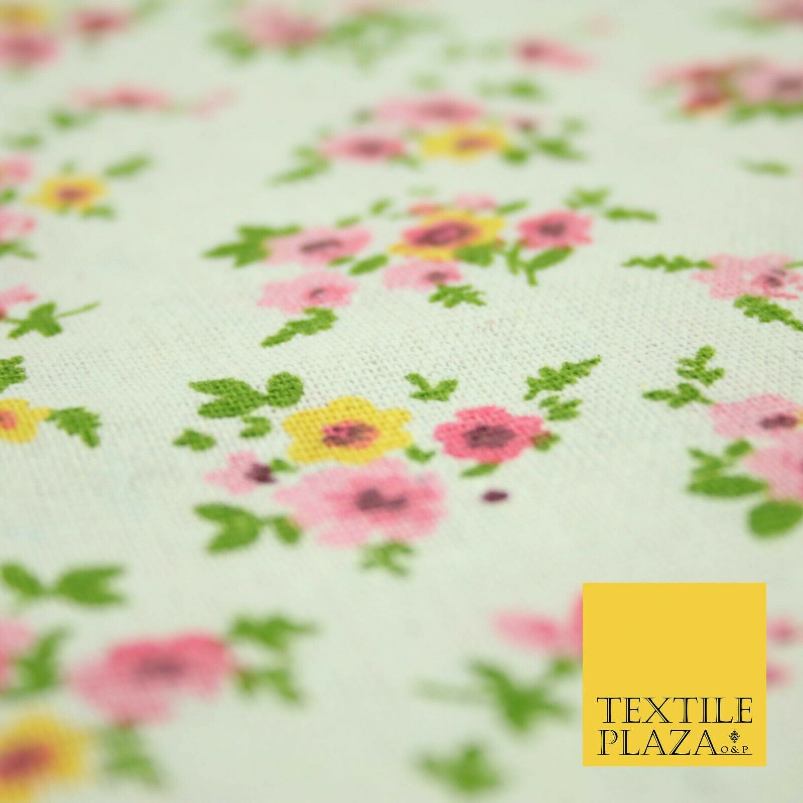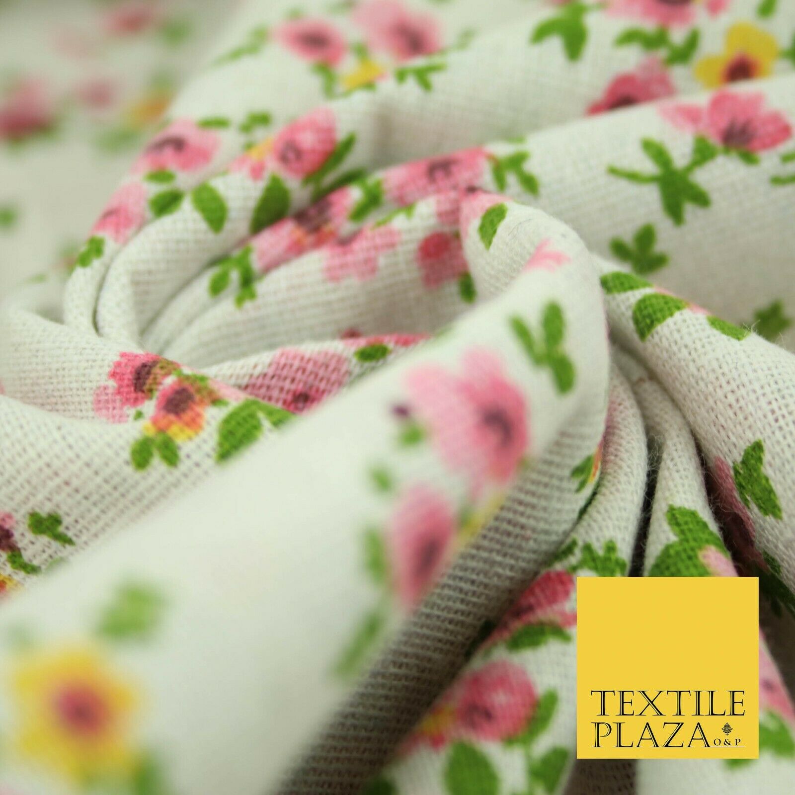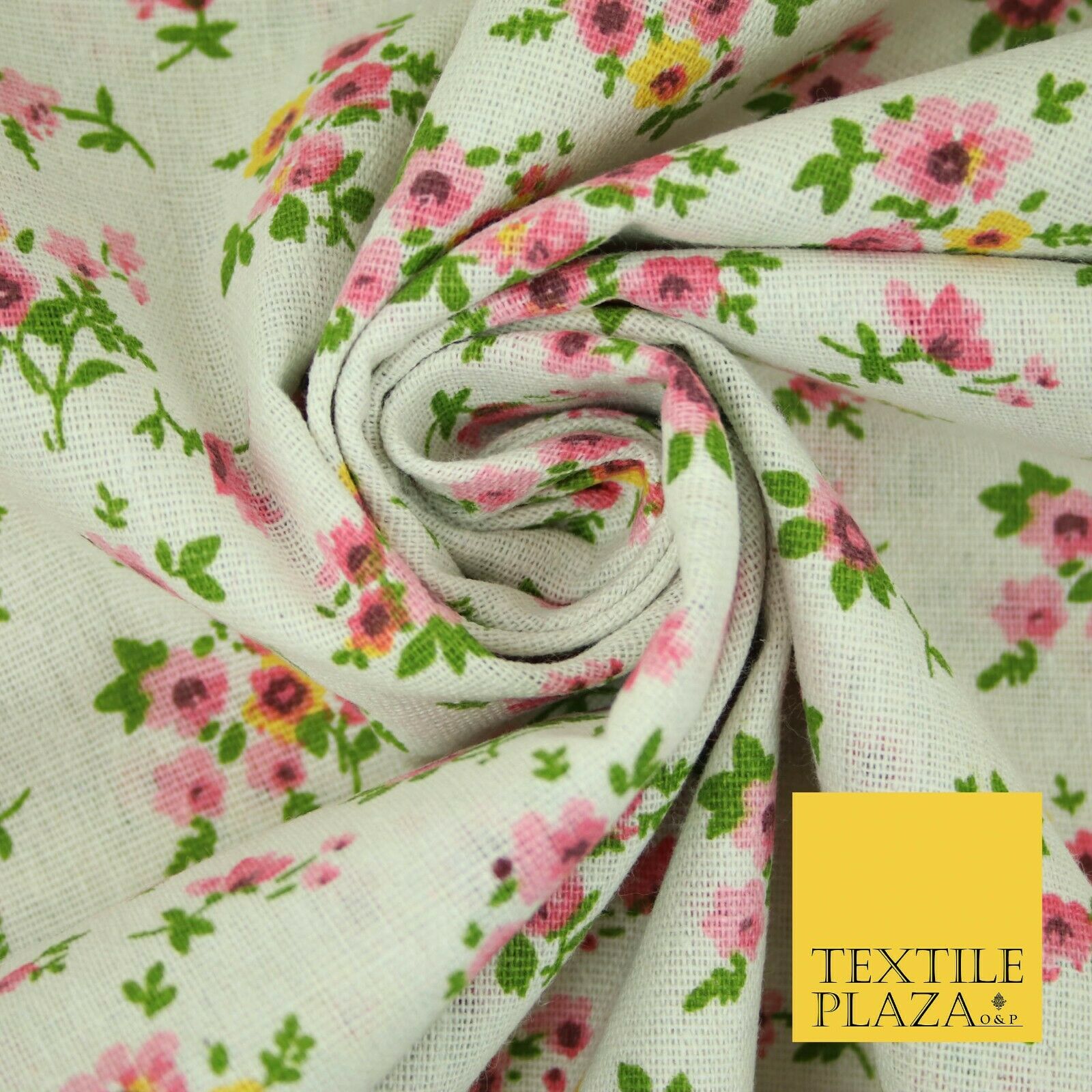 Watercolour Pink Floral Garden Flowers Printed 100% Cotton Linen Fabric 60" Wide