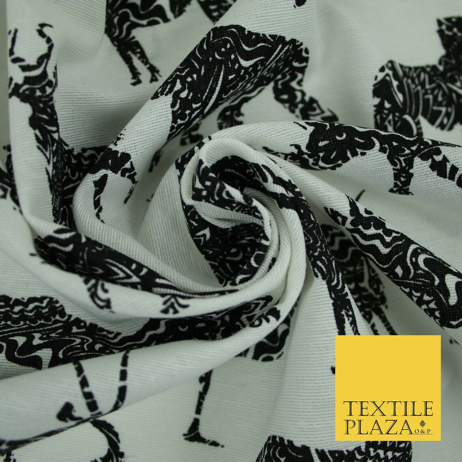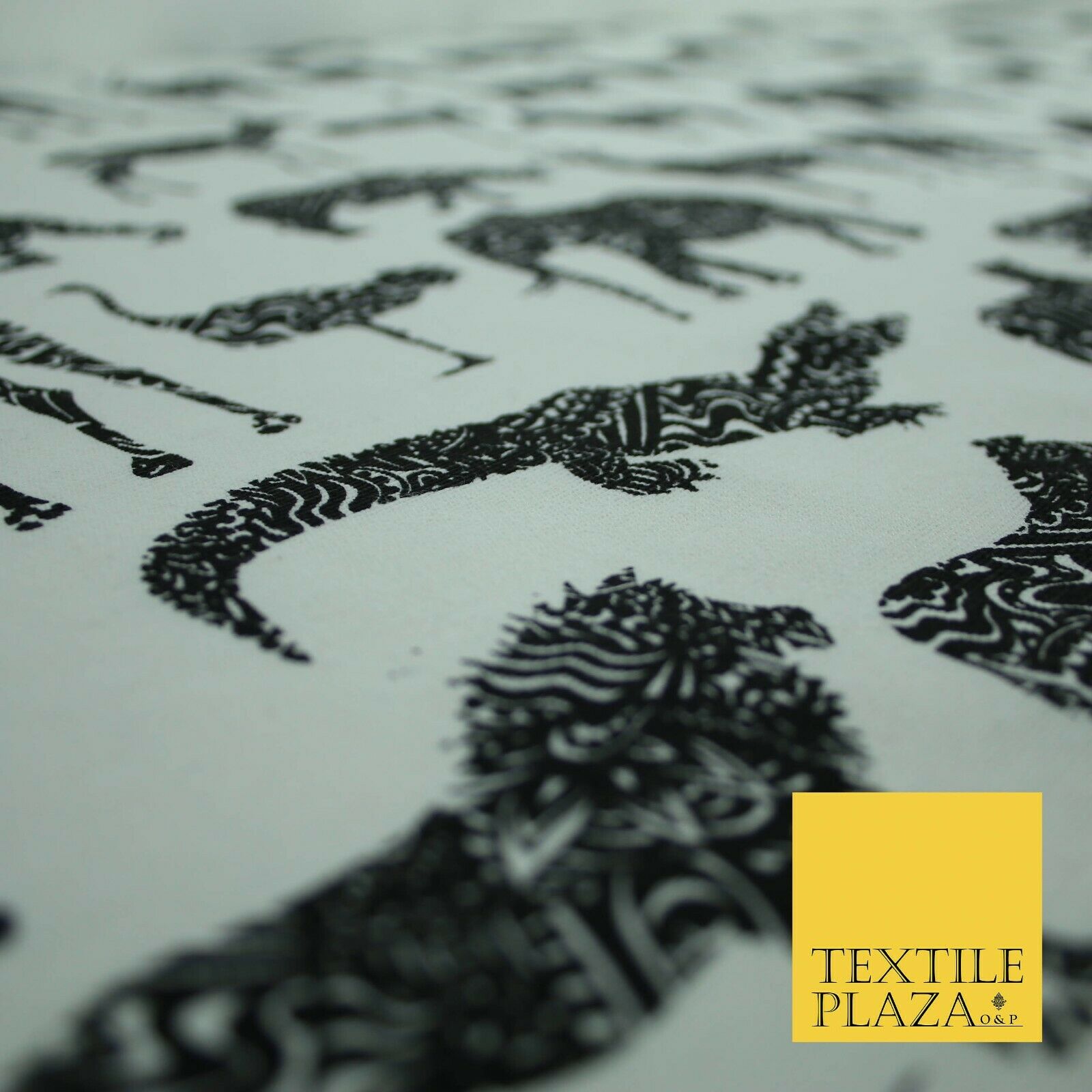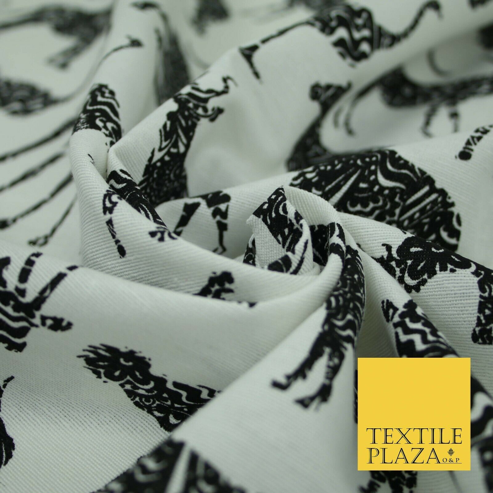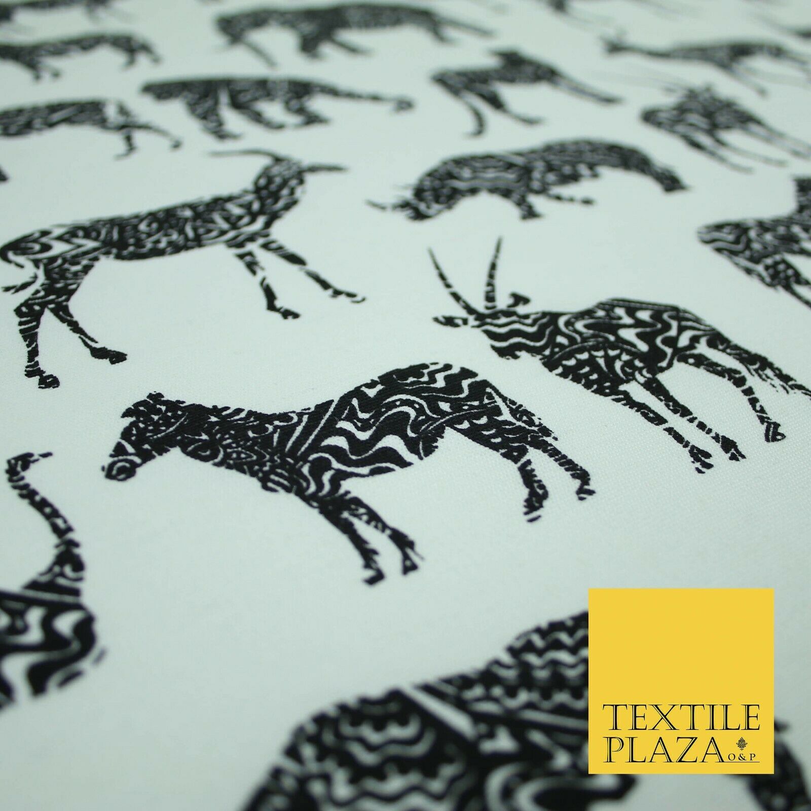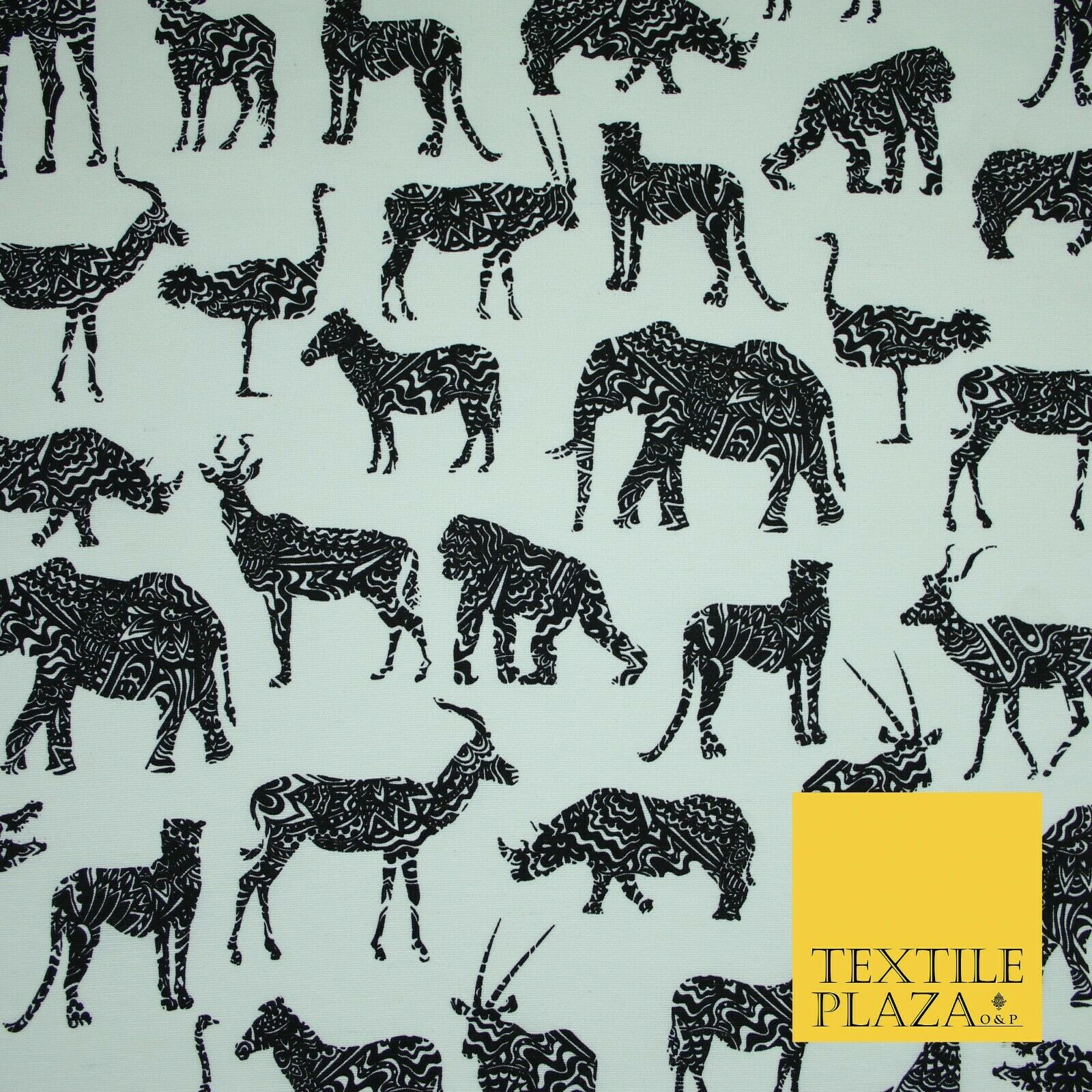White Black SAFARI ANIMALS Elephant Leopard Tiger Canvas Print Fabric 56" 4122