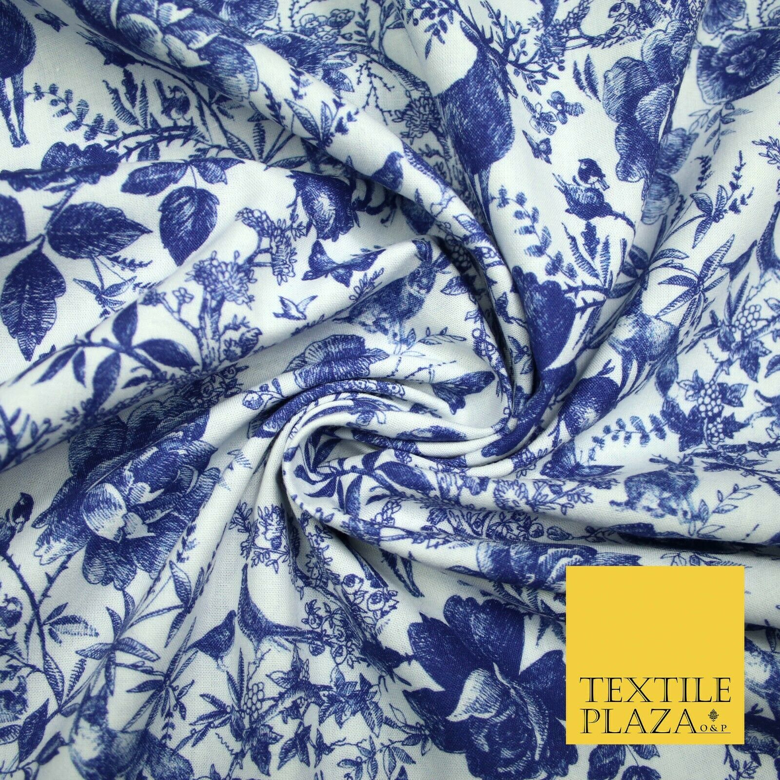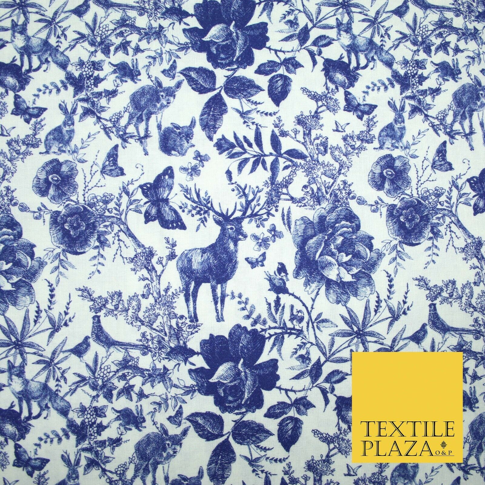 White Blue Ink Vintage Floral Forest Digital Print 100% Cotton Fabric 58" 4944