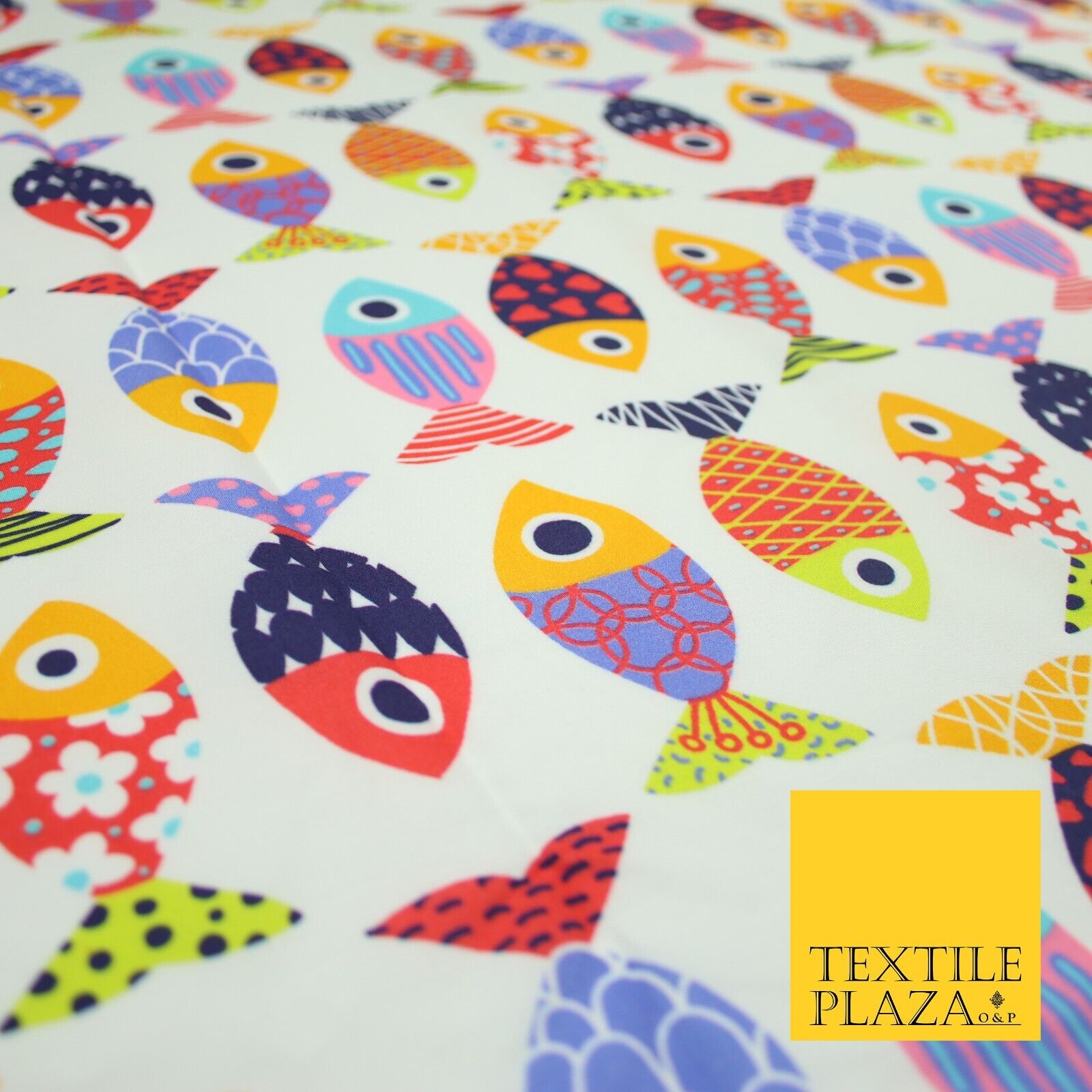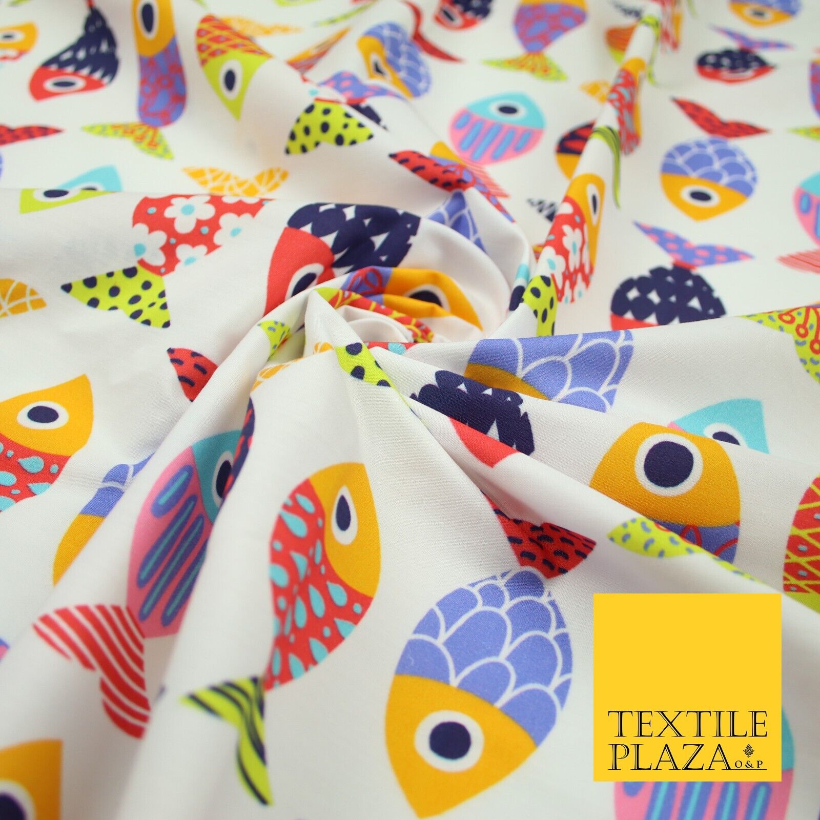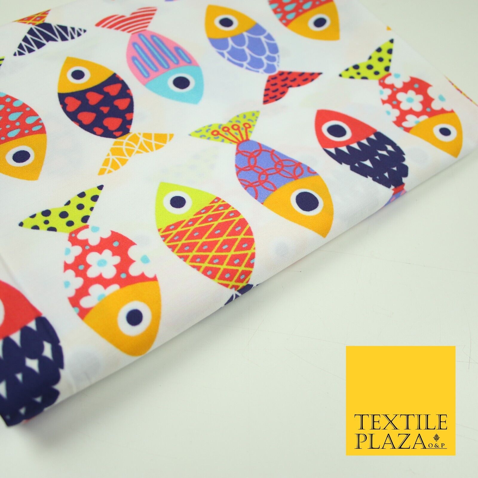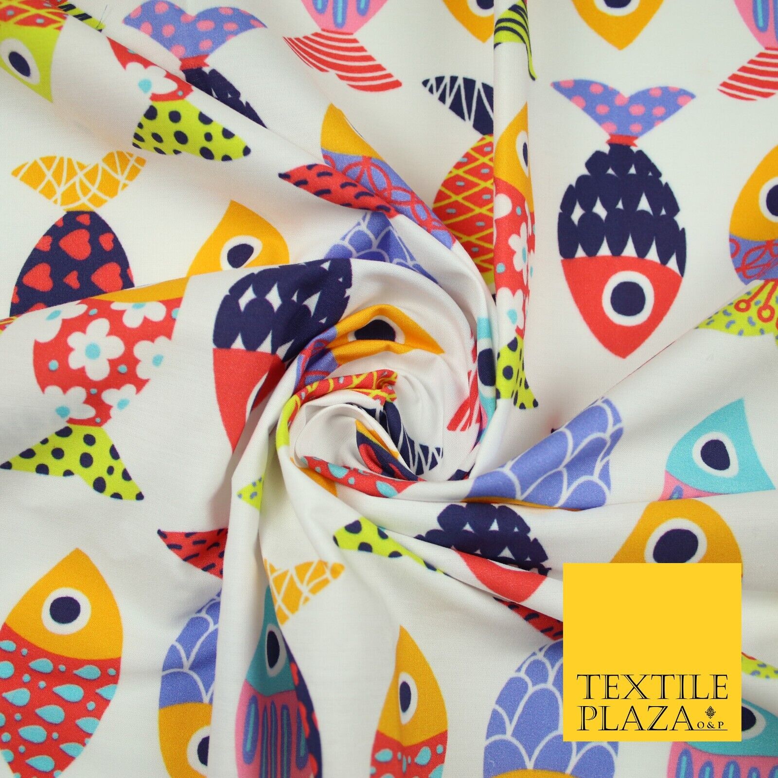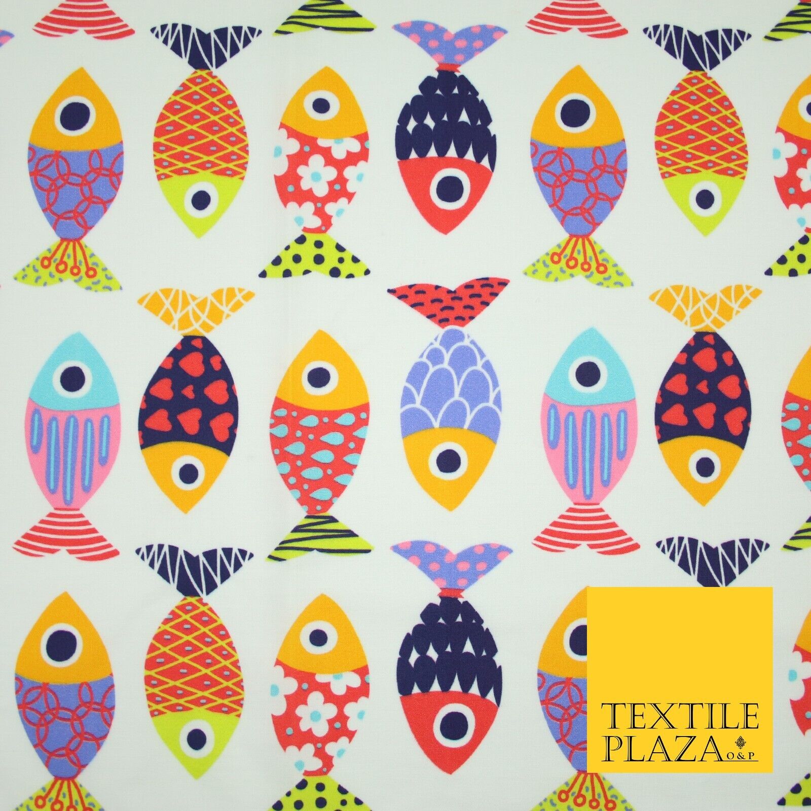 White Colourful Quirky Patchwork Abstract Patterned Fish 100% Cotton Fabric 7344