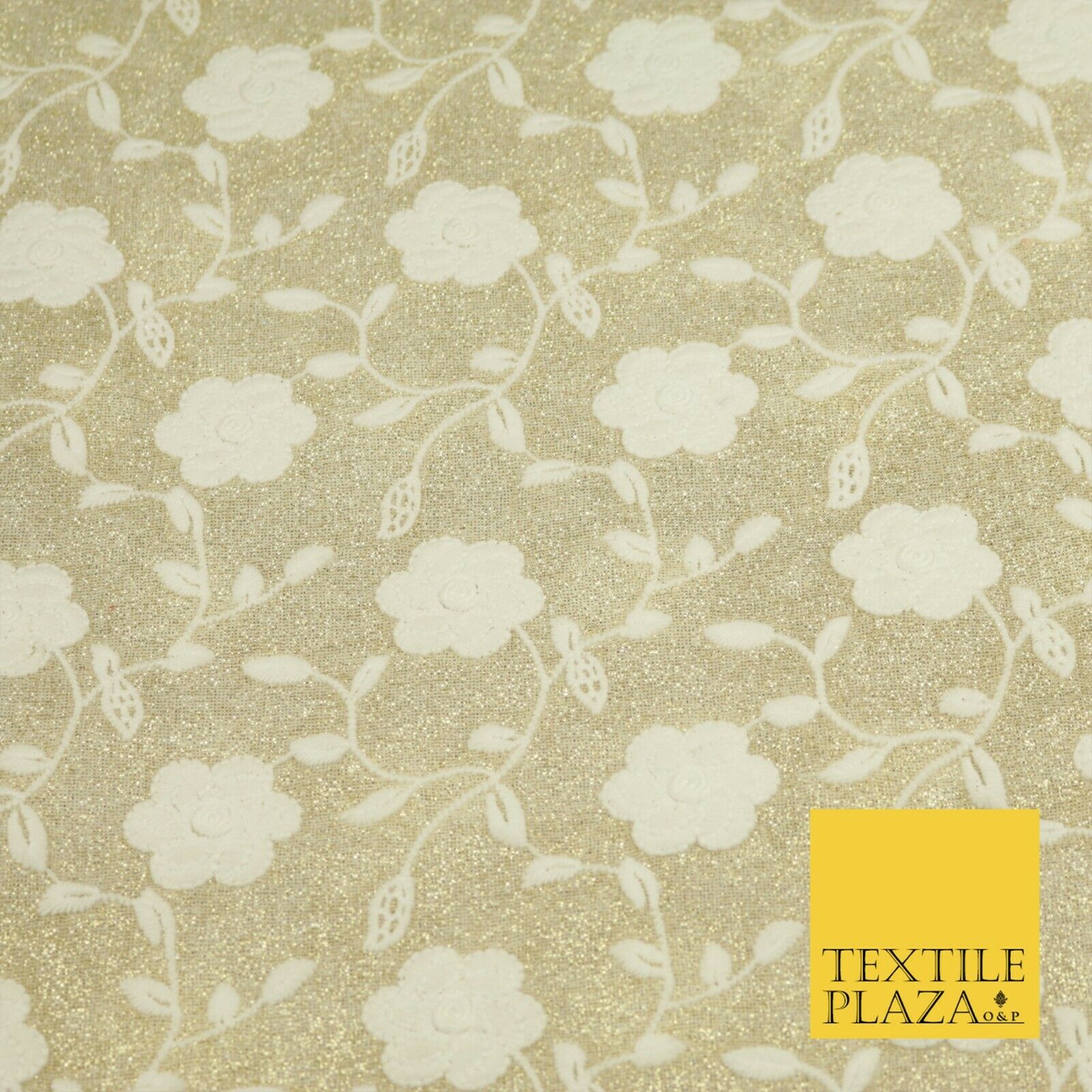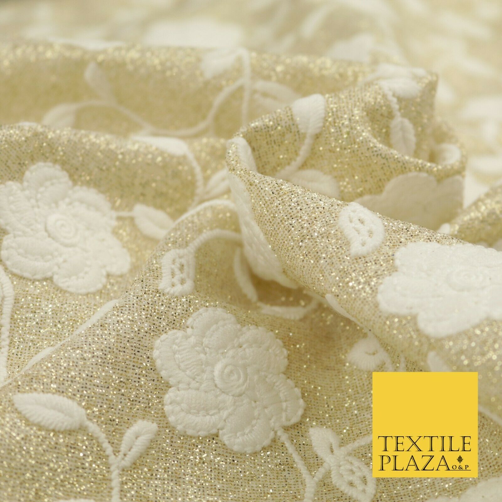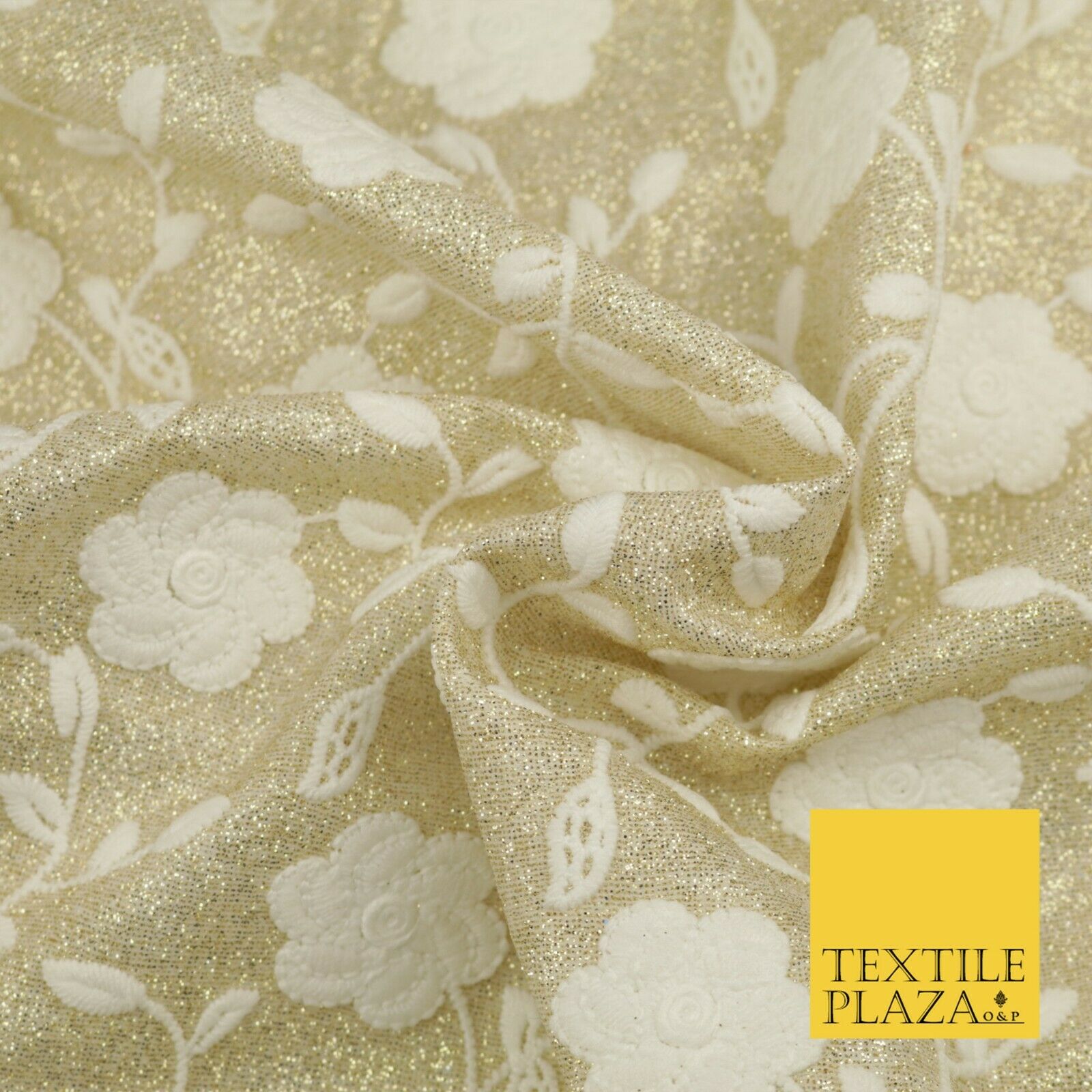White Embroidered Gold Lurex Shimmer Fabric Backdrop Dance Sparkle 1447