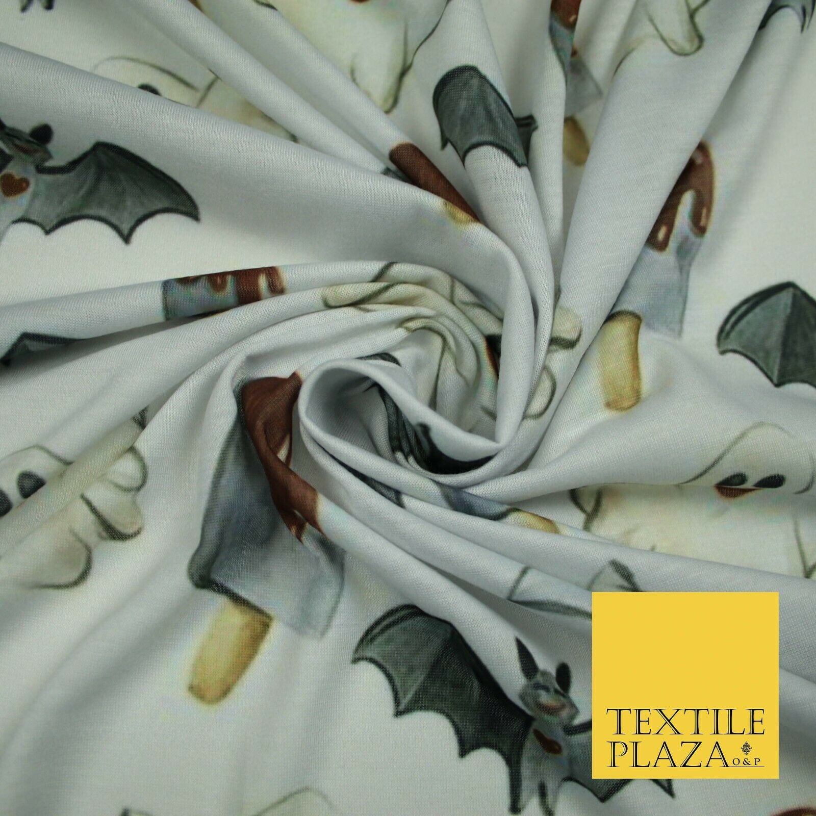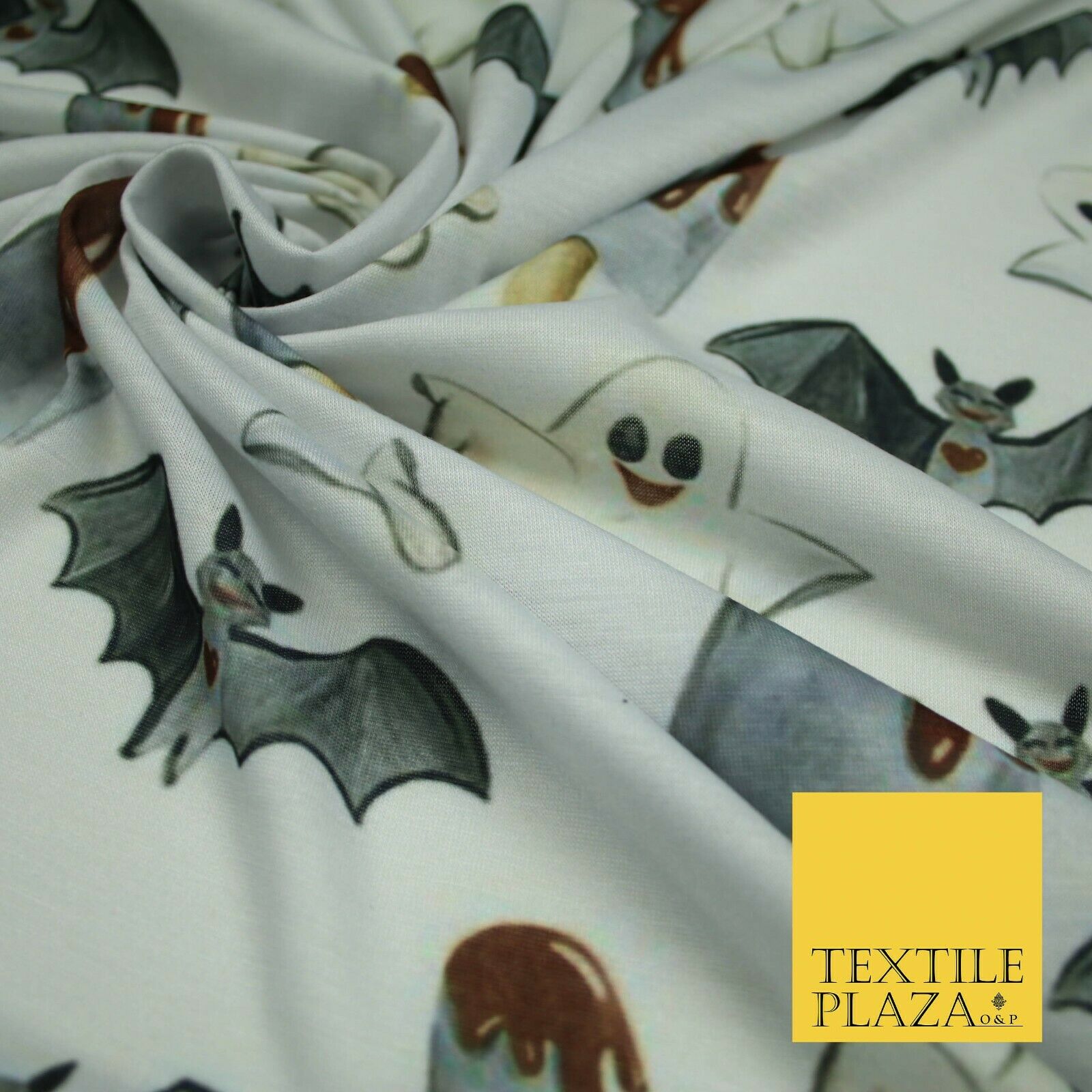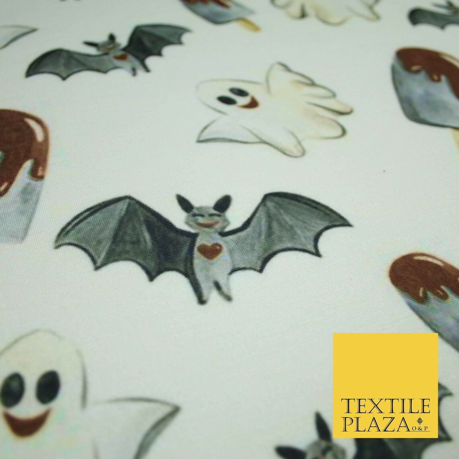 White Halloween Happy Bats Ghosts Ice Lolly Stretch Fine Jersey Fabric 60" 4779