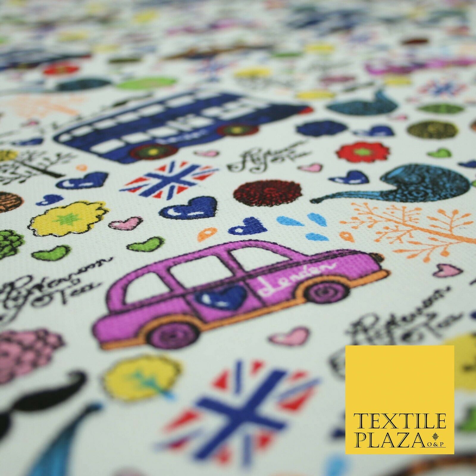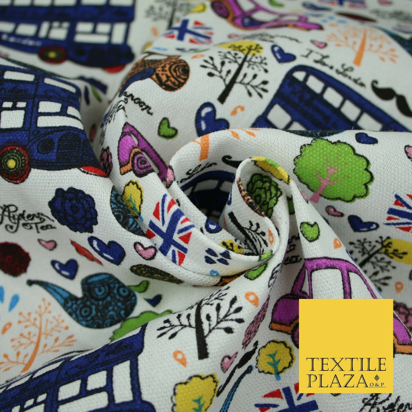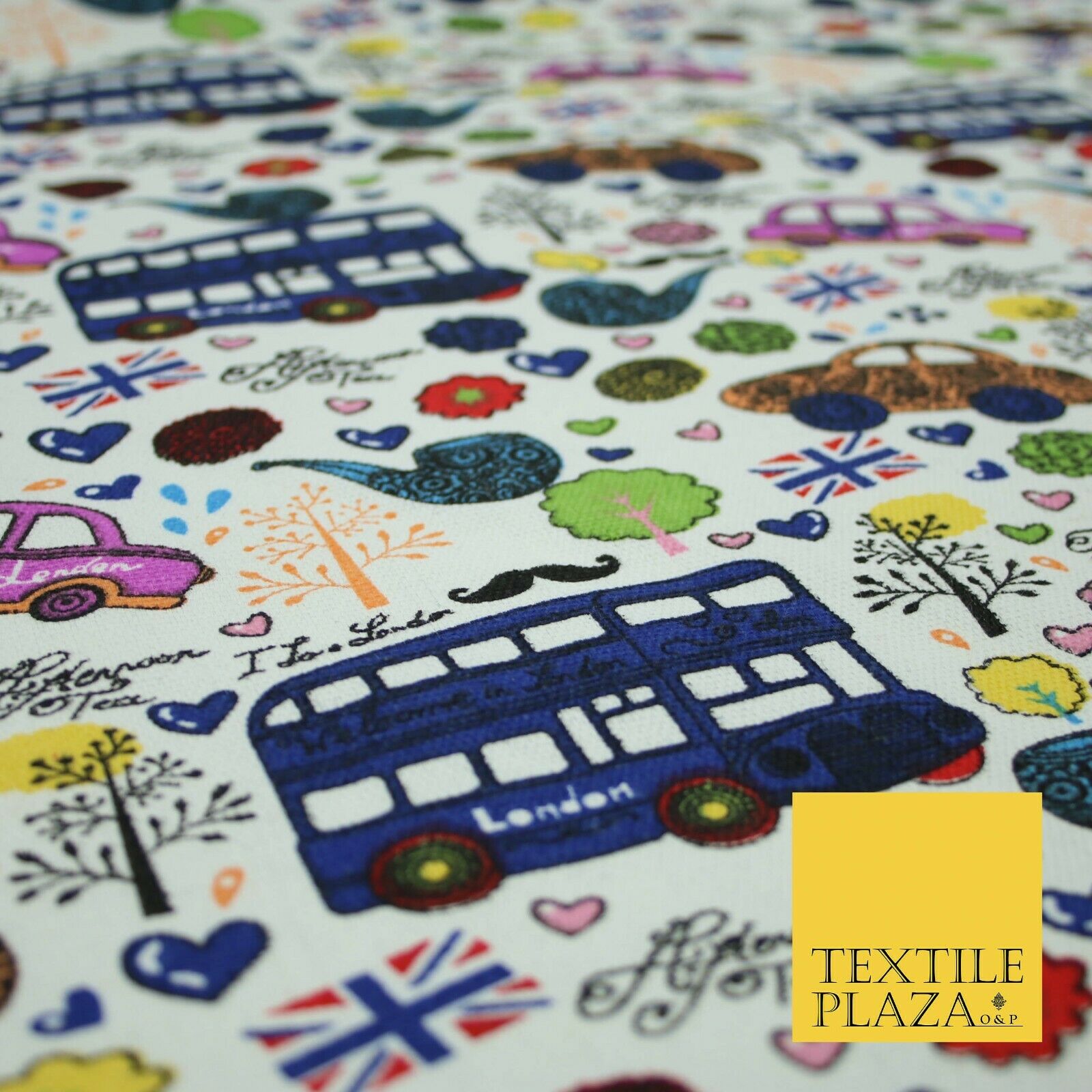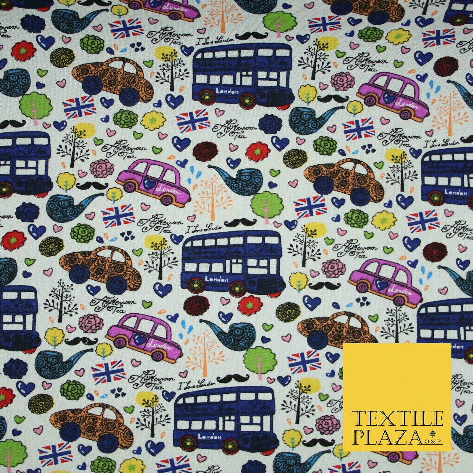 White LONDON Theme Bus Taxi Union Jack Printed Cotton Canvas Fabric 58" 4135