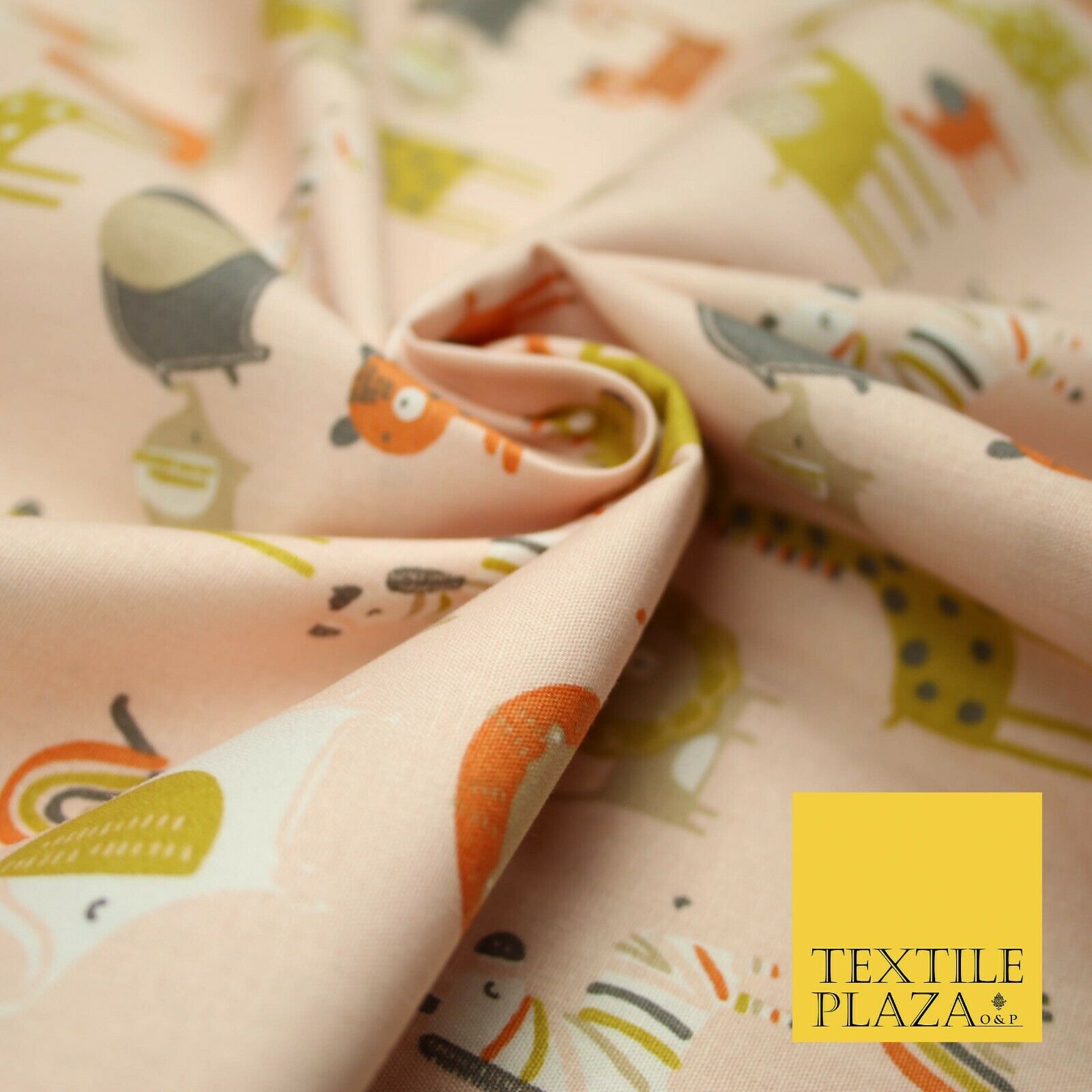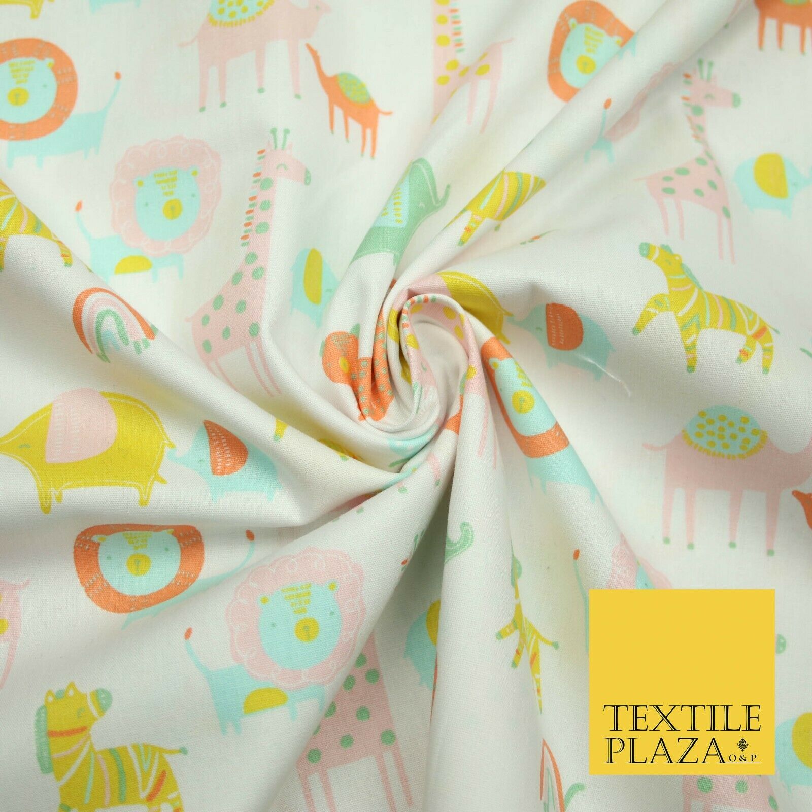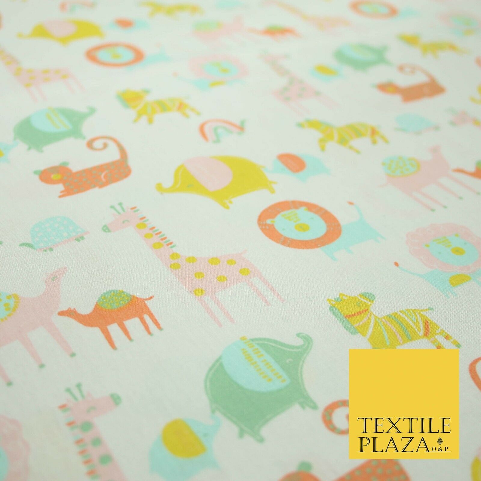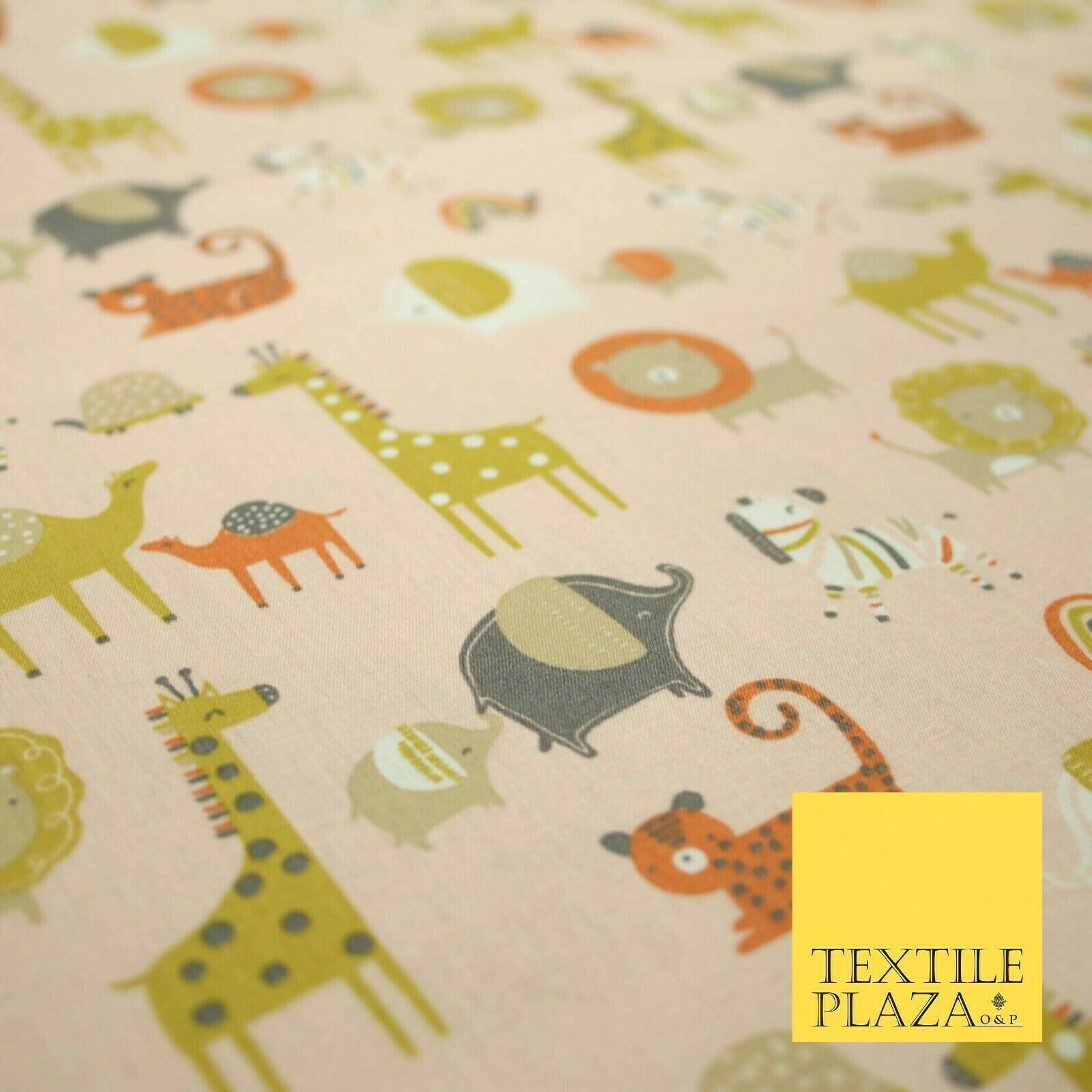 White Peach Fun Safari Animals Printed 100% ORGANIC COTTON POPLIN Fabric 58"