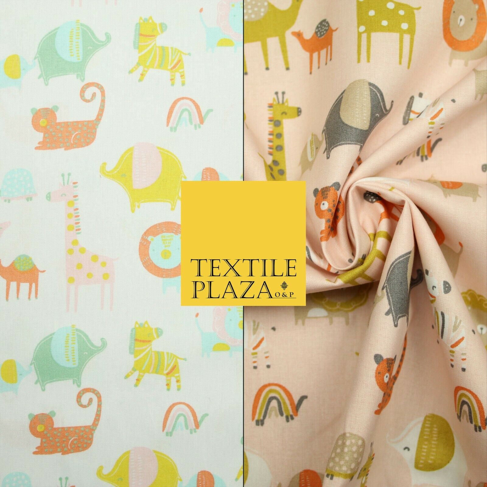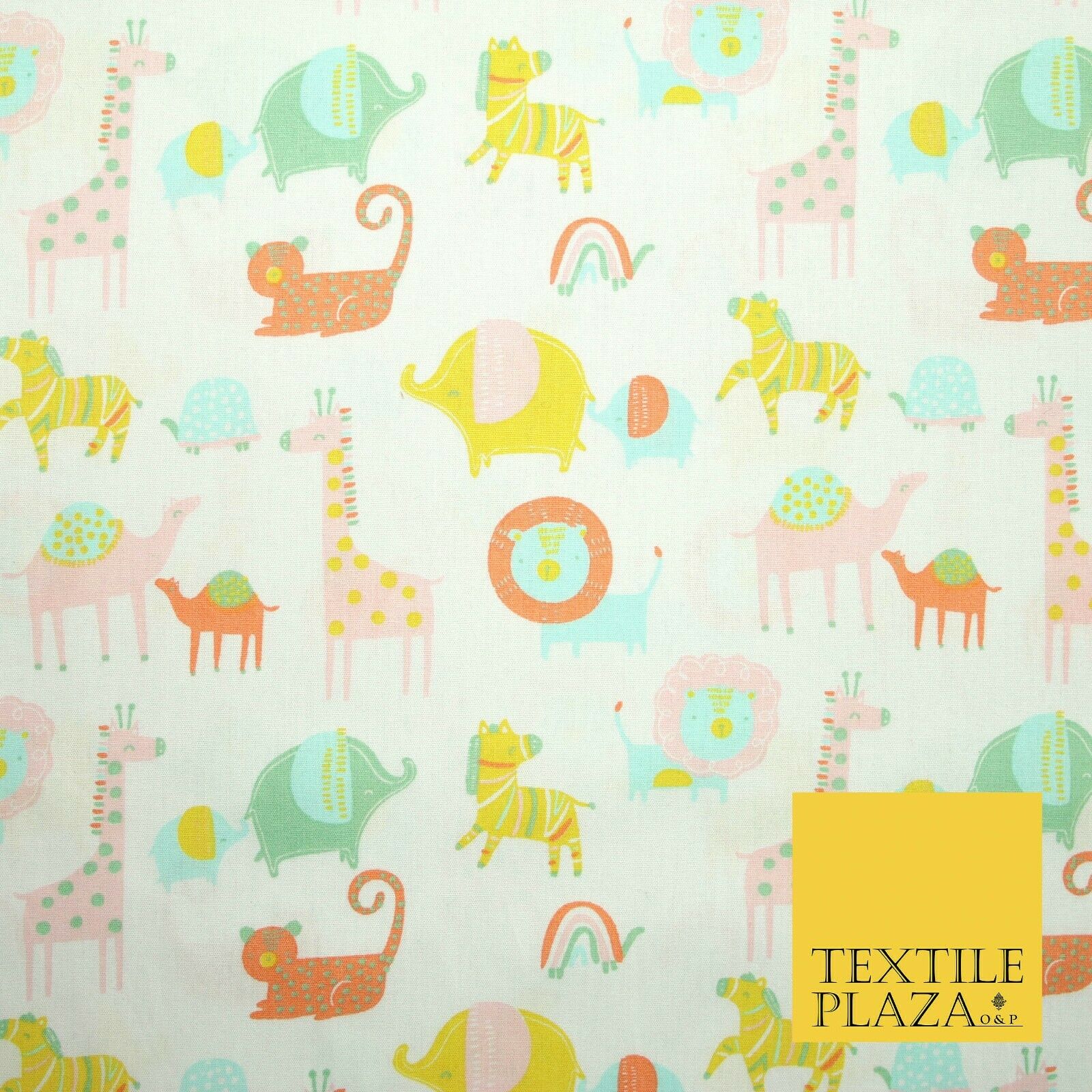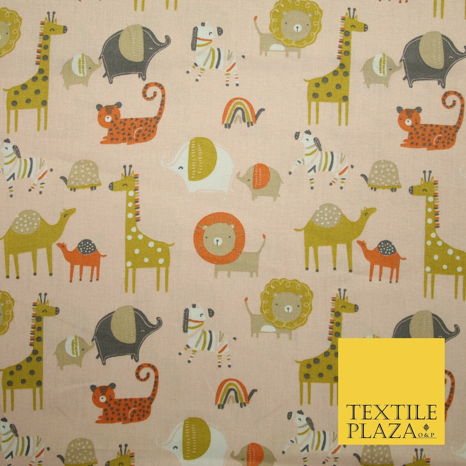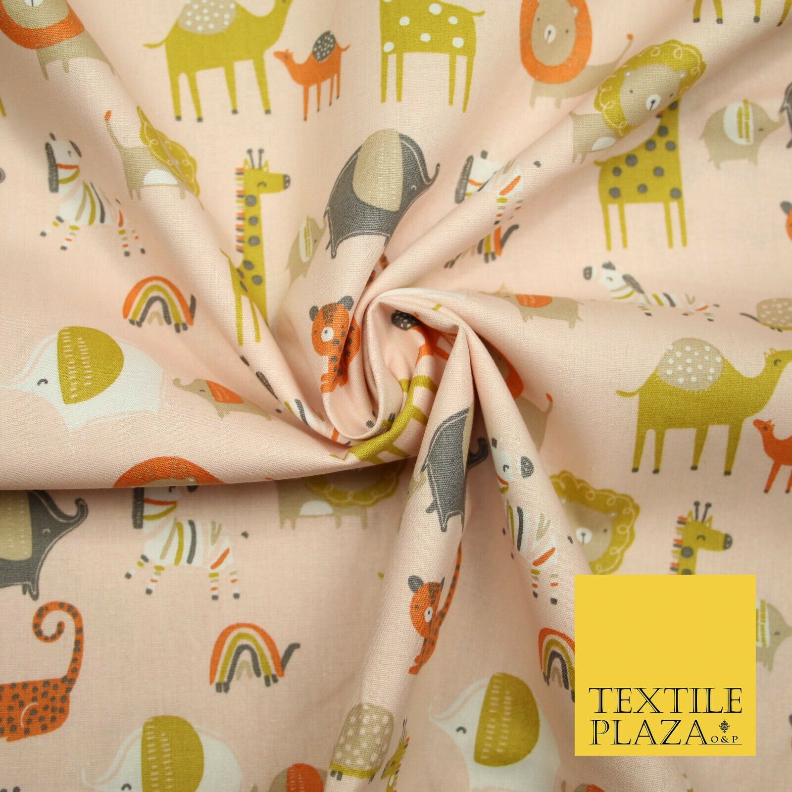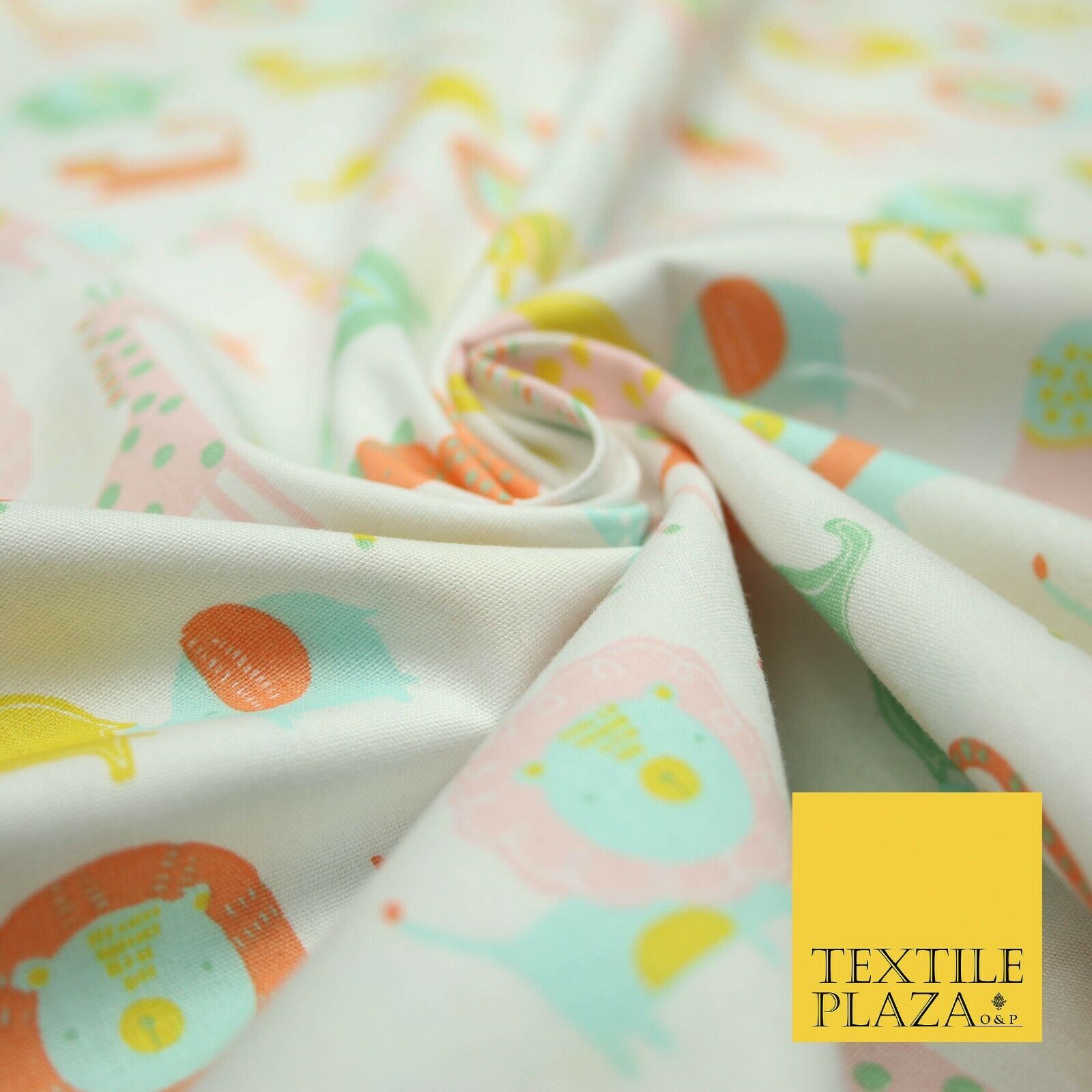 White Peach Fun Safari Animals Printed 100% ORGANIC COTTON POPLIN Fabric 58"
