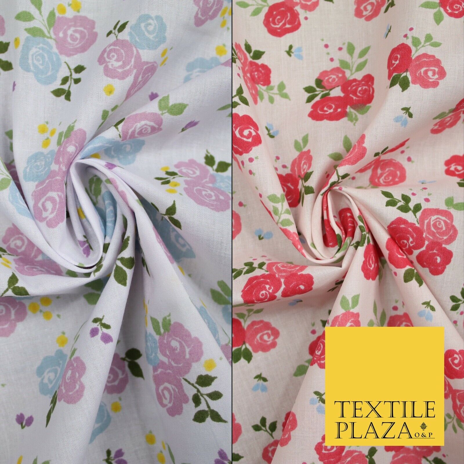 White Pink Flowers Lilac Blue Floral Bunch Printed Poly Cotton Fabric Polycotton