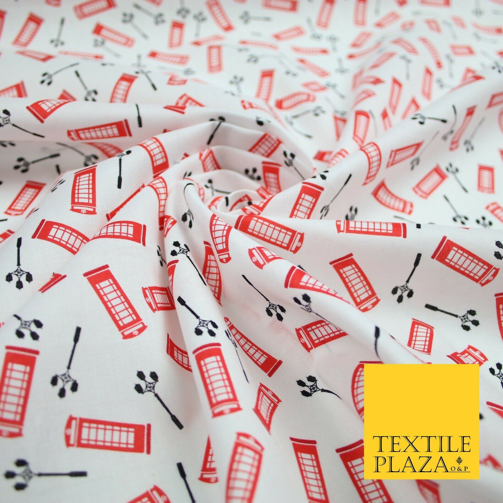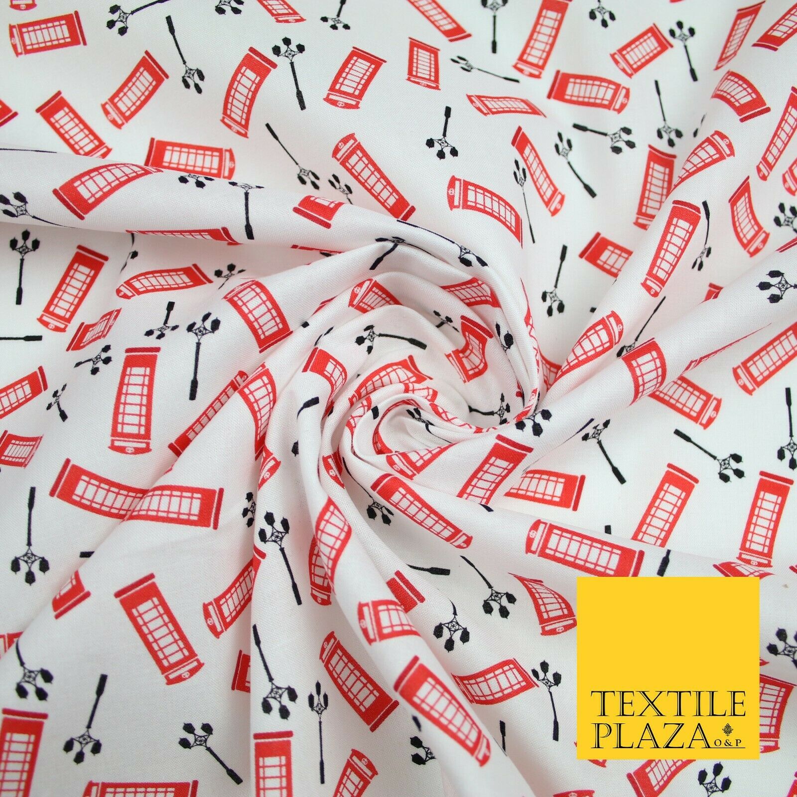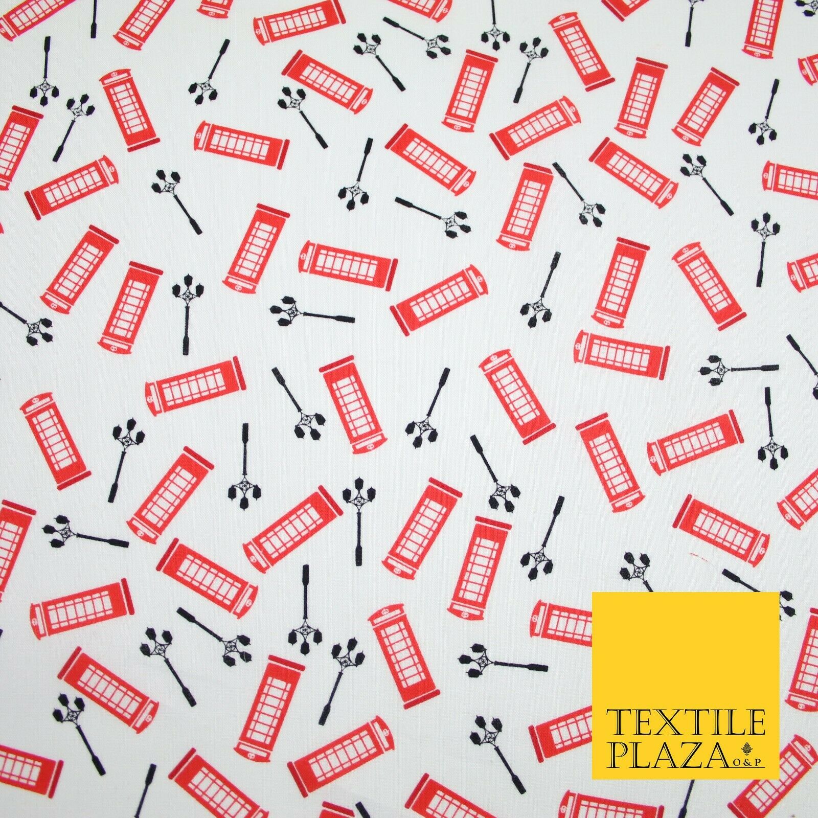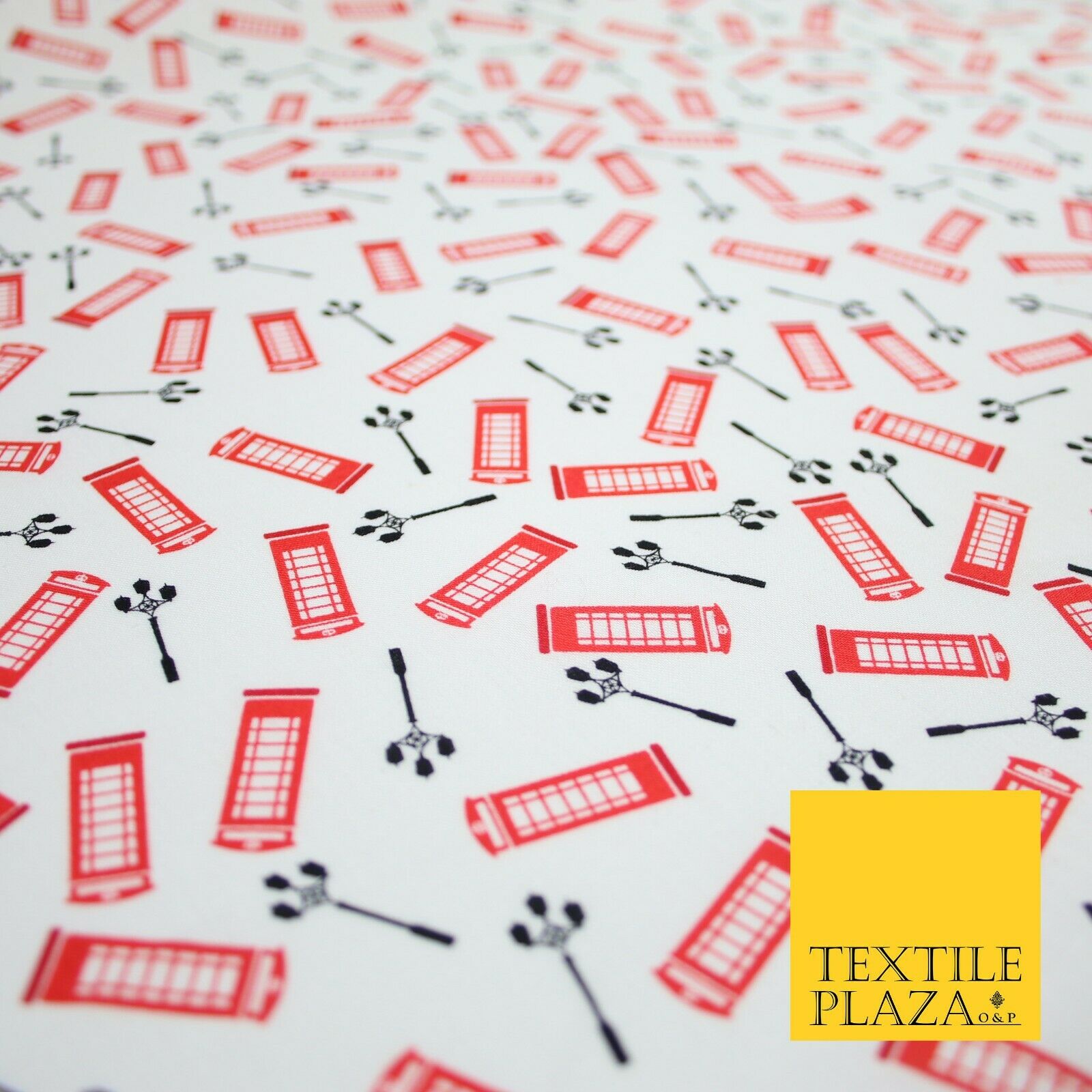White Red London Telephone Box Street Lights Printed 100% Cotton Fabric 54" 7076