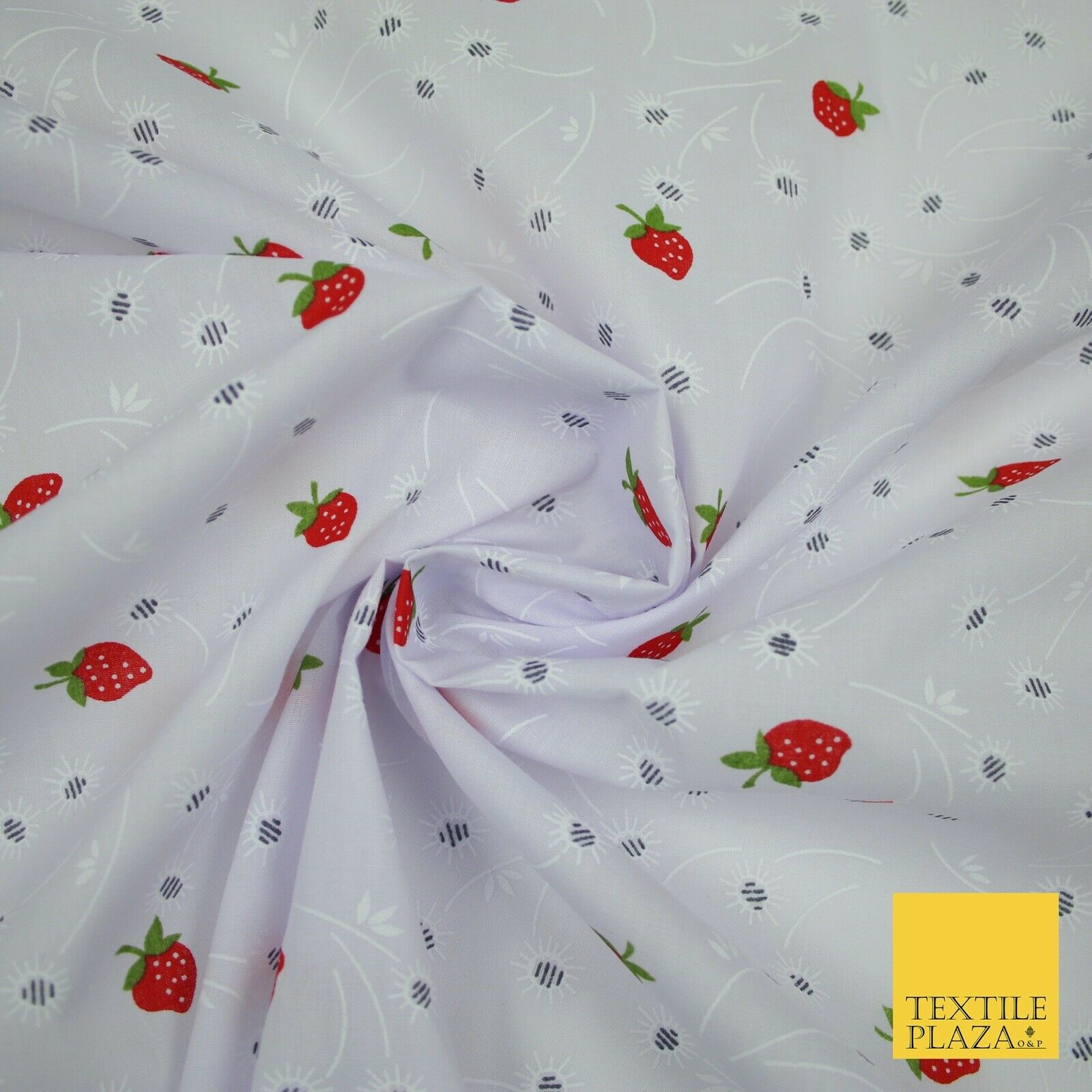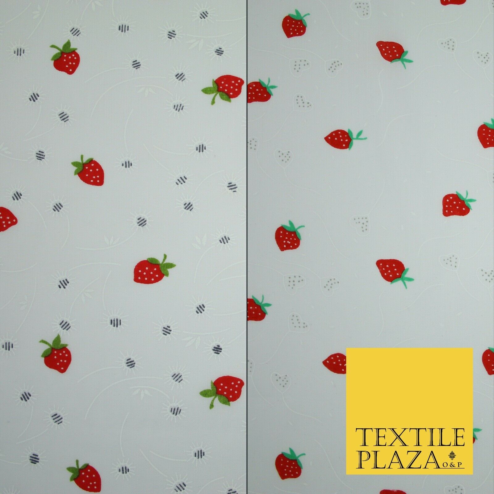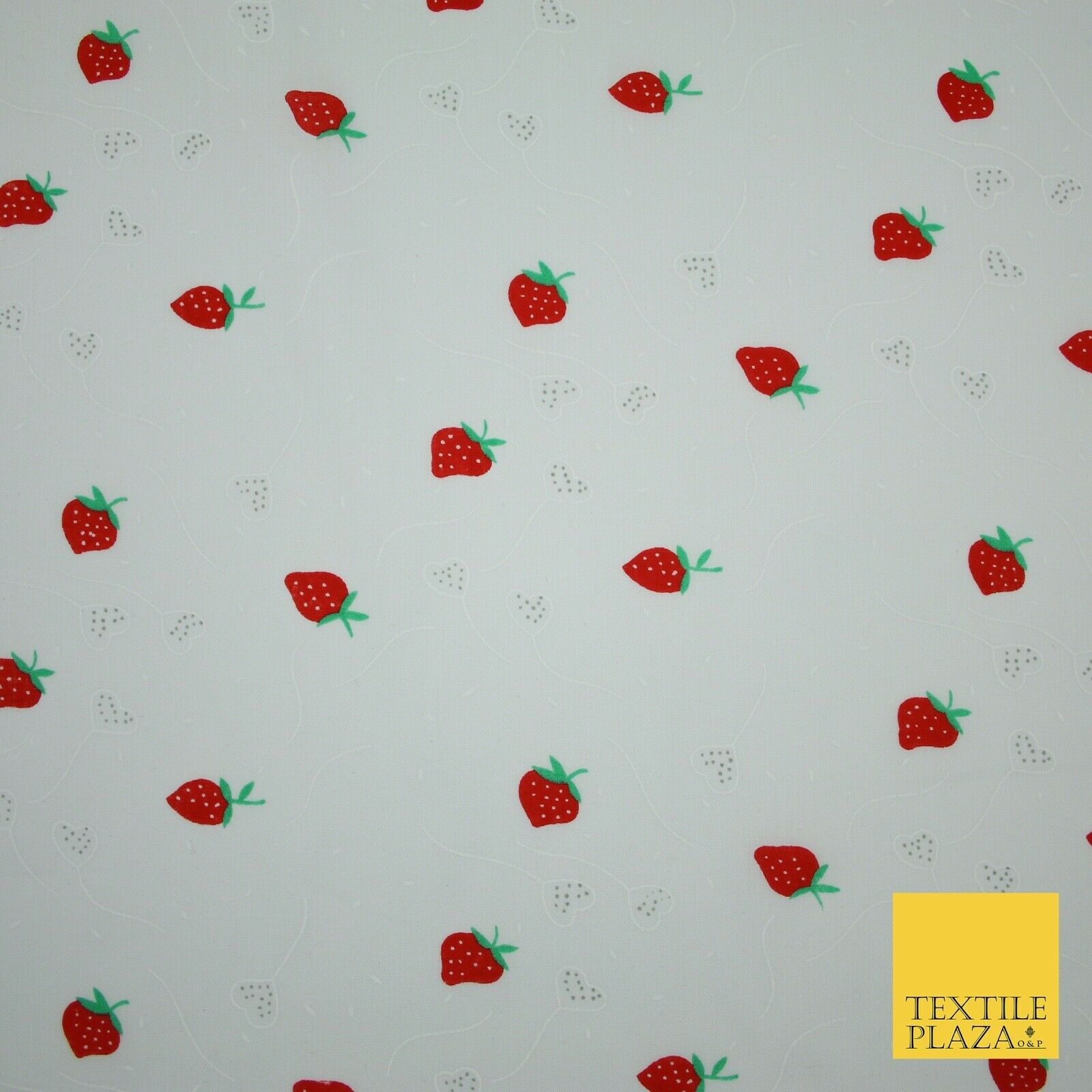 White Red Strawberry Flower Heart Printed Poly Cotton Fabric Polycotton Mask 45"