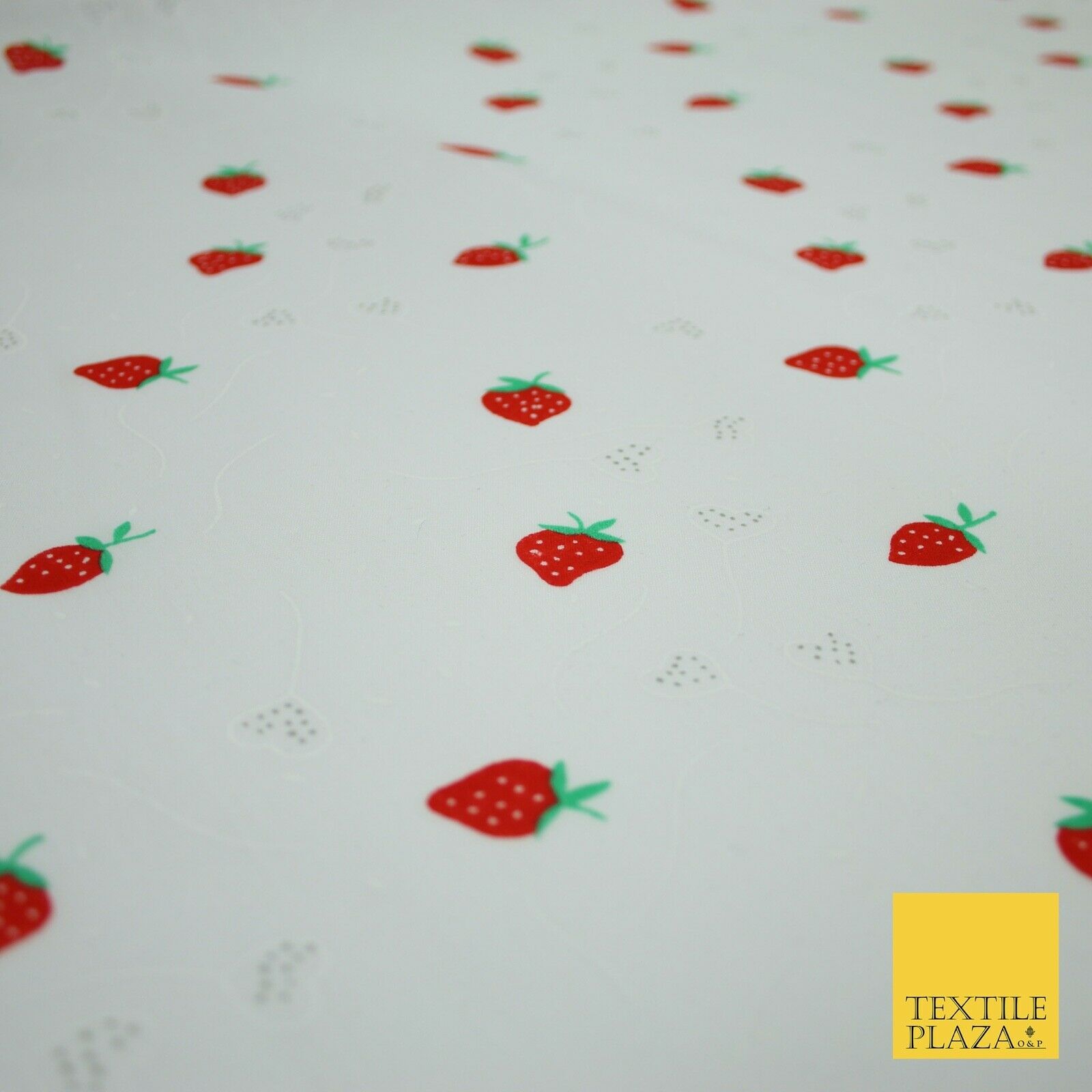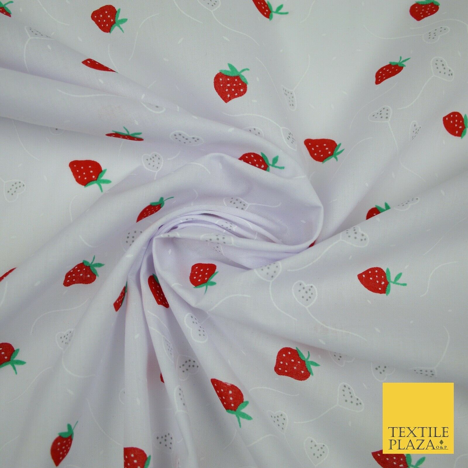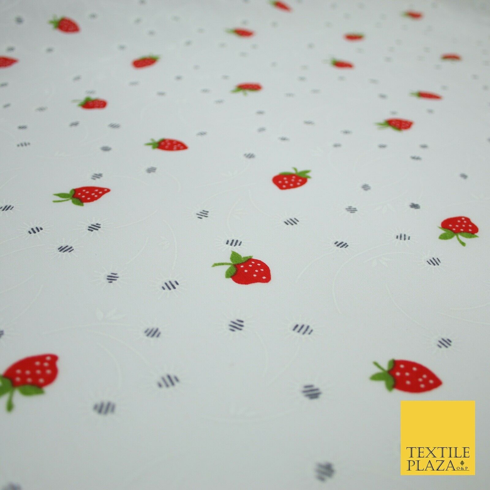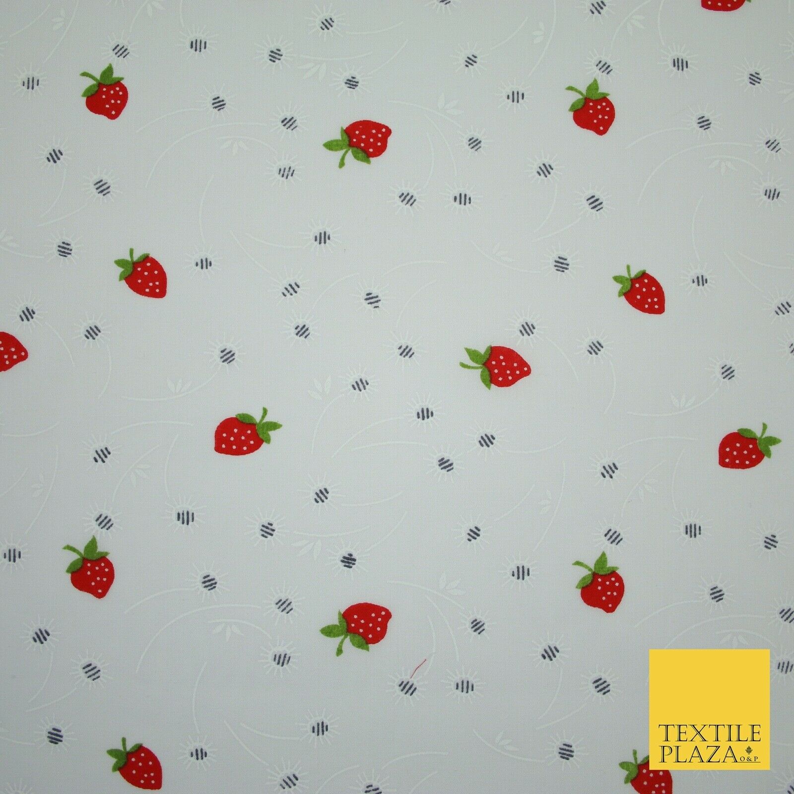 White Red Strawberry Flower Heart Printed Poly Cotton Fabric Polycotton Mask 45"