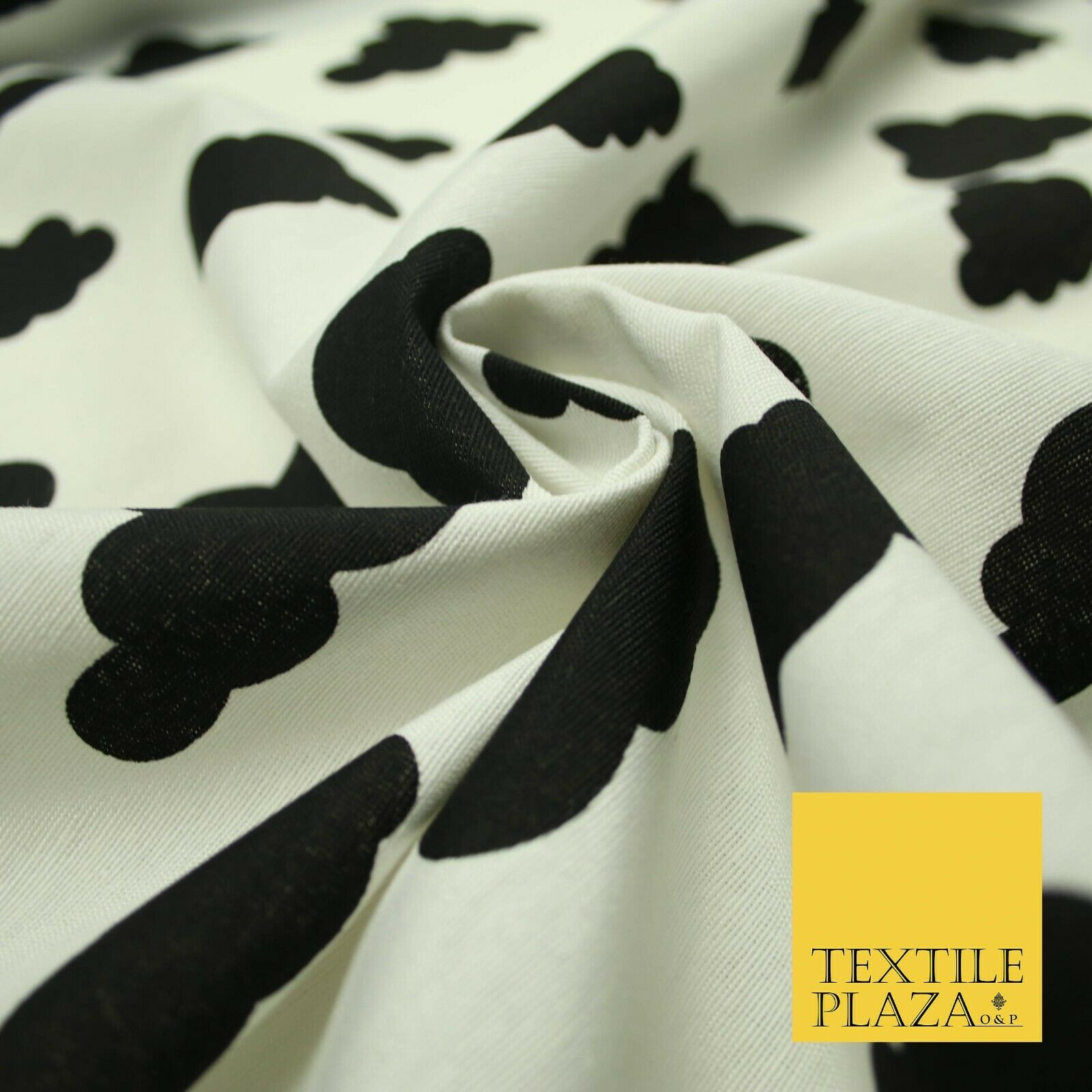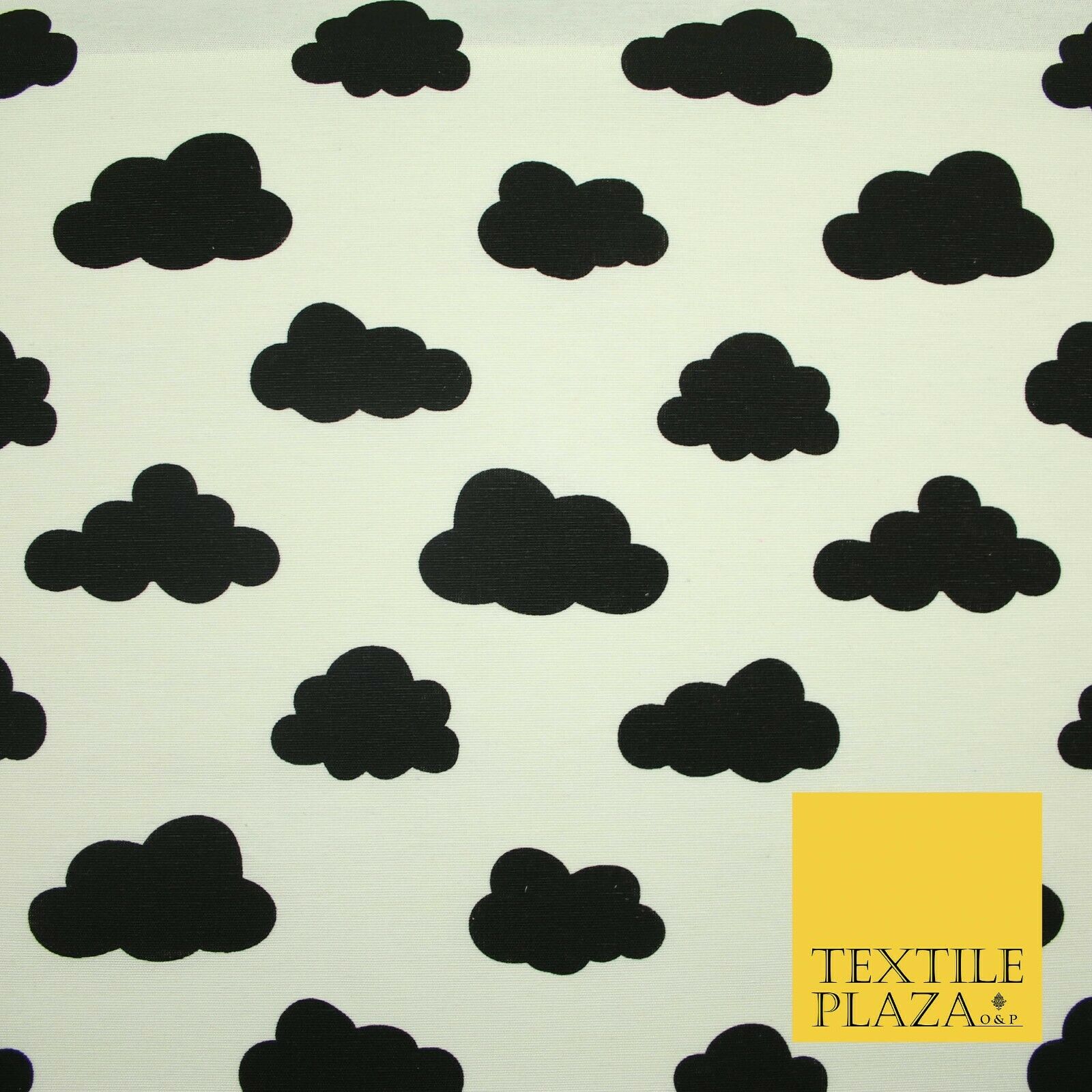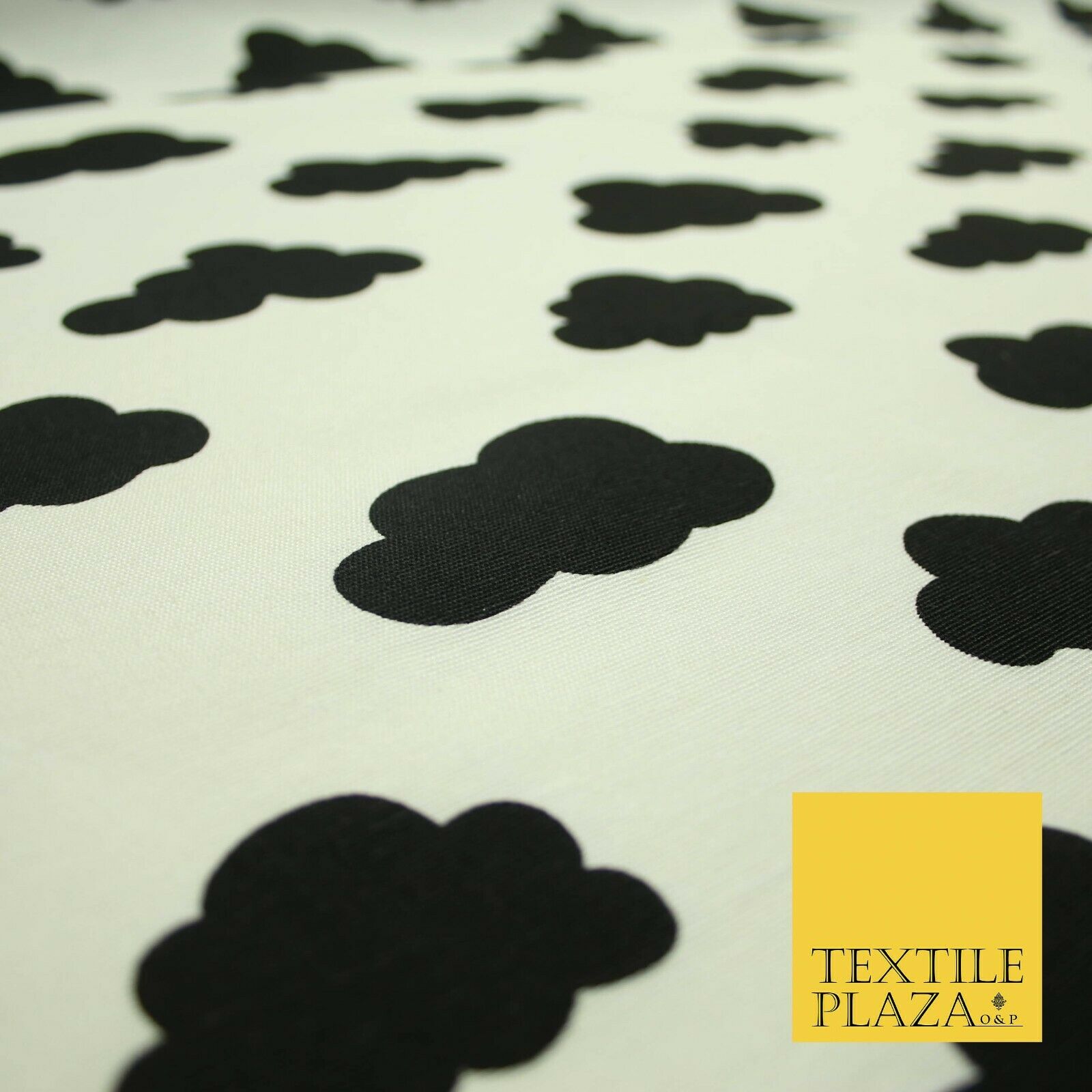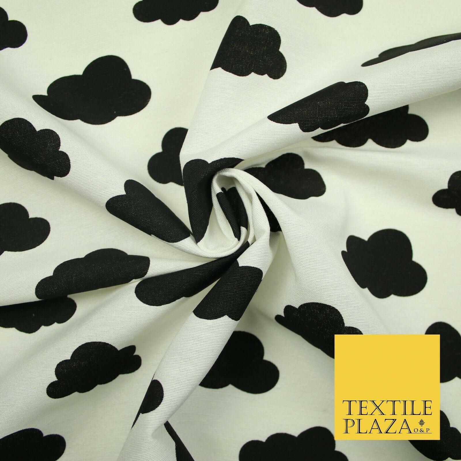 White with Black Dreamy Floating Clouds Printed Cotton Canvas Fabric 56" 4763