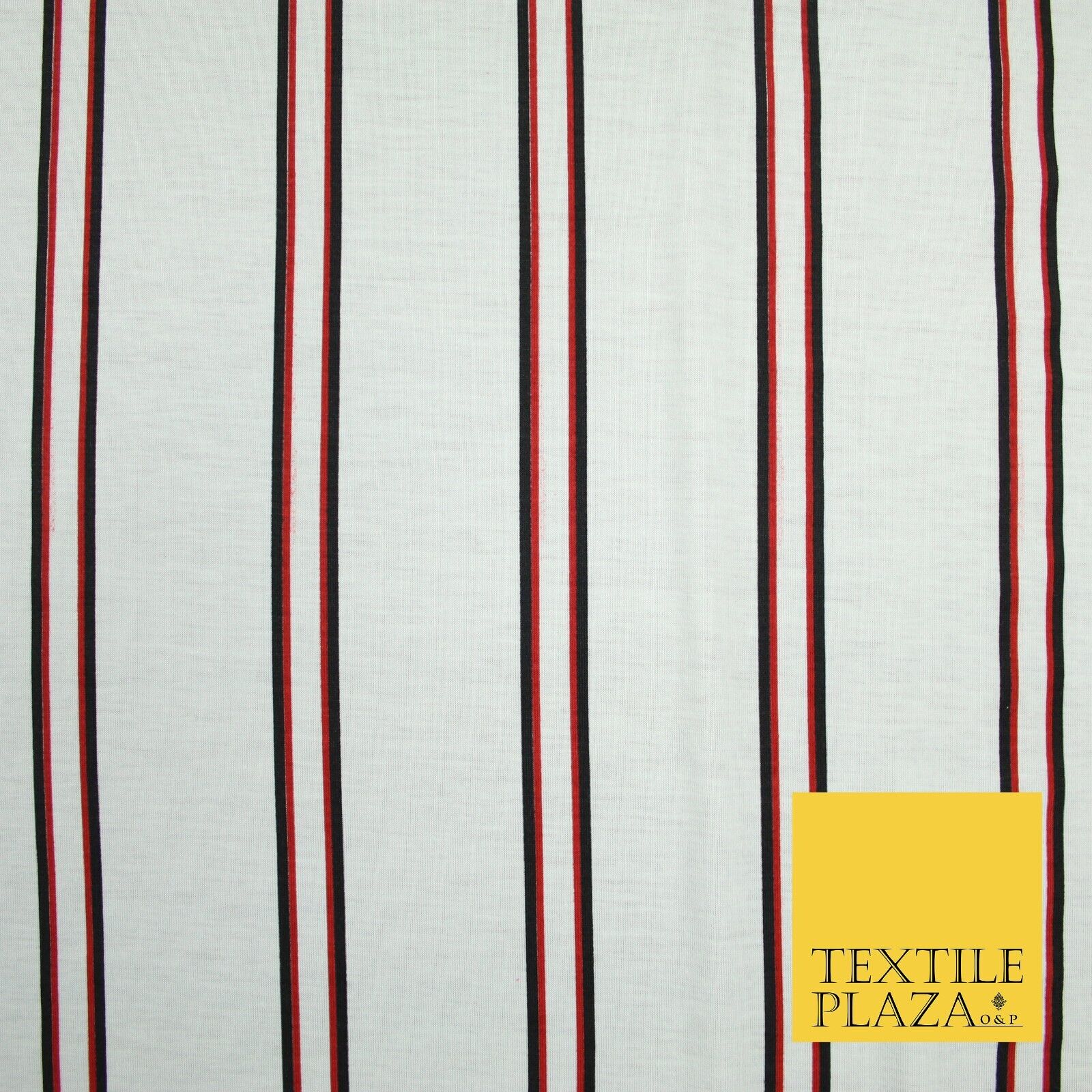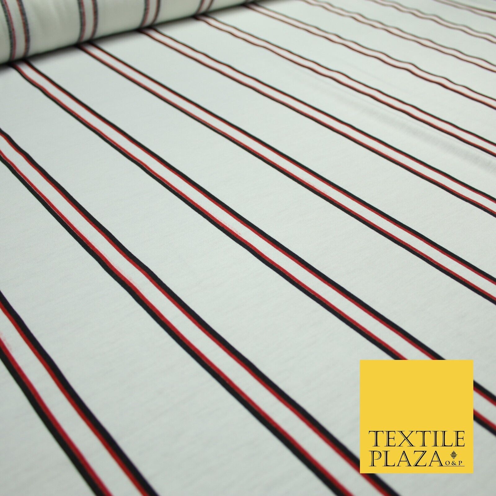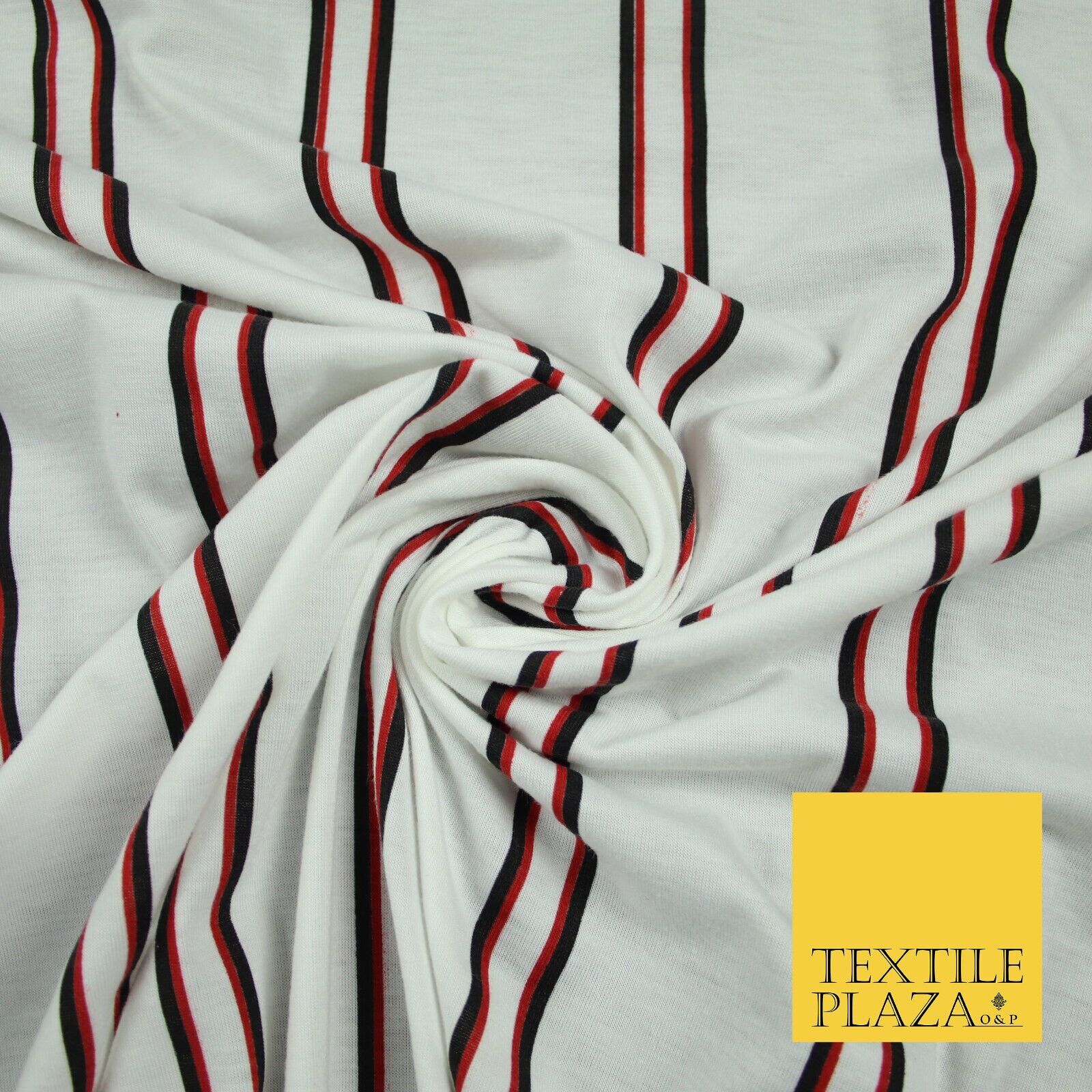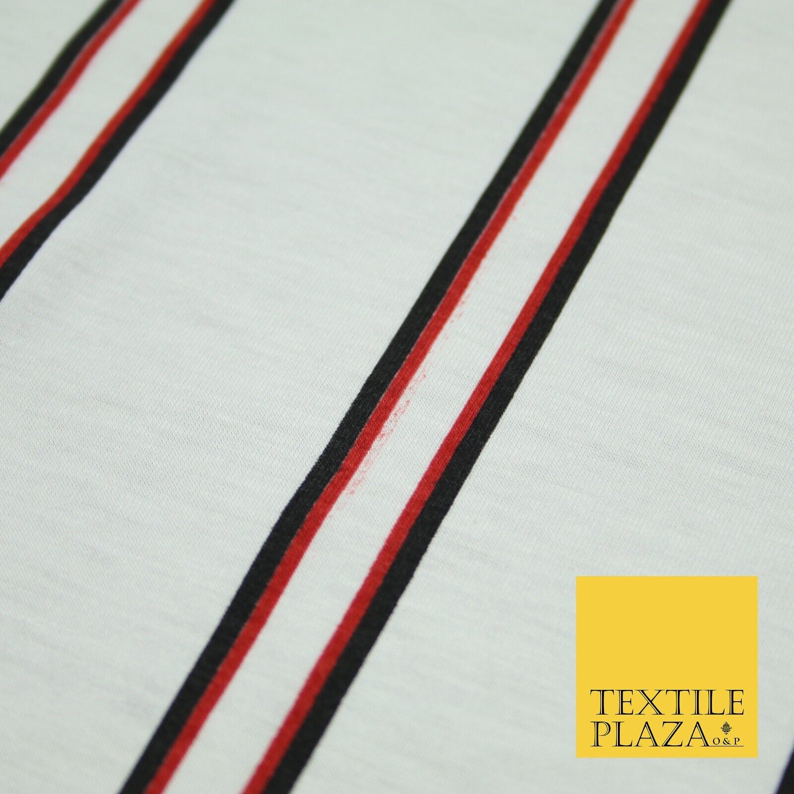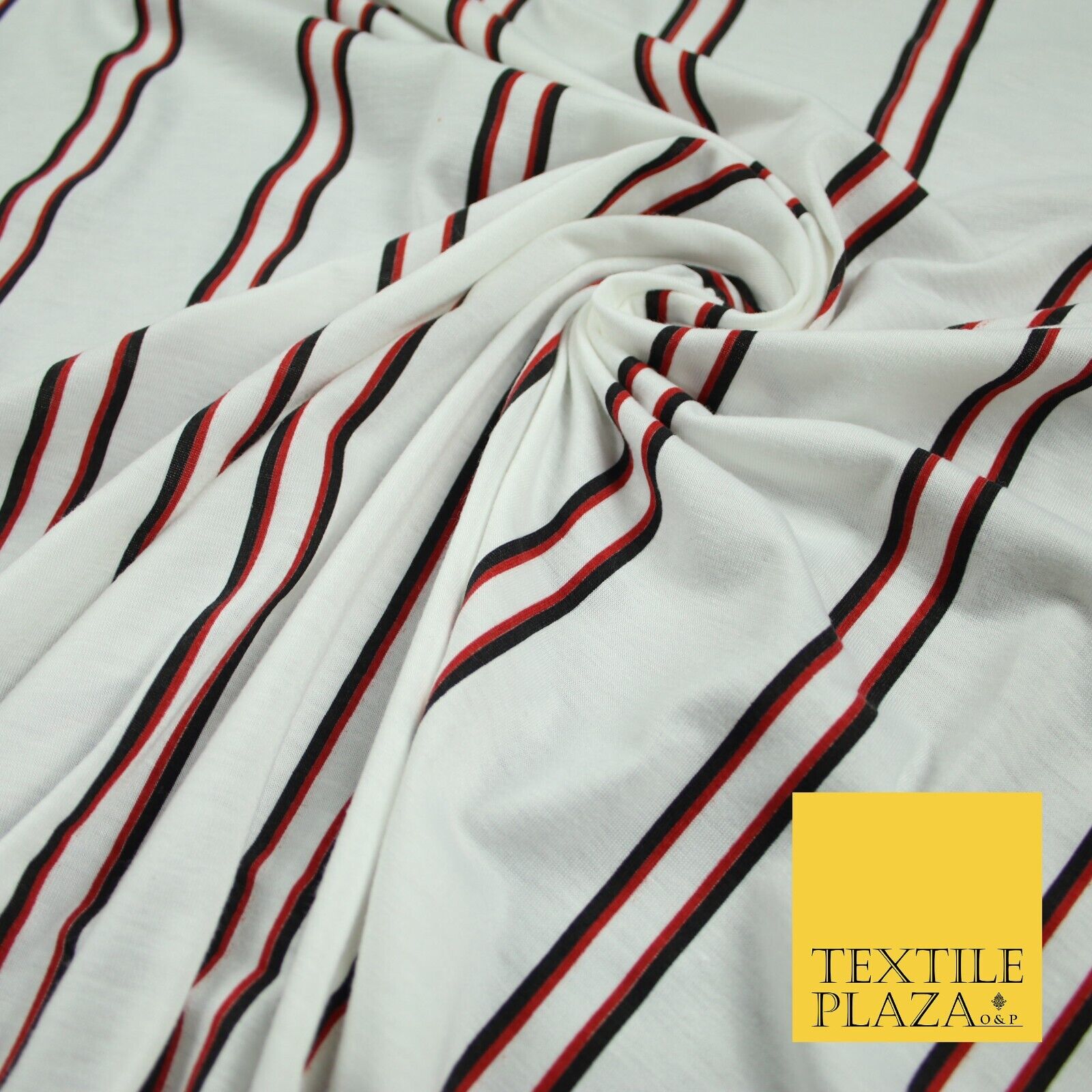 White with Black & Red Stripe Print Soft Touch Stretch Jersey Fabric 56" 6625