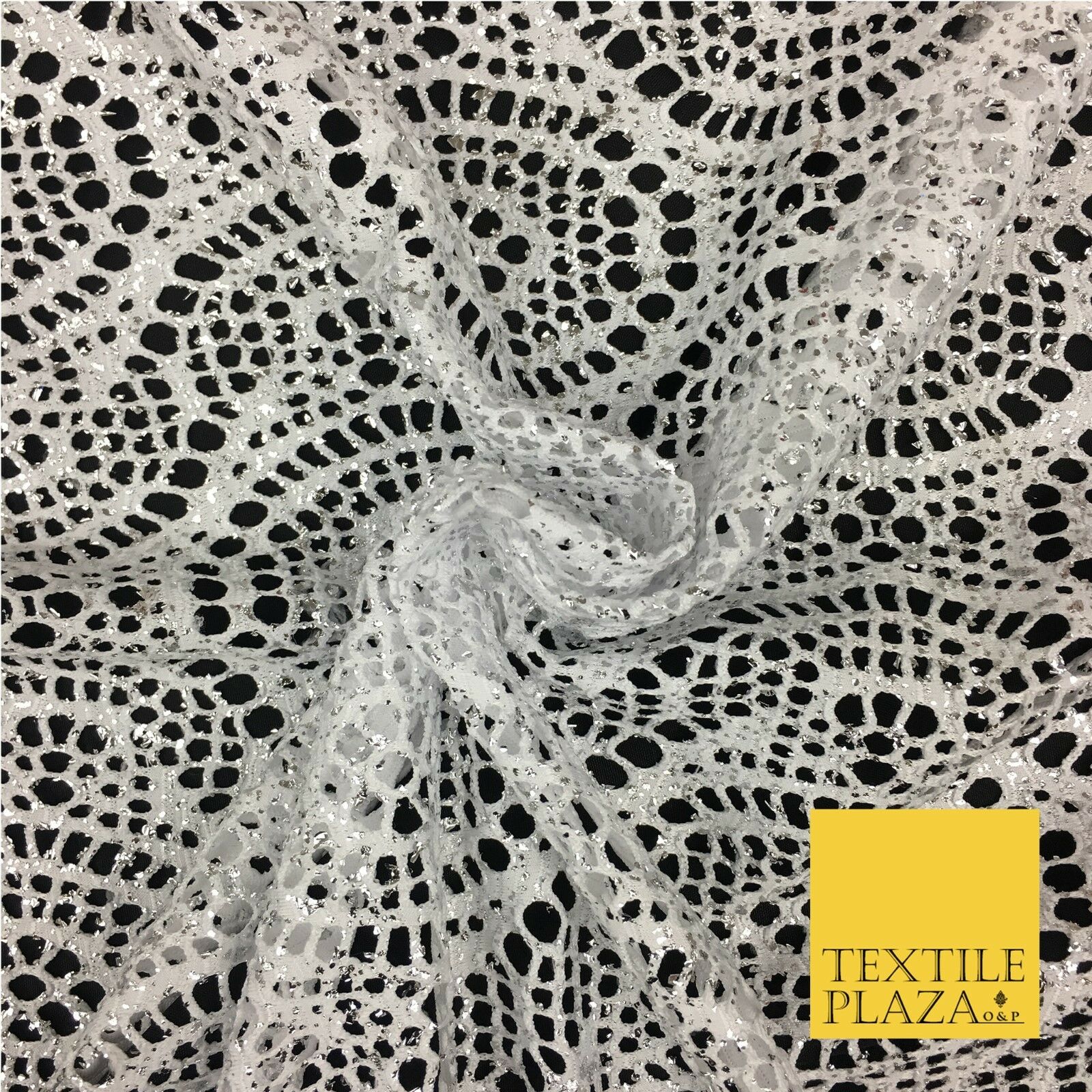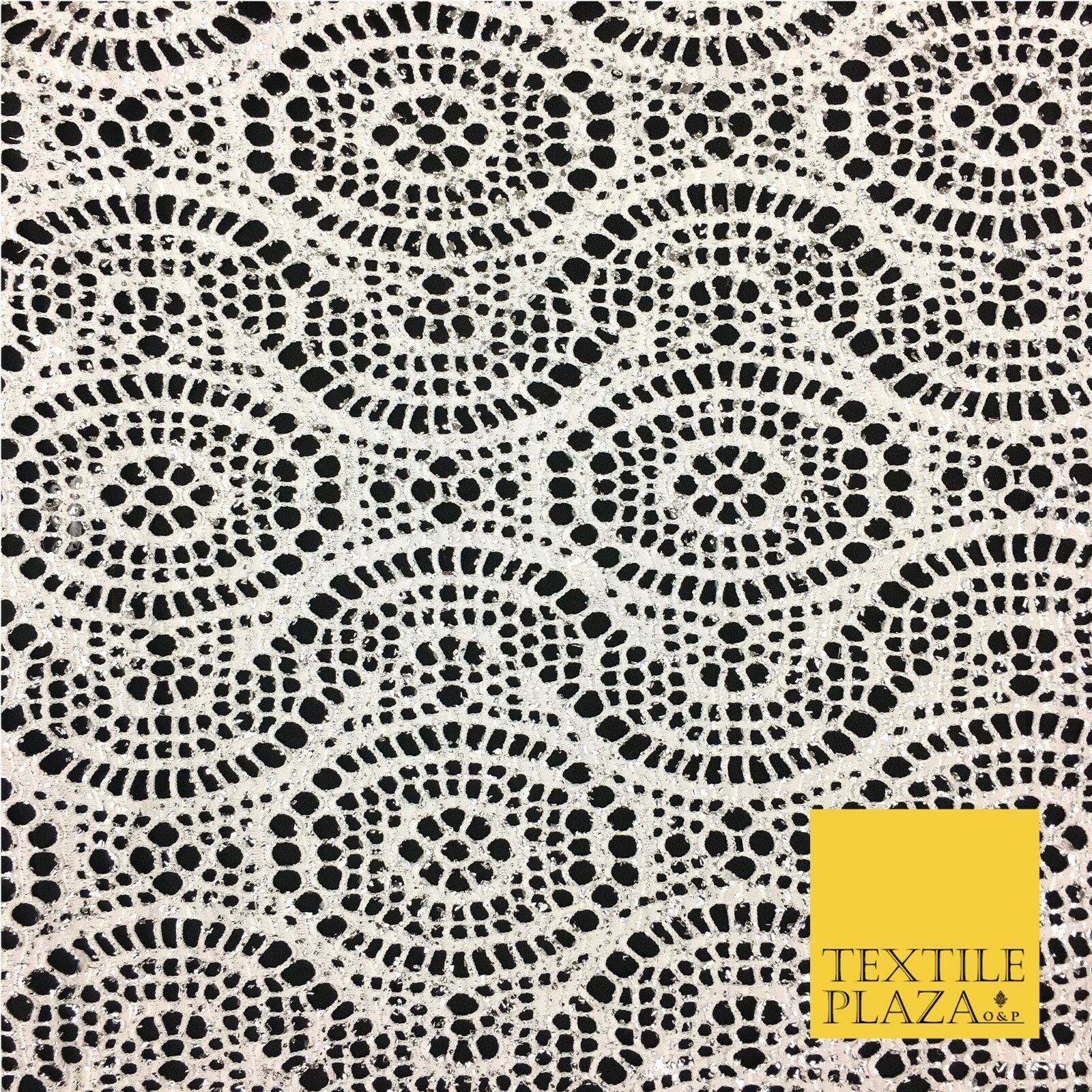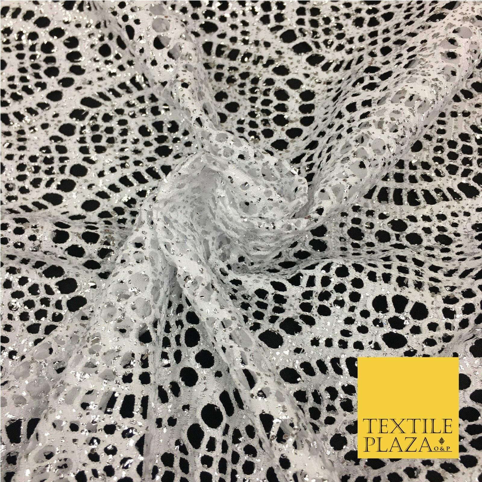 WHITE with Silver Foil Stretch Lace - Party Fabric Dress Fashion Material - 2313