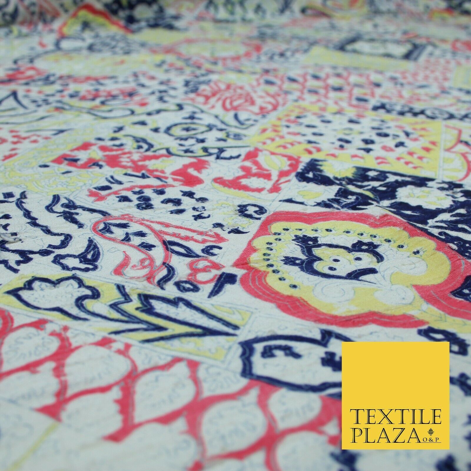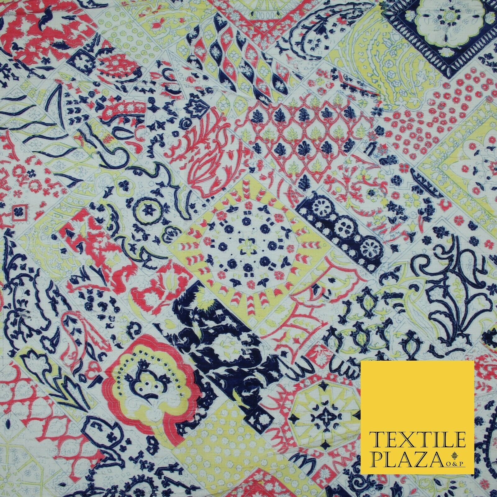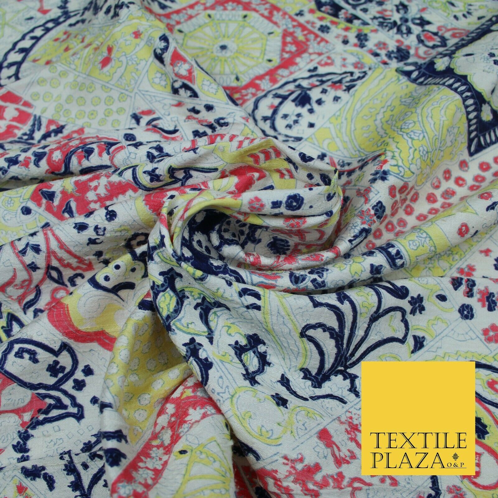 Yellow Patchwork Style Printed 100% PURE Dupion Silk Fabric Slub Handloom 1809