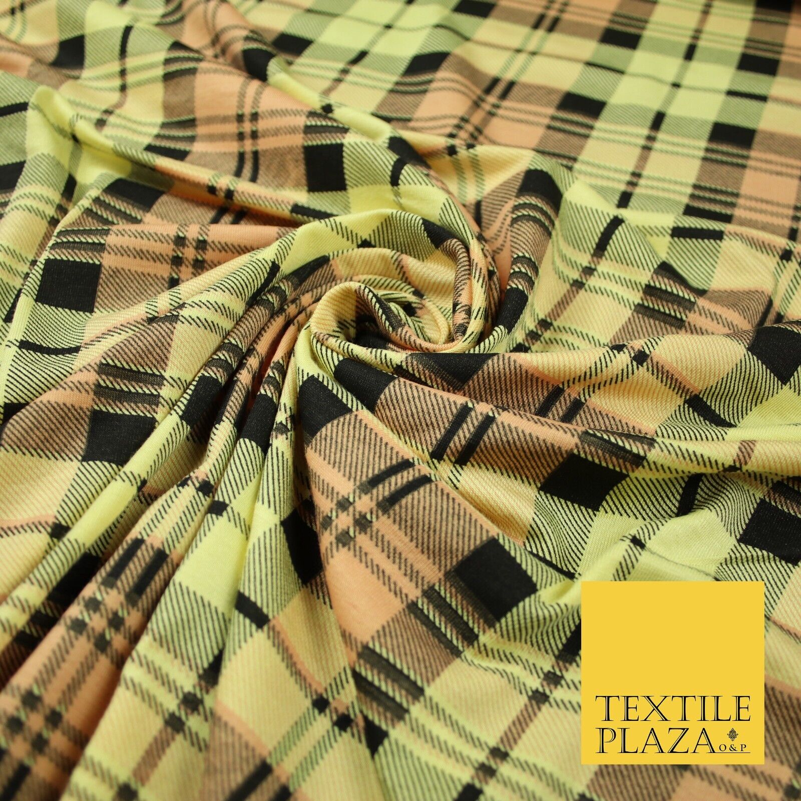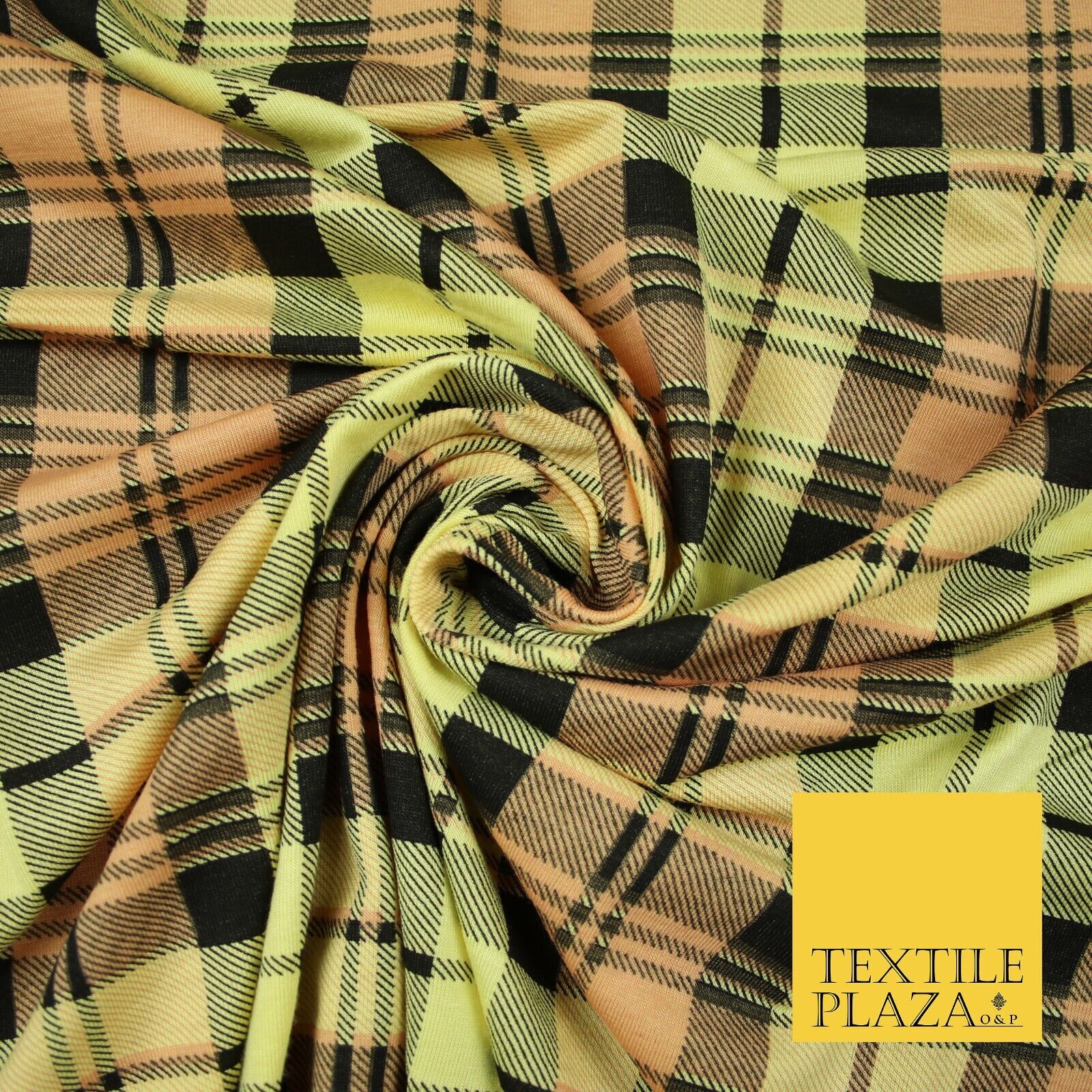Yellow Peach Black Check Tartan Print Soft Stretch Jersey Fabric 56" 6594